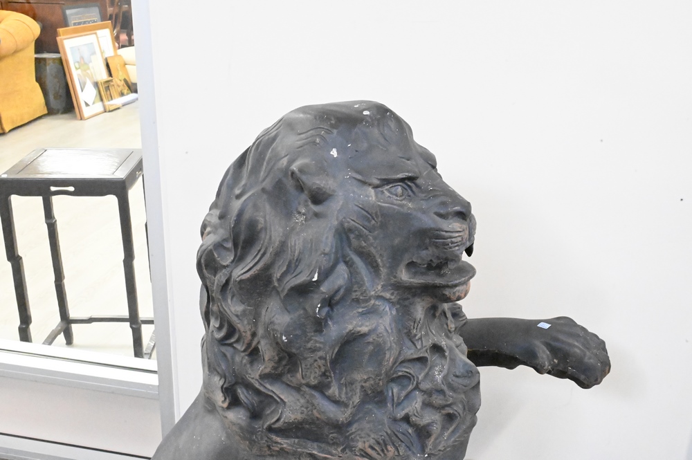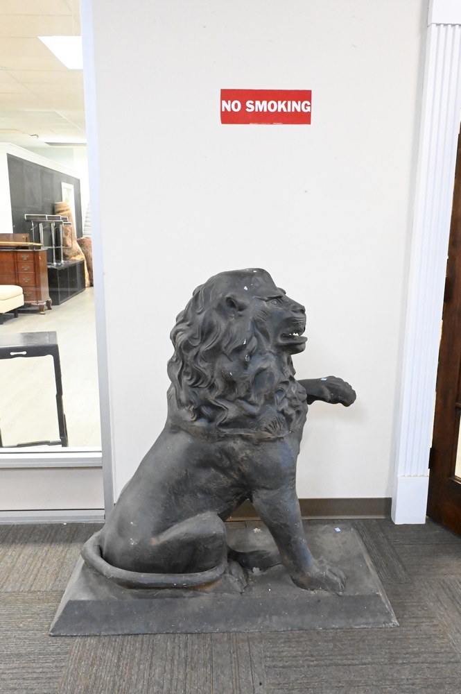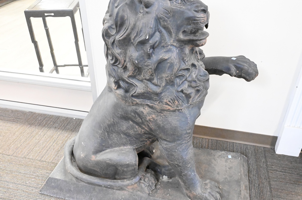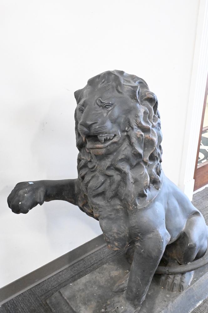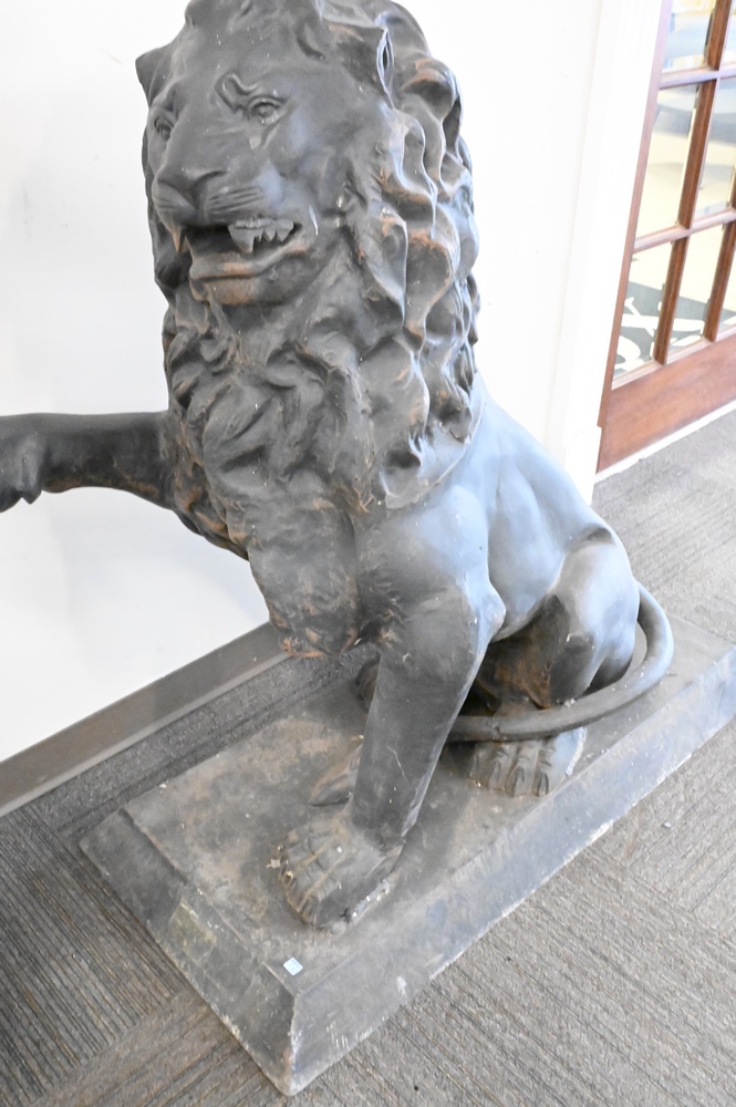 Lot 251: Pair of Metal Lion Figures on Rectangular Bases, each with one paw raised, height 48 inches, 21″ x 46″.