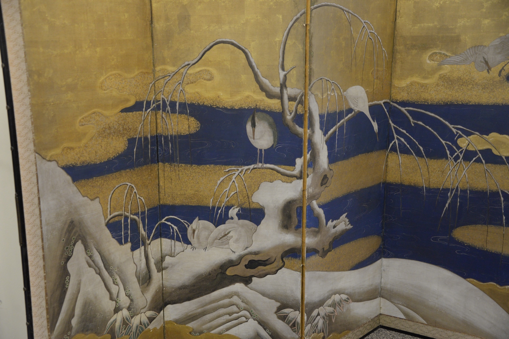 Six-Fold Gilt and Polychrome Painted Floor Screen, depicting herons and willows along a snow covered bank, on paper, probably 18th century, height 60 inches, approximate width 148 inches. Provenance: The Estate of Alan Gans, Mulberry Point, Guilford.