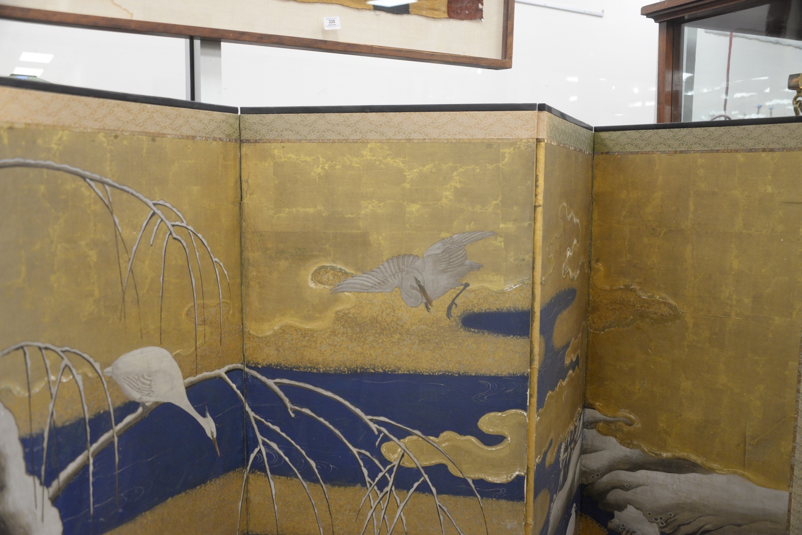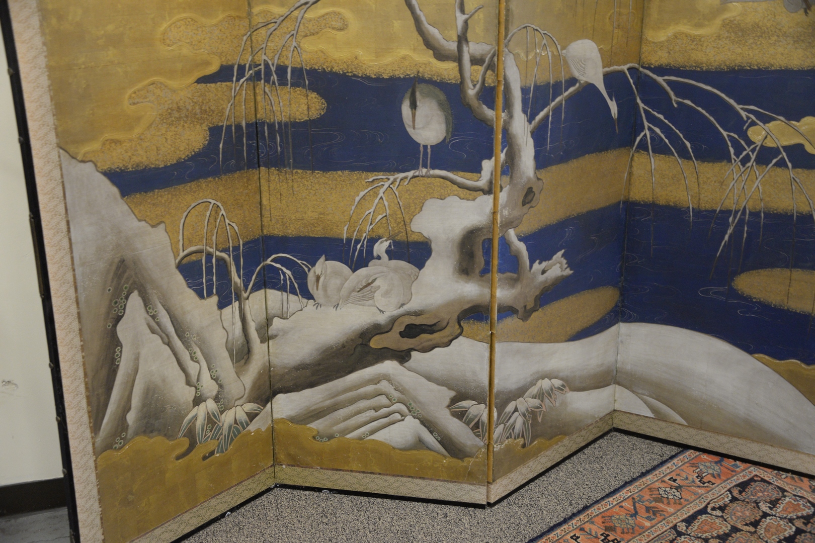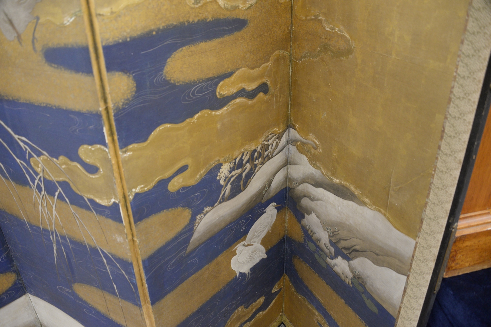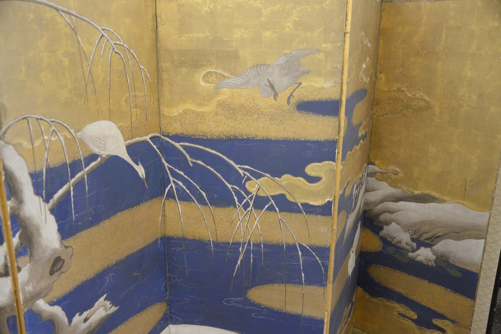 Lot 251: Six-Fold Gilt and Polychrome Painted Floor Screen, depicting herons and willows along a snow covered bank, on paper, probably 18th century, height 60 inches, approximate width 148 inches. Provenance: The Estate of Alan Gans, Mulberry Point, Guilford