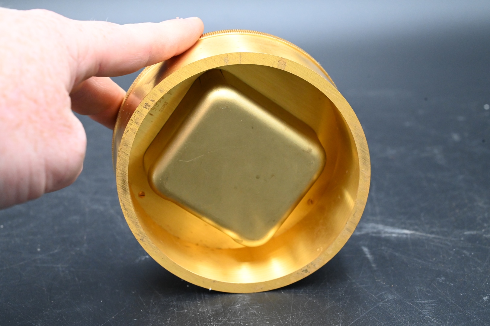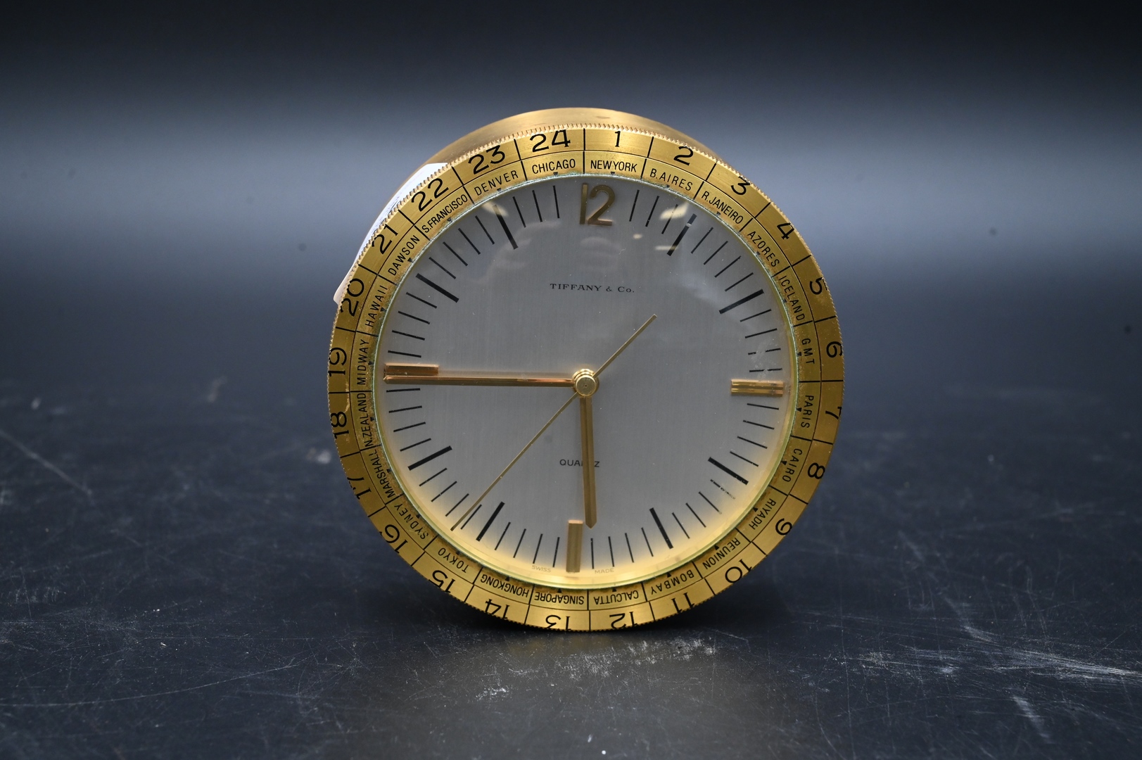 Tiffany and Company World Travel Desk Clock, frame having cities throughout the world, with rotating time zone, depth 4 1/2 inches.