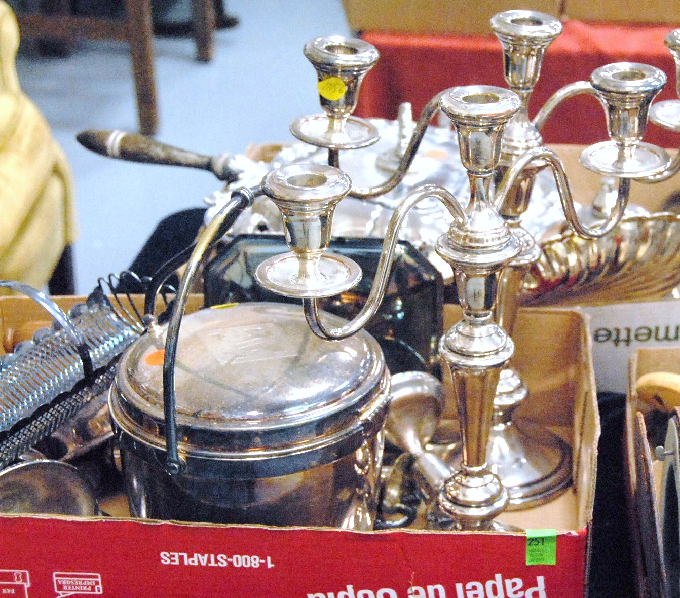 Two box lots of silver plate including a large Sheffield silver plated server.