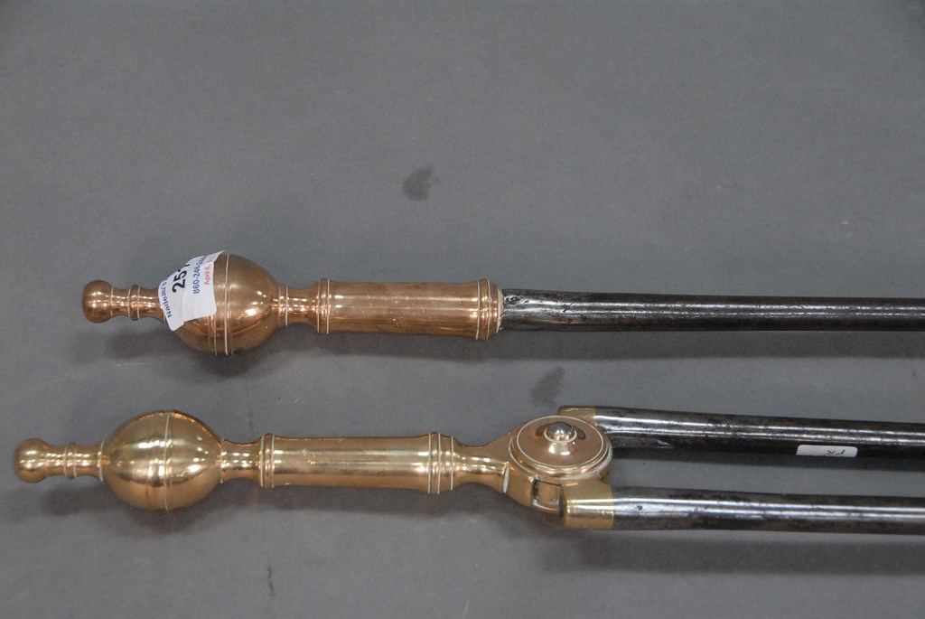 Two early fire tools: shovel and tongs, one bell metal the other brass.