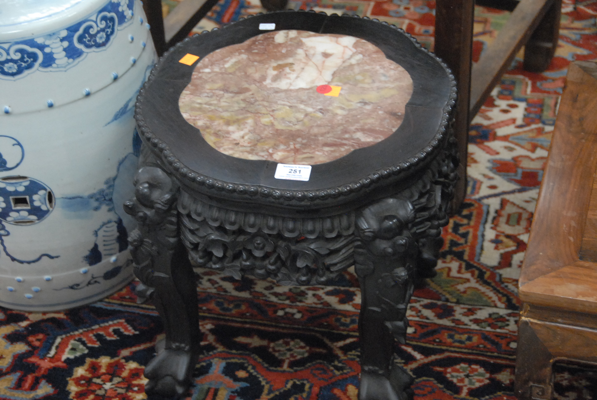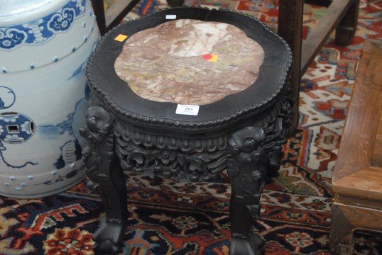 Lot 251: Two hardwood taborets, both with russet marble inlaid tops and heavily carved openwork aprons with ball-and-claw legs, China, 19th century lobed top lose. ht. 16in. and 18in.