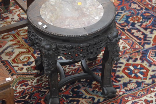 Two hardwood taborets, both with russet marble inlaid tops and heavily carved openwork aprons with ball-and-claw legs, China, 19th century lobed top lose. ht. 16in. and 18in.