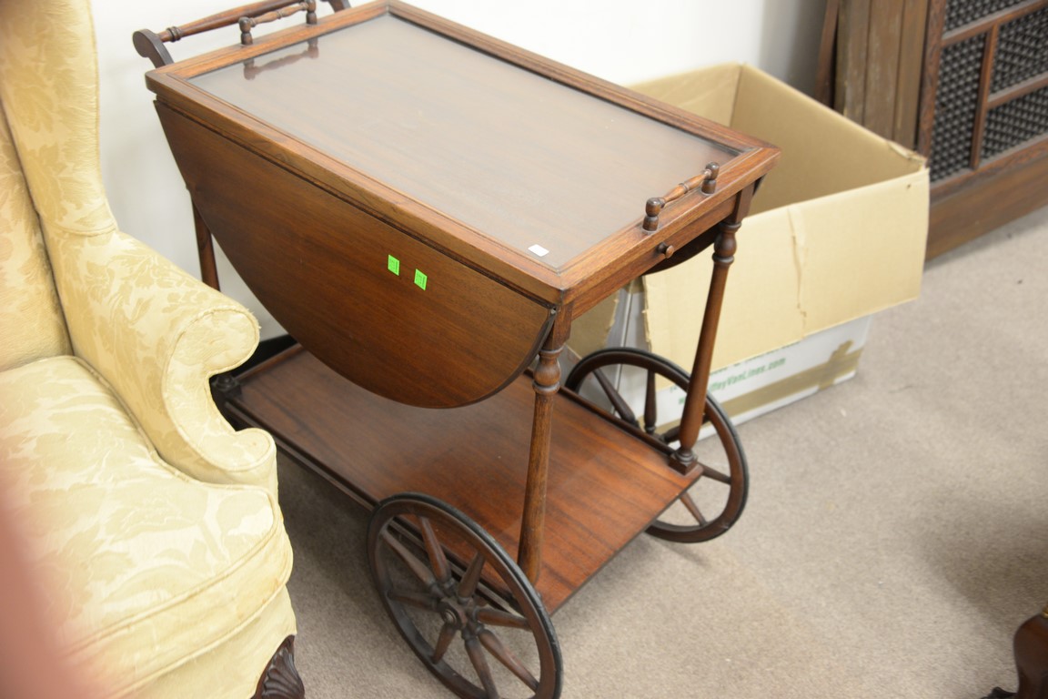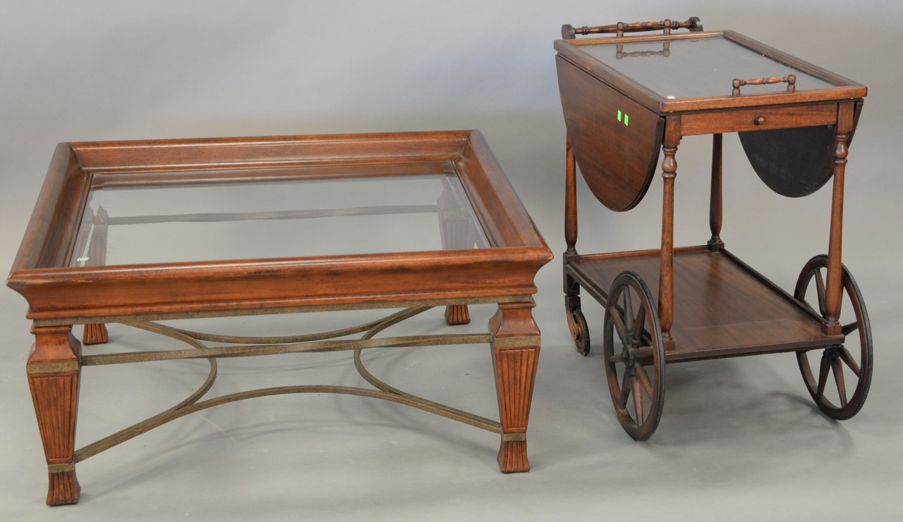 Two piece lot to include mahogany coffee table with glass top top: 40 x 40 and a mahogany tea cart.
