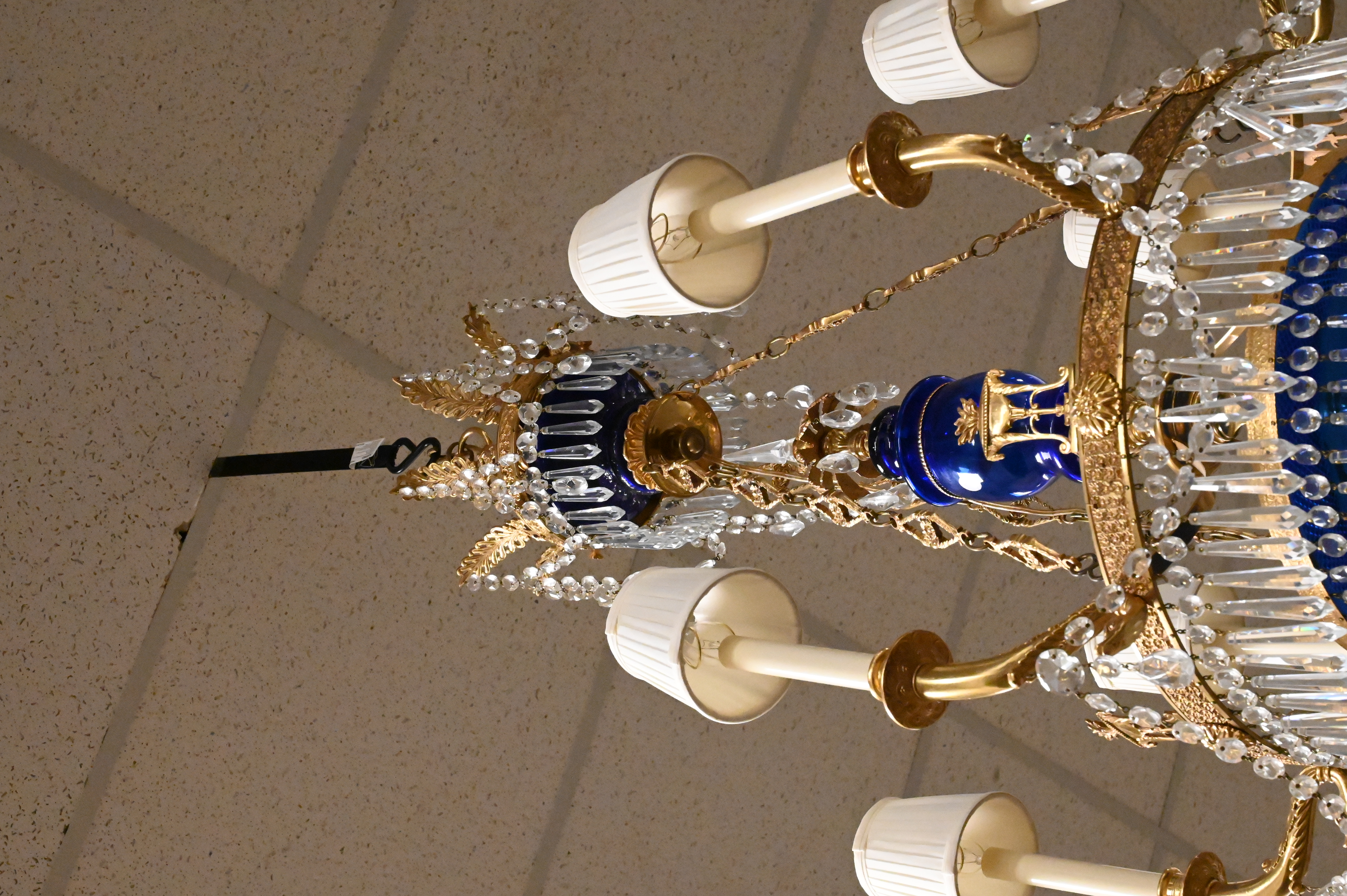 Lot 251A: Empire Style Gilt Metal Cobalt Glass and Cut Glass Six Light Chandelier