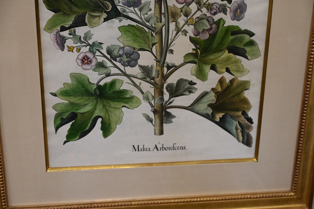 After Basilius Besler (German, 1561 – 1629), Malau Arborescens, circa 1613, engraving hand coloring on paper, sight size 19″ x 15 1/2″.