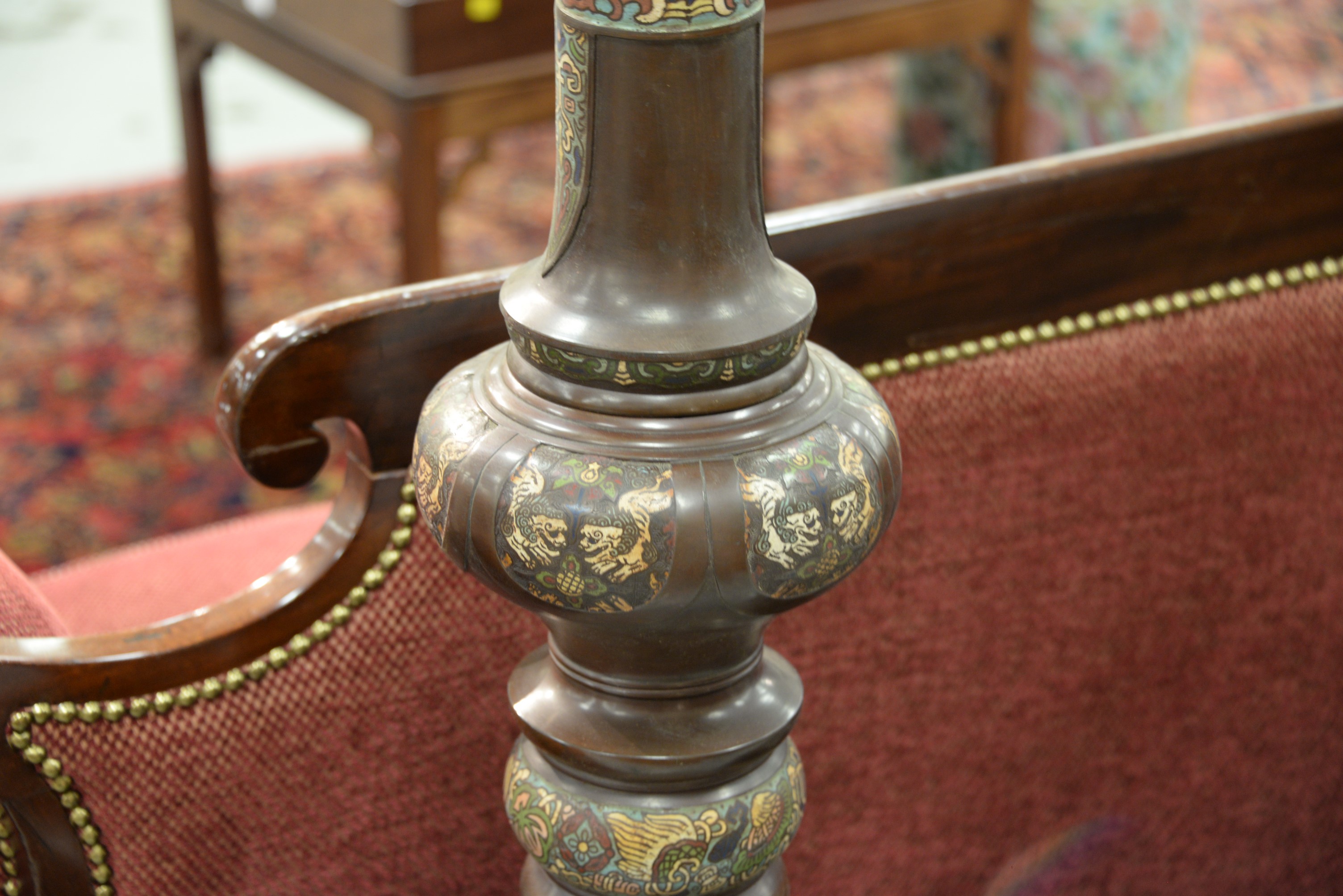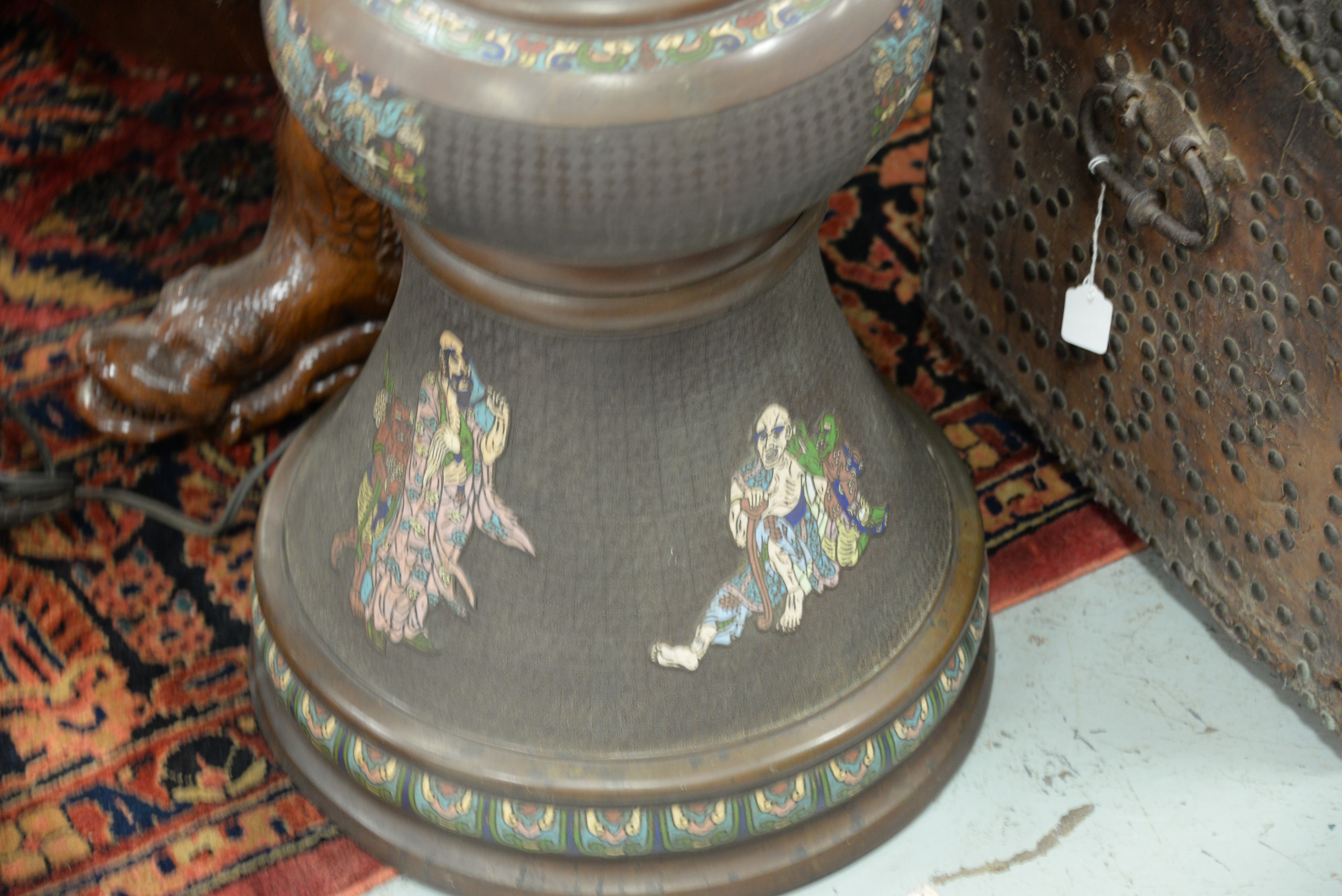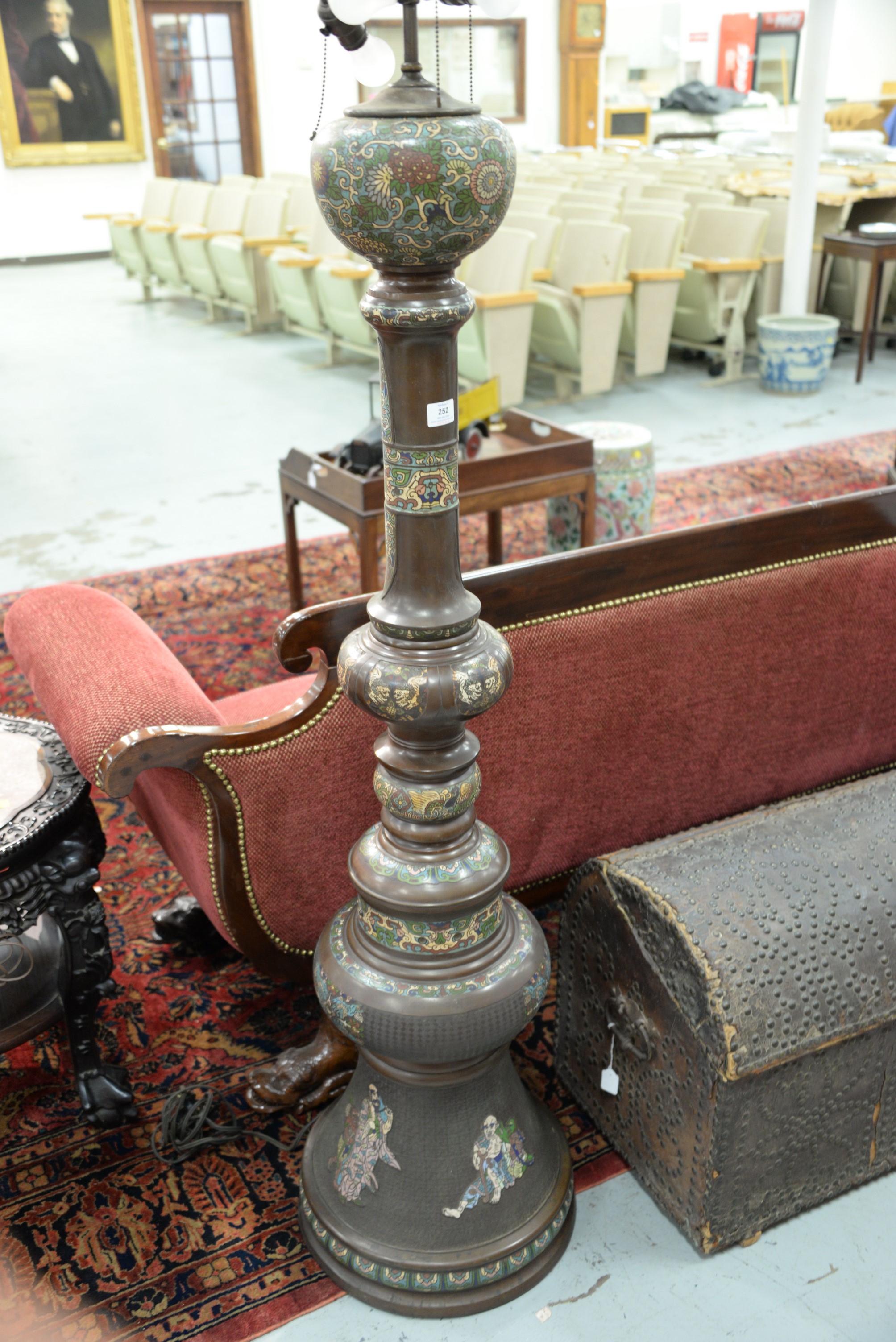 Lot 252: Champleve bronze floor lamp having scrolling flowers and Oriental geometric design body above four immortal figures on the base. …