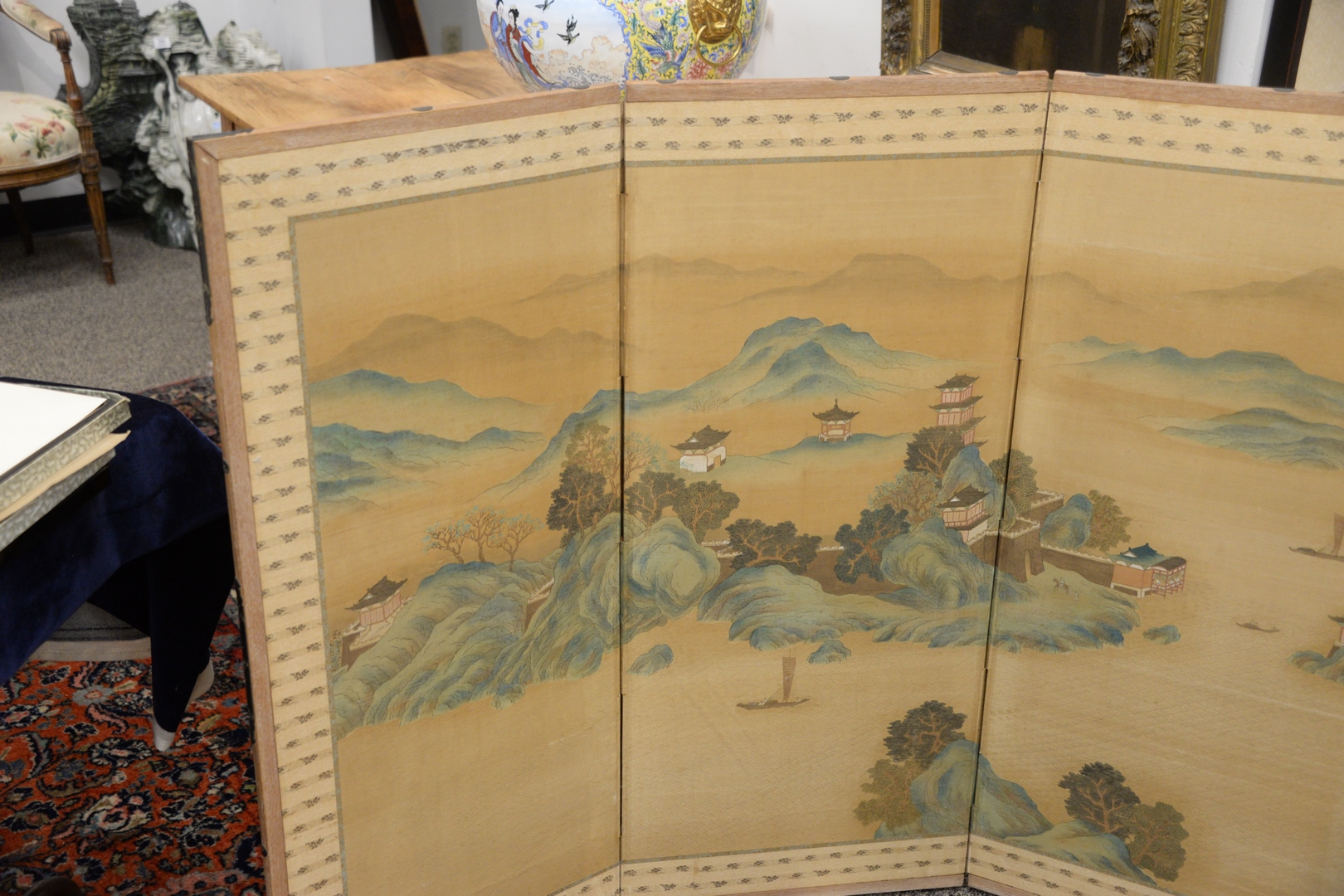 Chinese Four Panel Silk Screen with hand-painted landscapes mounted in an elmwood frame,height 42 1/2 inches, width 74 inches.