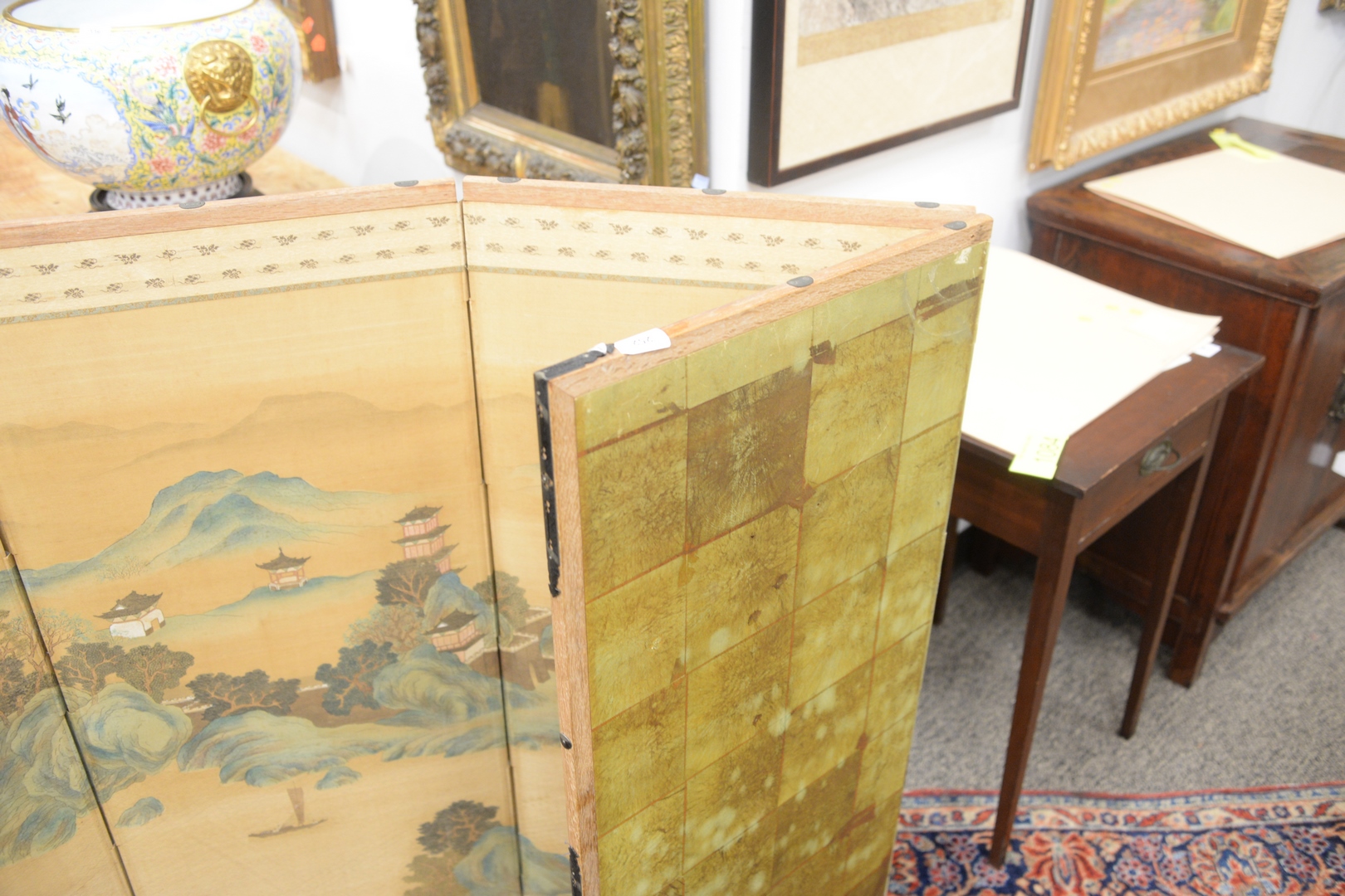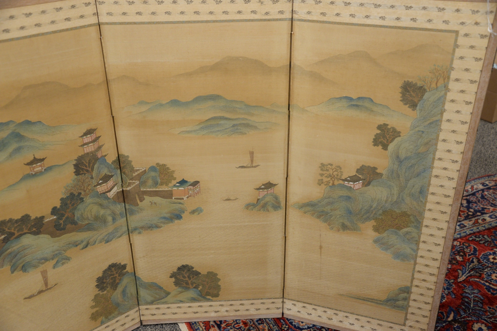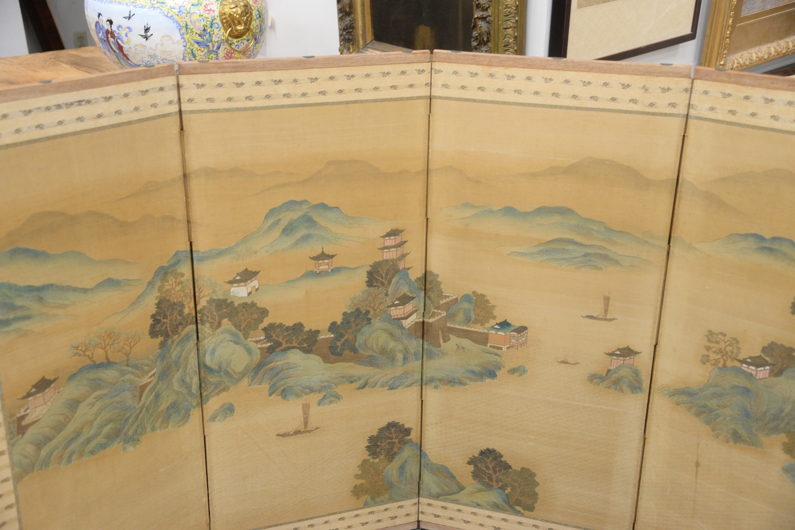 Lot 252: Chinese Four Panel Silk Screen with hand-painted landscapes mounted in an elmwood frame,height 42 1/2 inches, width 74 inches.