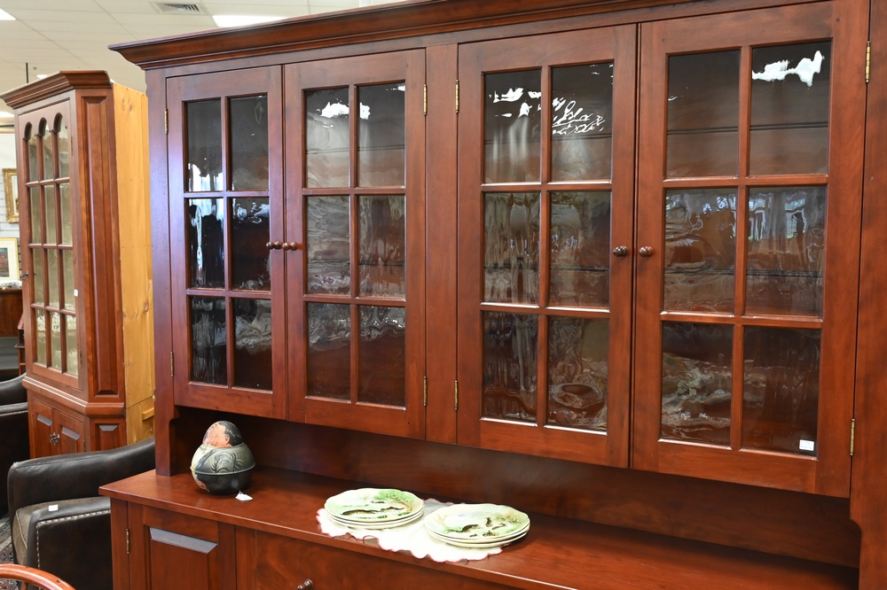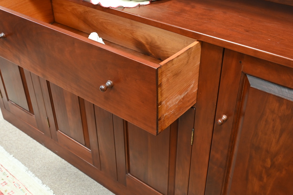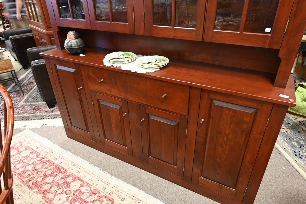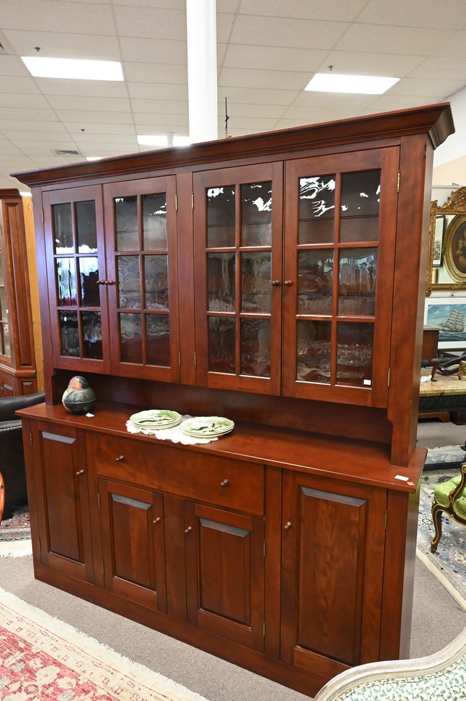 D.R. Dimes Cherry Stepback Cabinet in Two Parts, upper section having four glass doors, on lower cabinet a drawer and four doors, height 79 inches, width 72 1/4 inches.