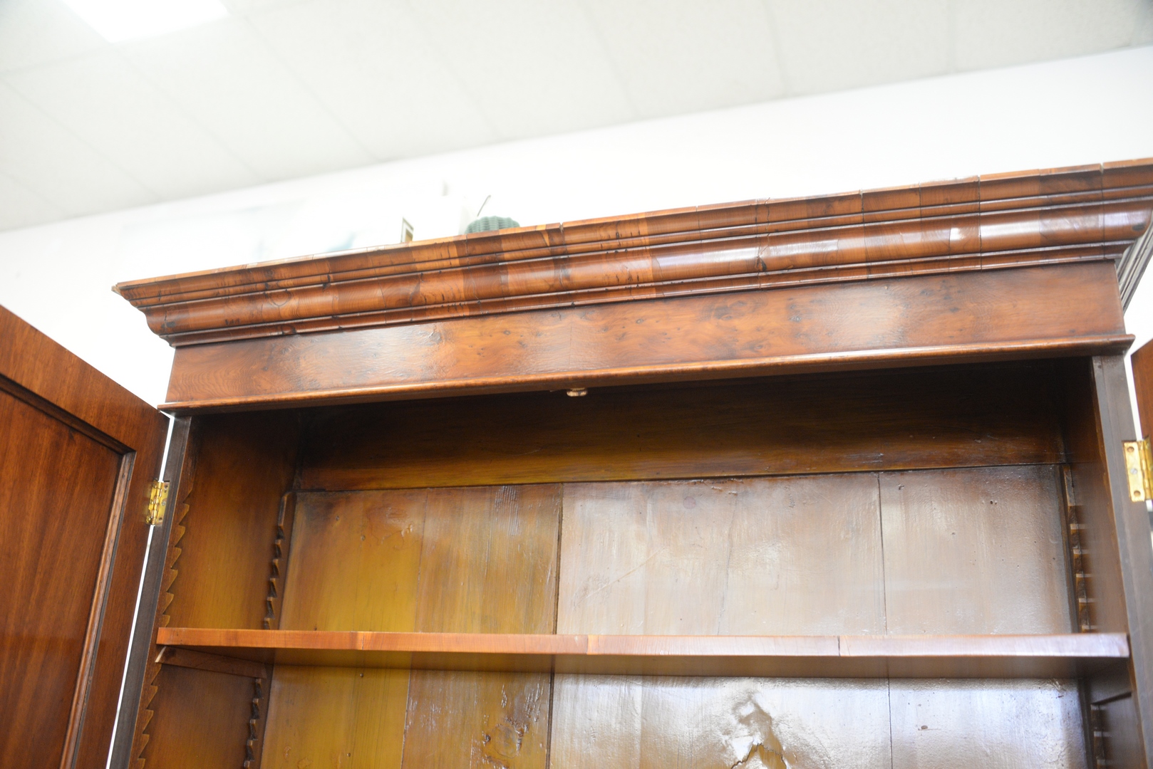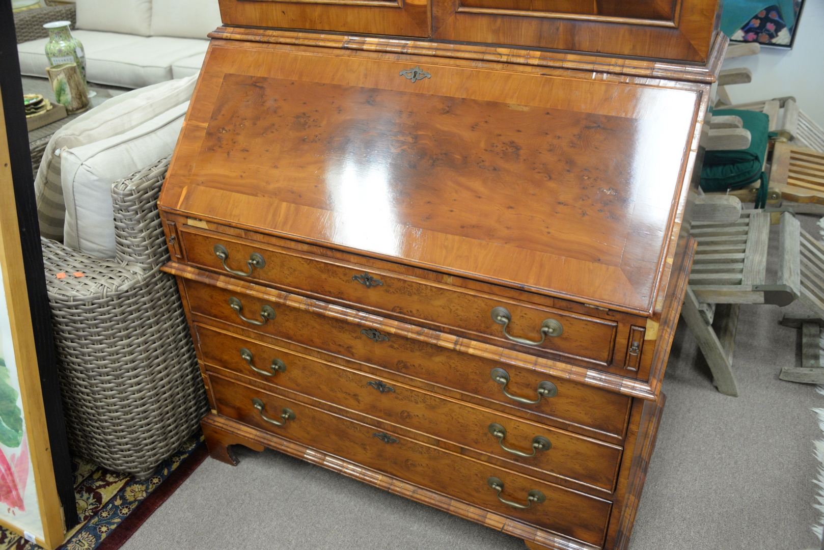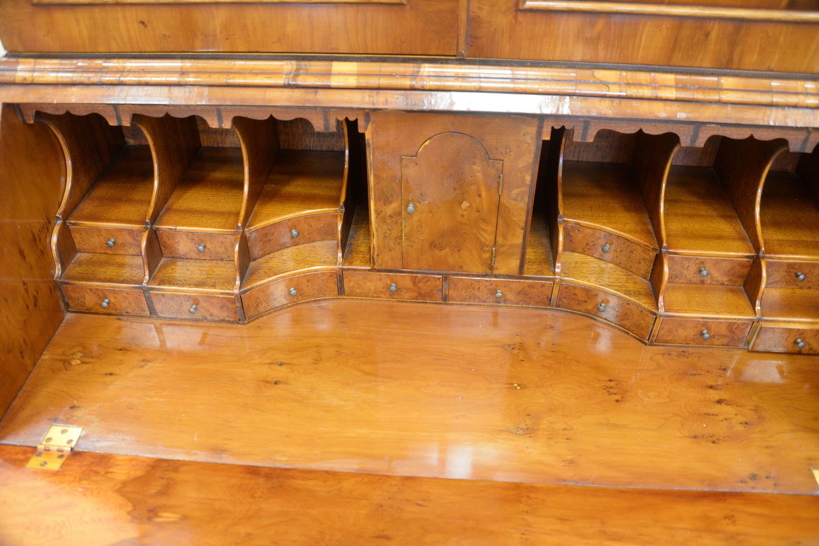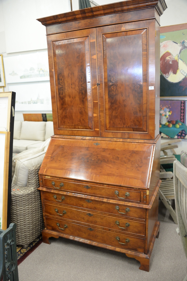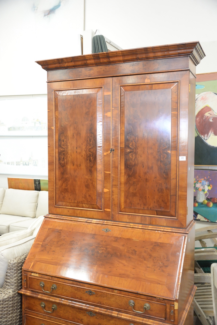 Lot 252: Georgian Style Burlwood Secretary Desk in two parts, height 86 inches, width 41 inches, (minor veneer chips).