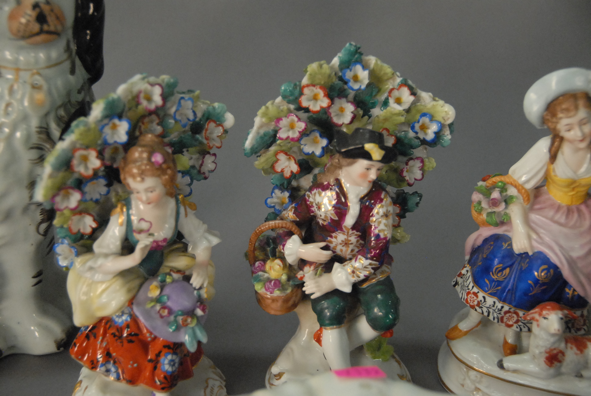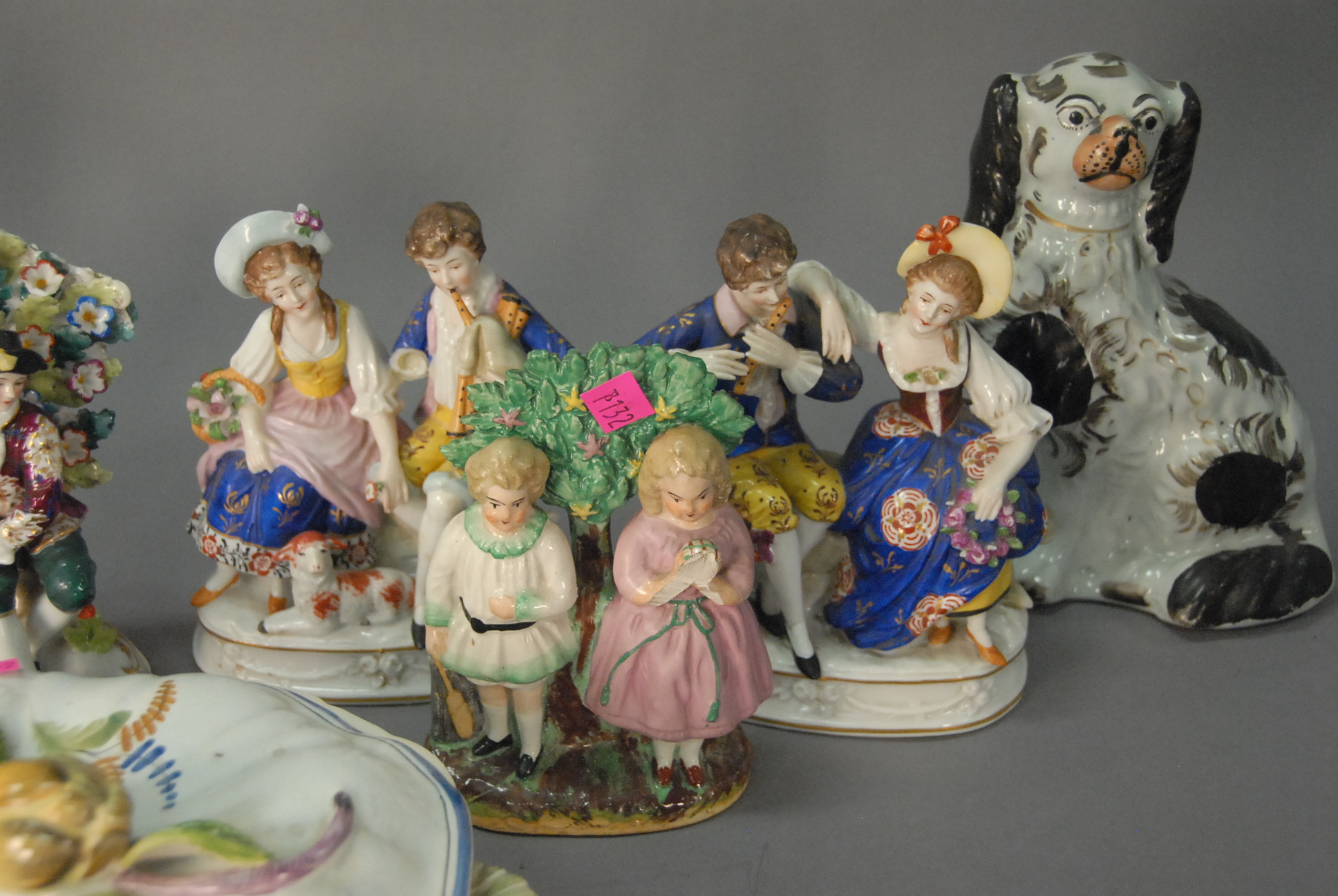 Group of Staffordshire and porcelain figures to include a pair of black and white dogs, covered vegetable dish, two pairs of German porcelain figures and a double Staffordshire figure as is. hts. 7 to 8.