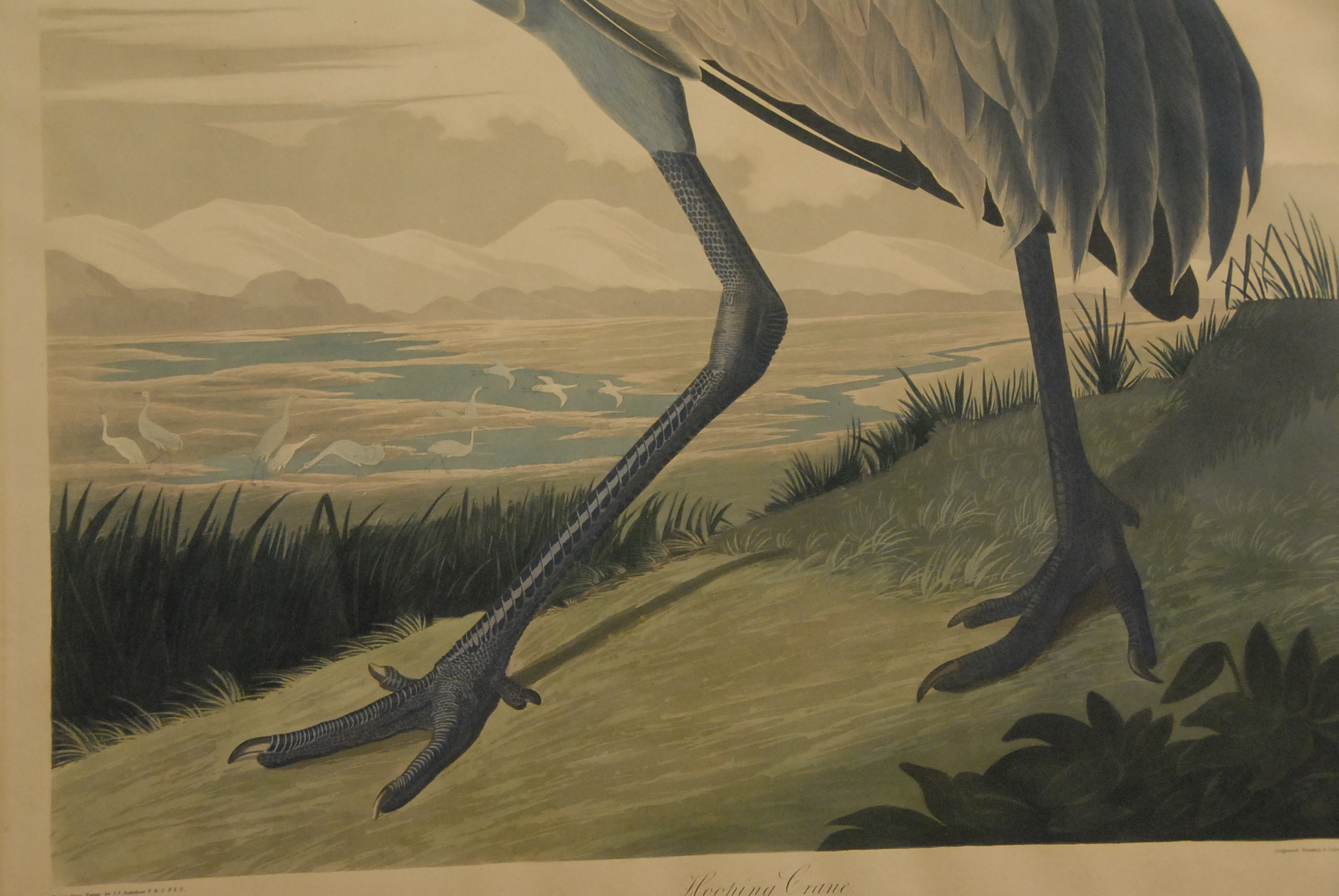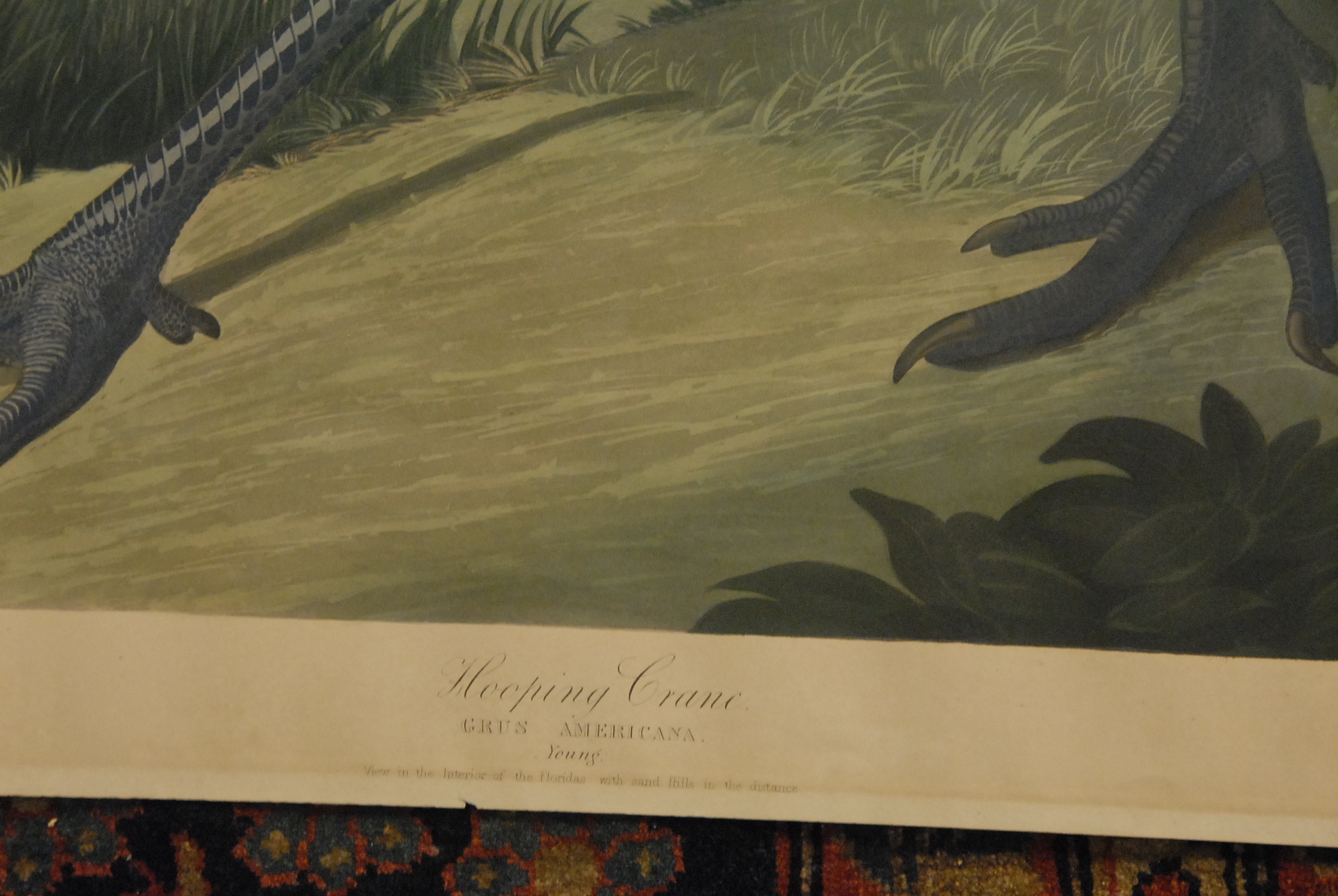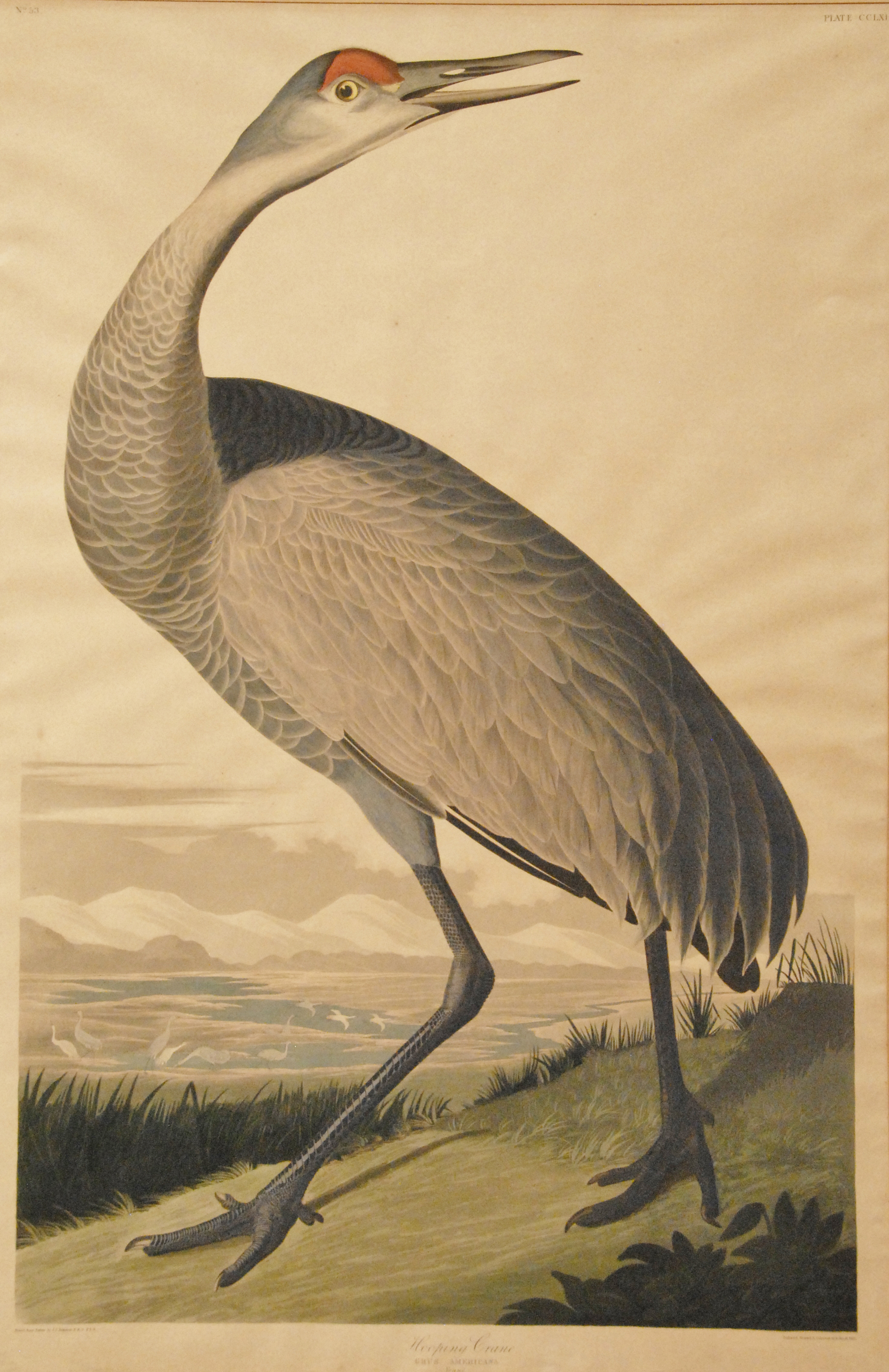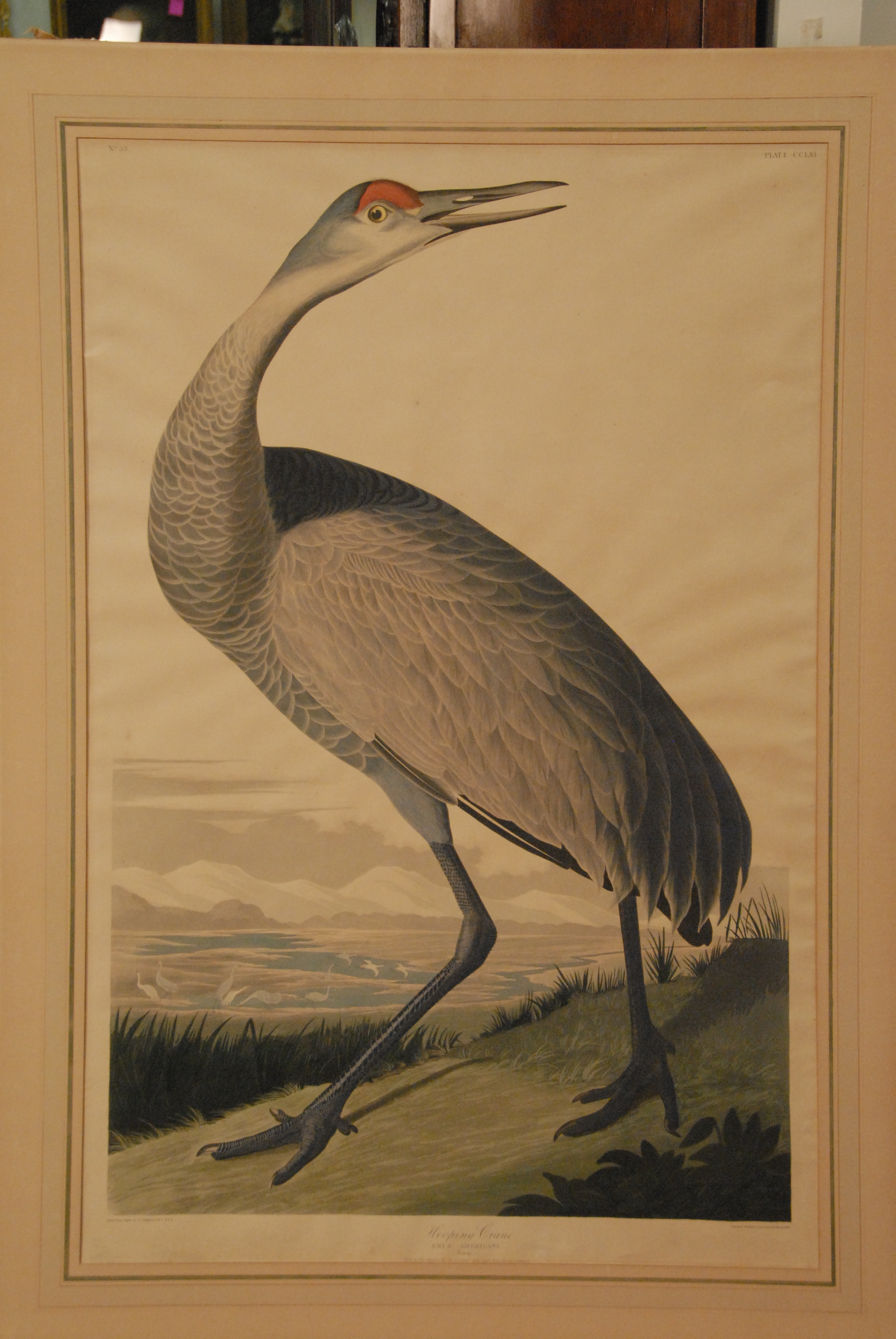 John James Audubon 1785-1851 HOOPING CRANE Grus Americana young, view in the interior of the Floridas with sand hills in distance Plate CCLXI No. 53 hand colored engraving marked lower left: Drawn from Nature by J. J. Audubon F.R.S. F.L.S. marked lower right: Engraved, printed and coloured by R. Havell 1835 J. Whatman 1835 watermark & top right Kennedy Gallery New York label on verso #46961 taped to matting on back of top 38 3/16 x 25 1/8