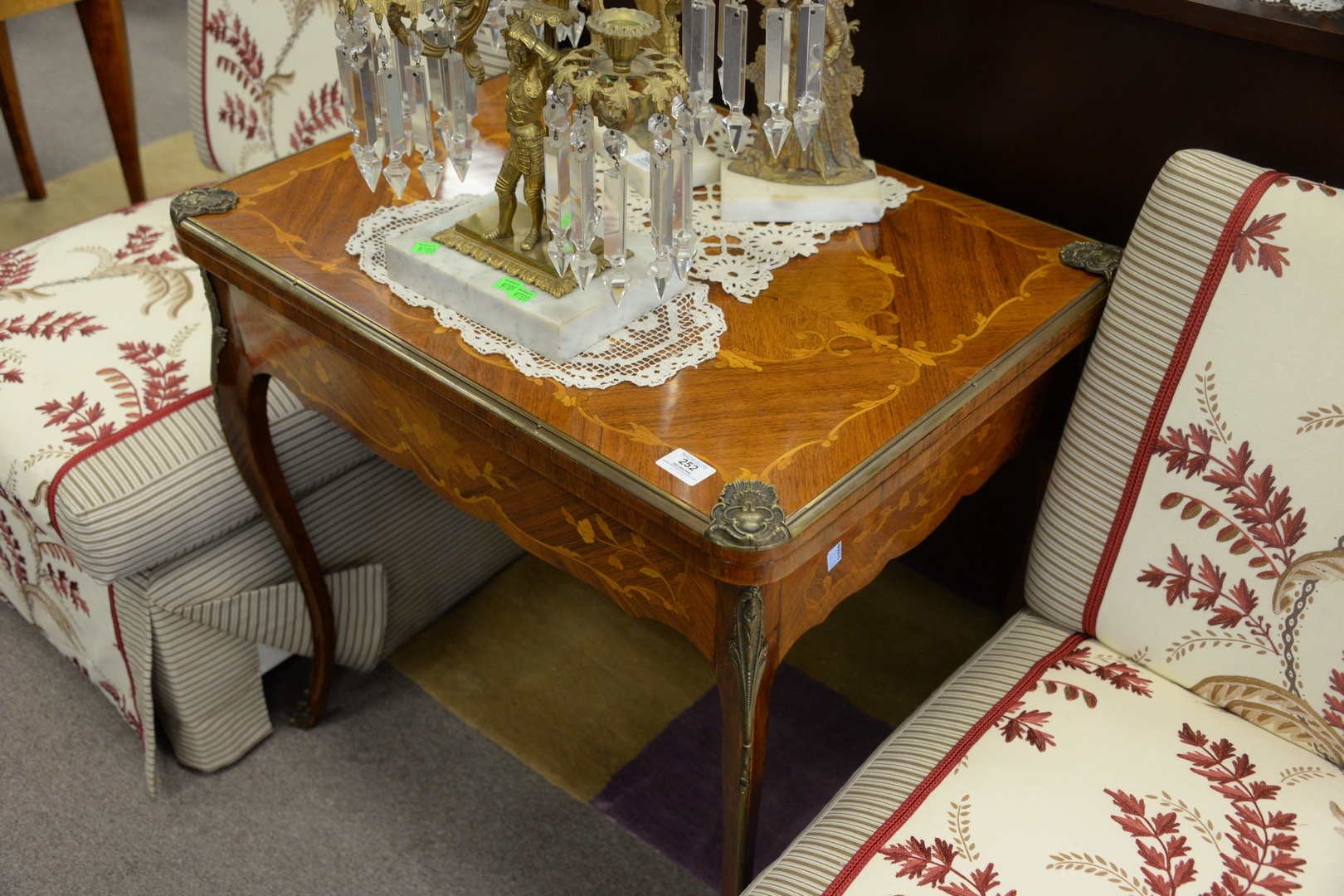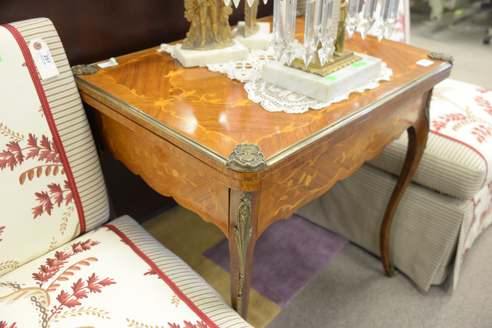 Lot 252: Louis XV Style Marquetry Inlaid Occasional Table, having one drawer and felted interior on cabriole legs, height 29 inches, top 21″ x 29″.