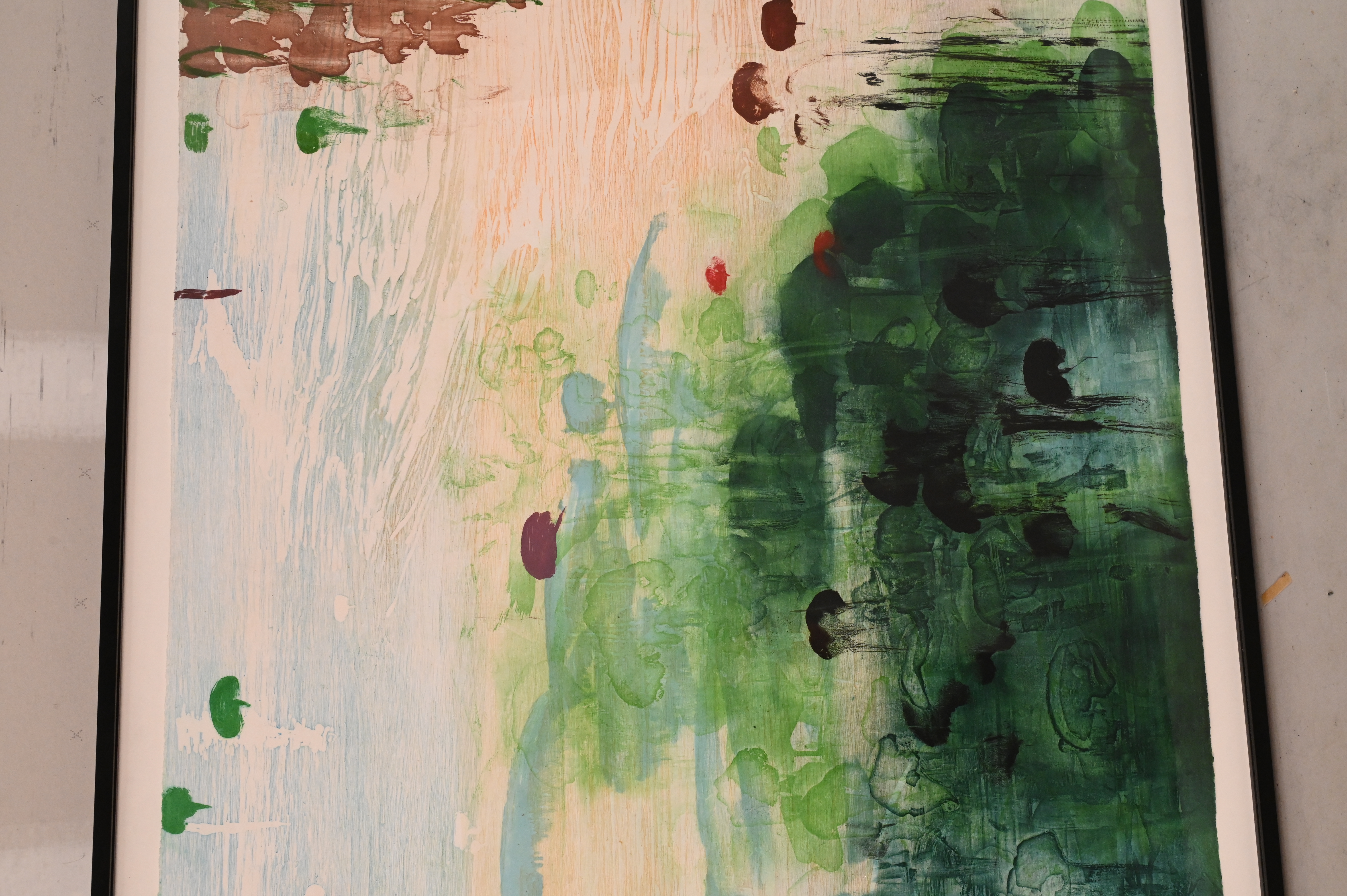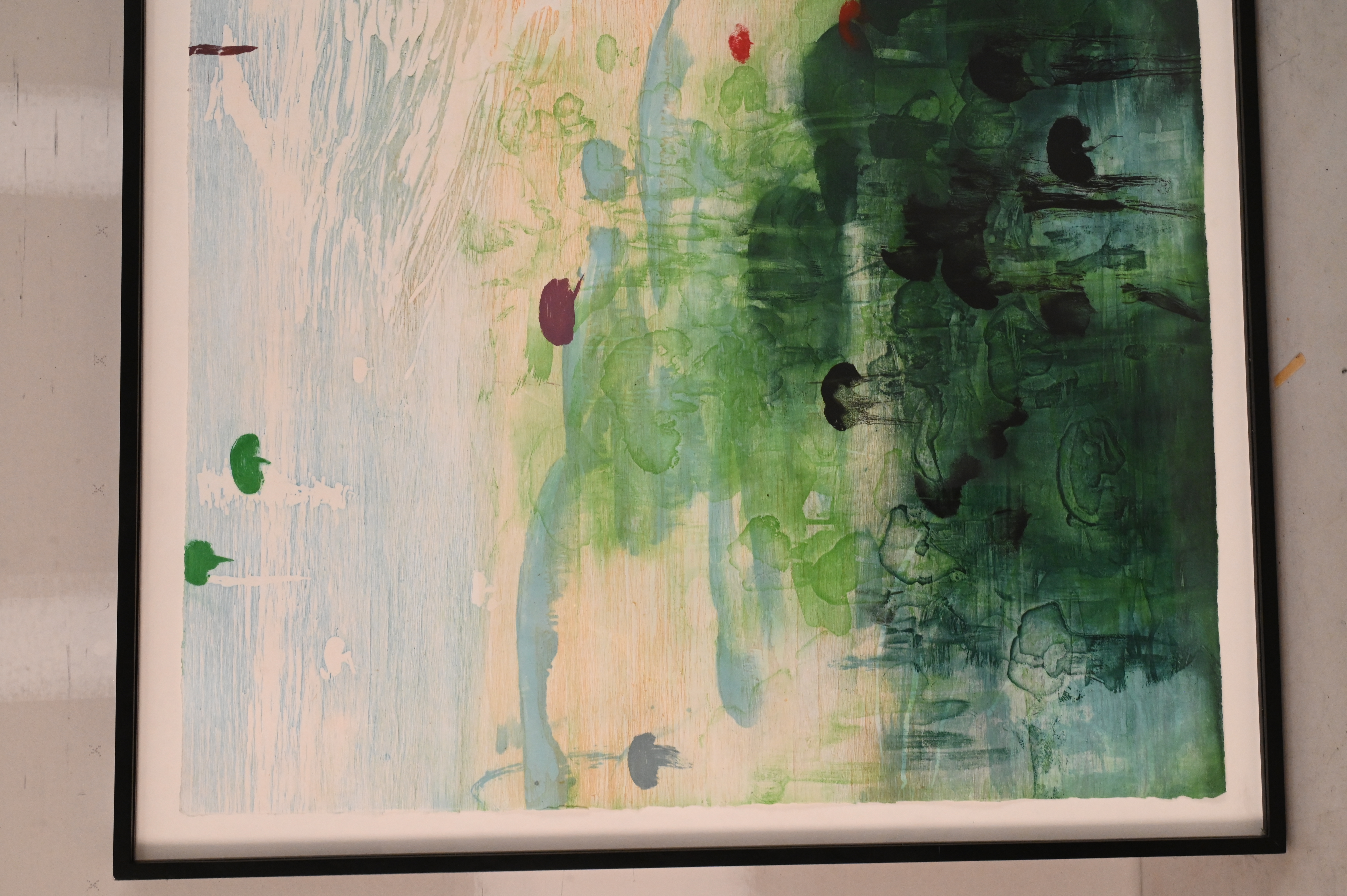 Condition: Overall good condition, scattered specks mostly on left side, possible vertical red stain/soiling to left side of purple spot