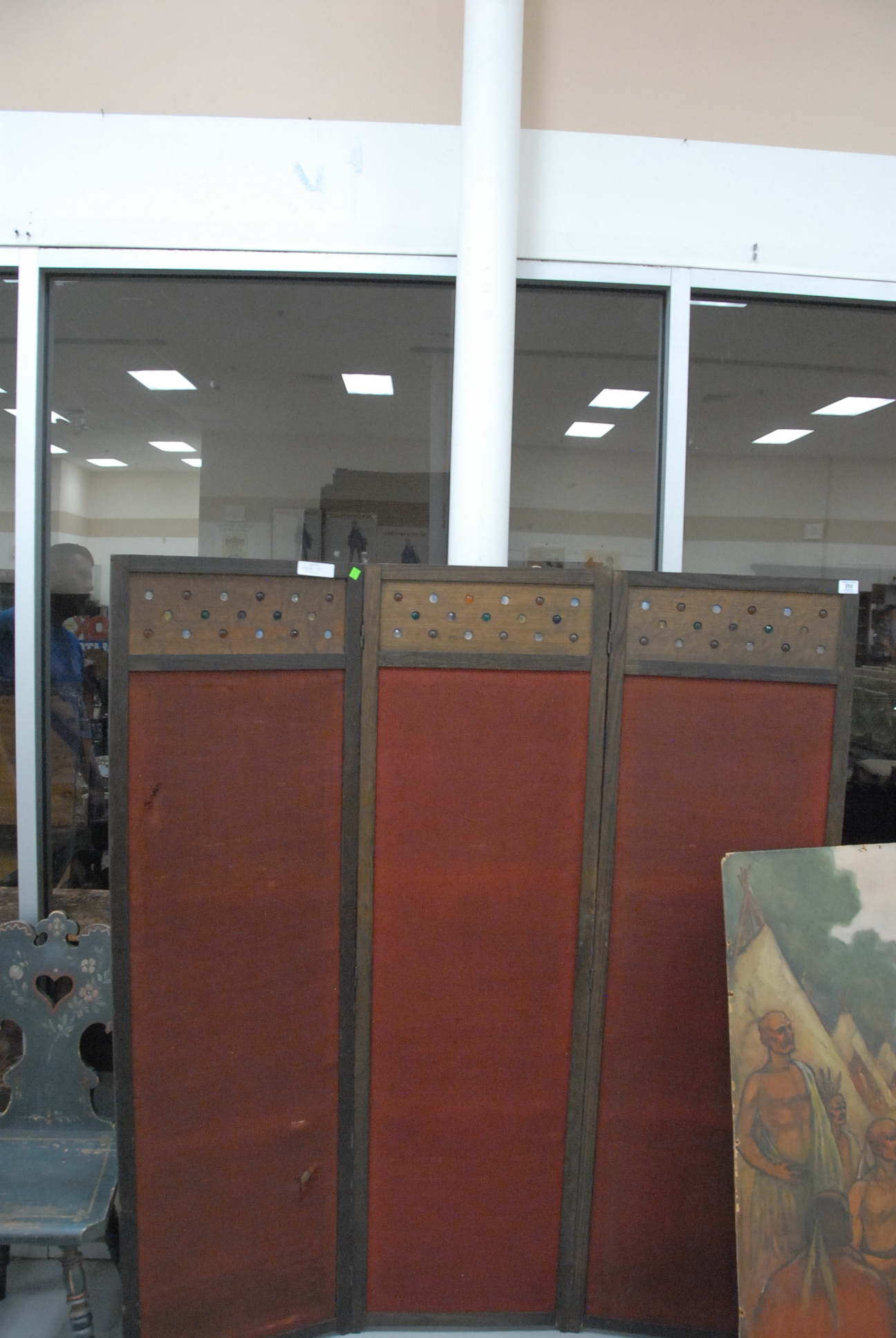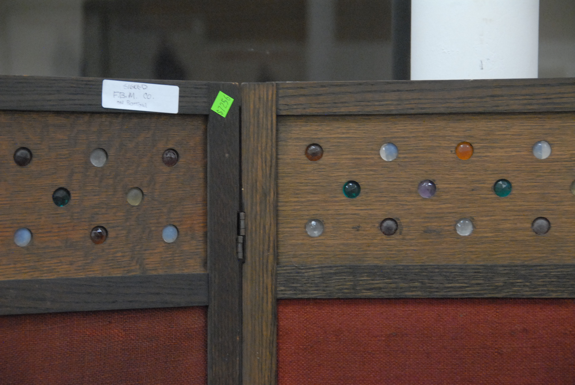 Mission oak three fold screen with jeweled top, ht. 68in. each panel 19 1/2in. wide.