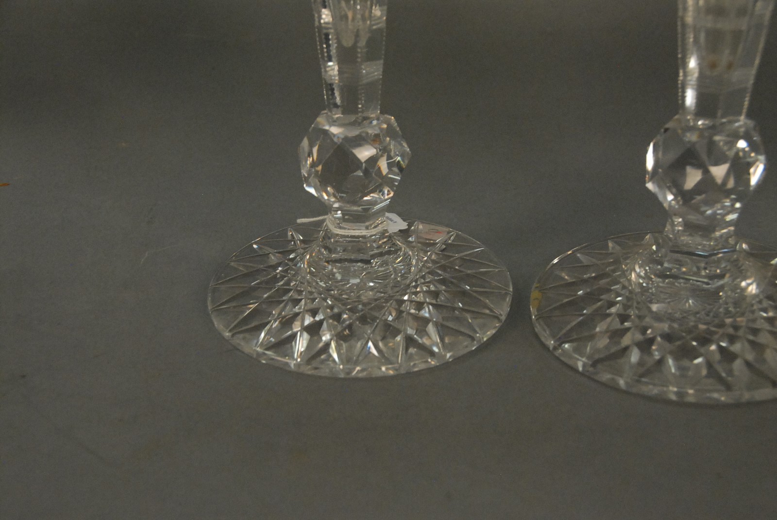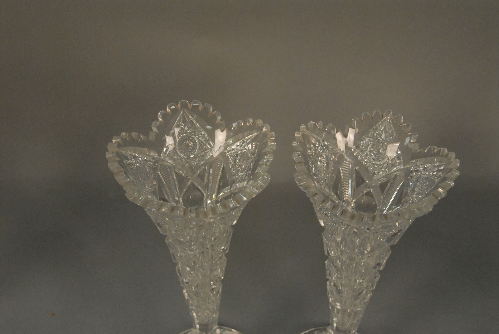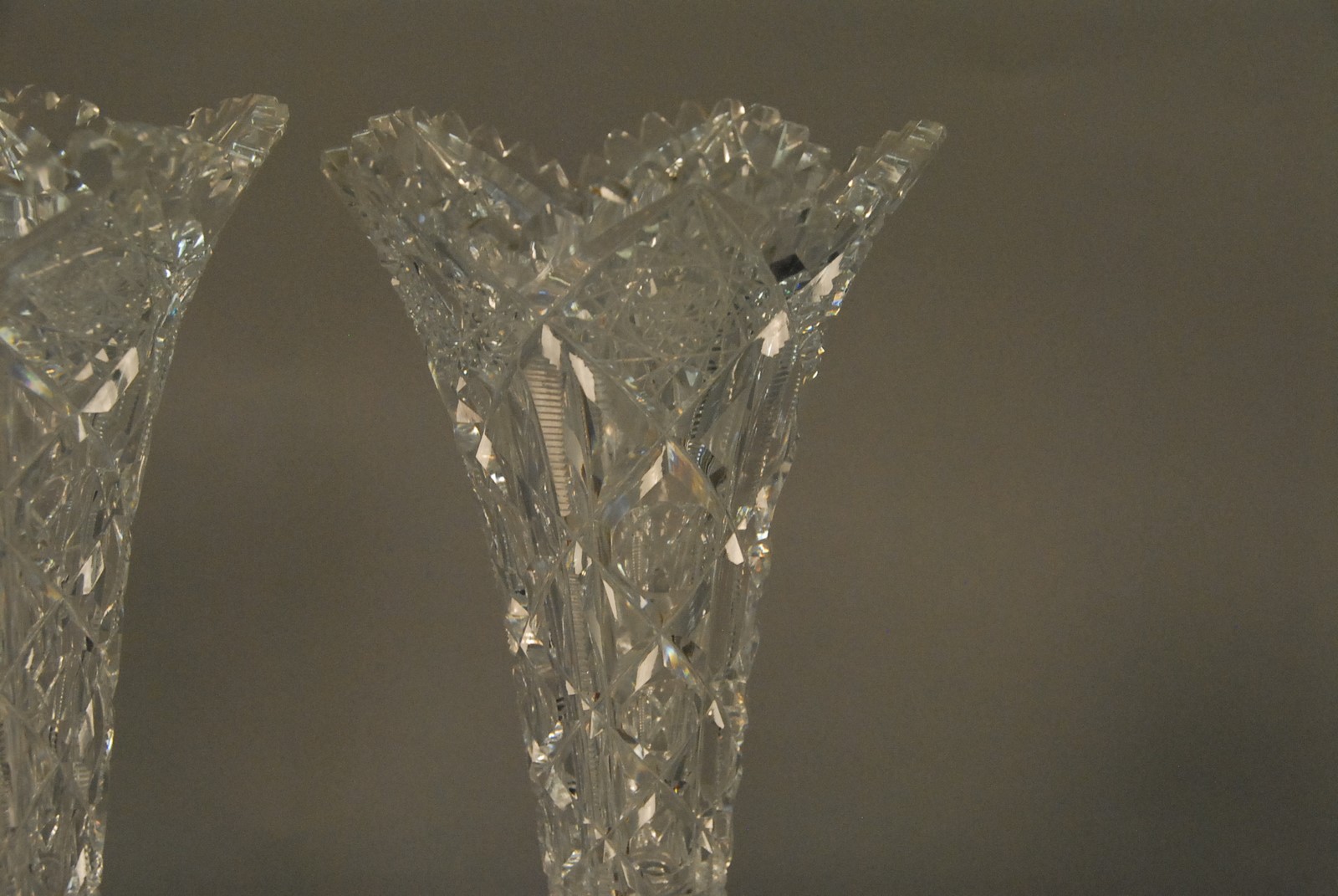 Lot 252: Pair of American brilliant cut glass vases on round footed bases. ht. 14 in.