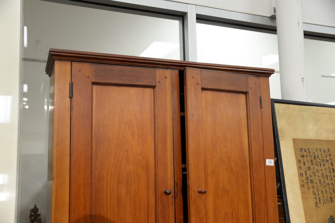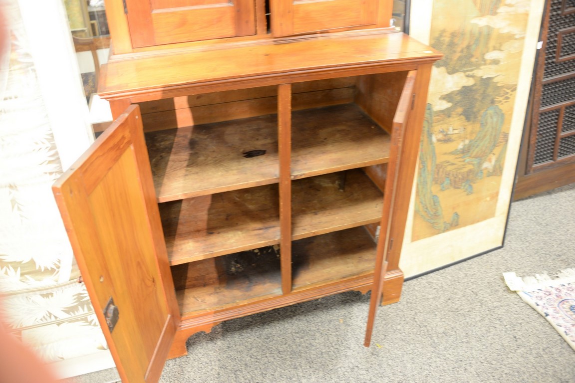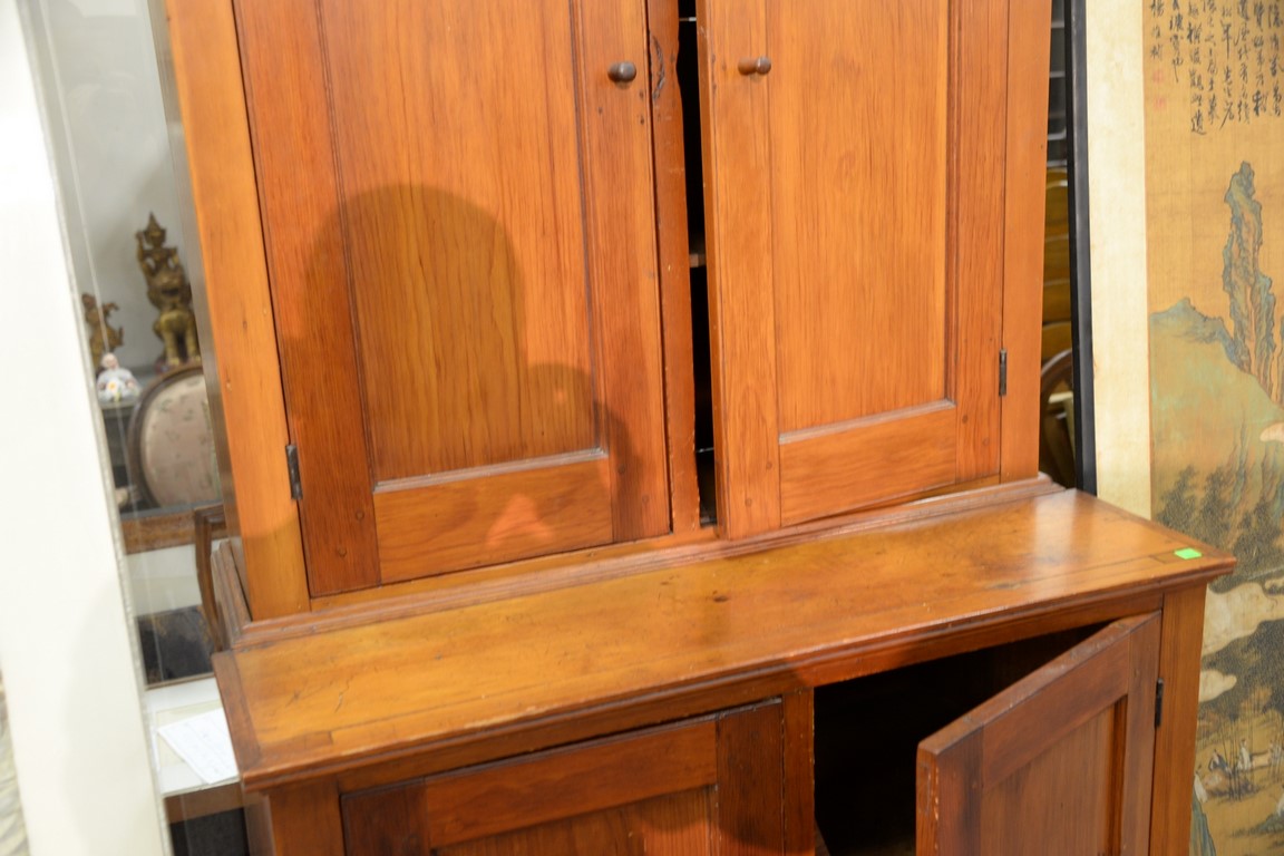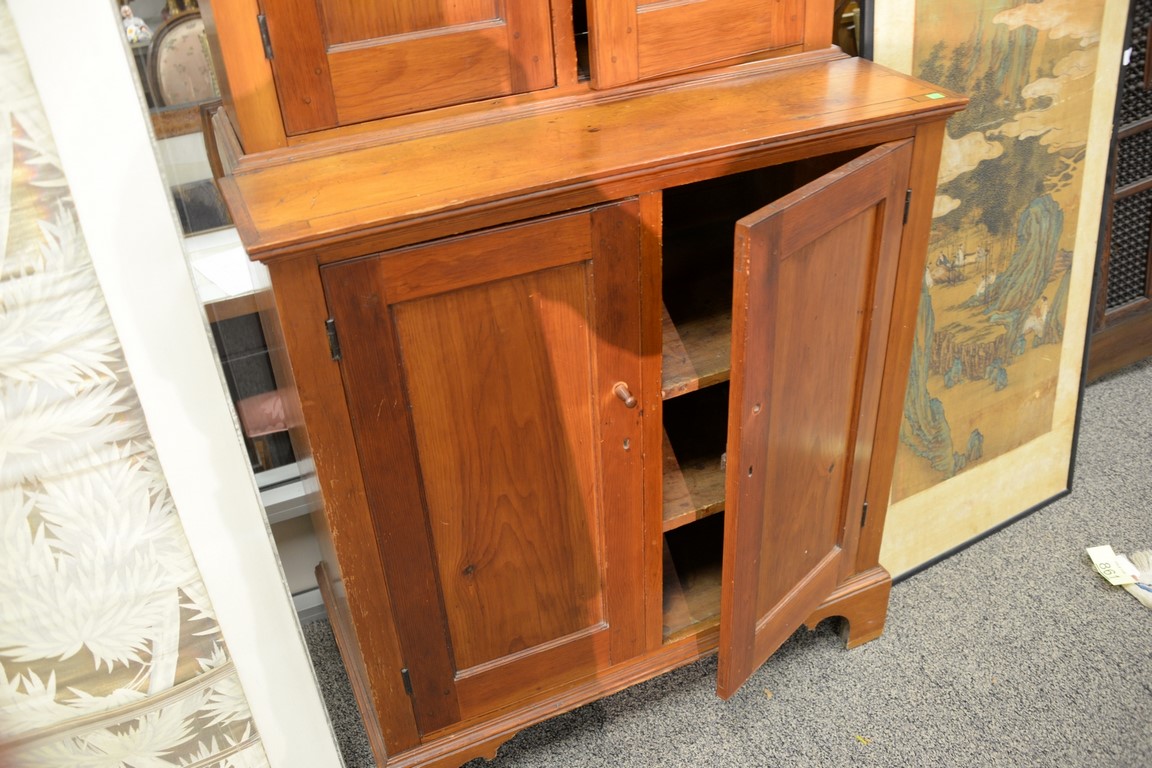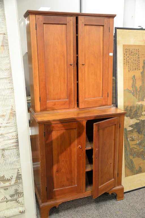 Lot 252: Primitive stepback cupboard in two parts with two doors in upper section over base with two doors, all set on bracket base. ht. 80in…