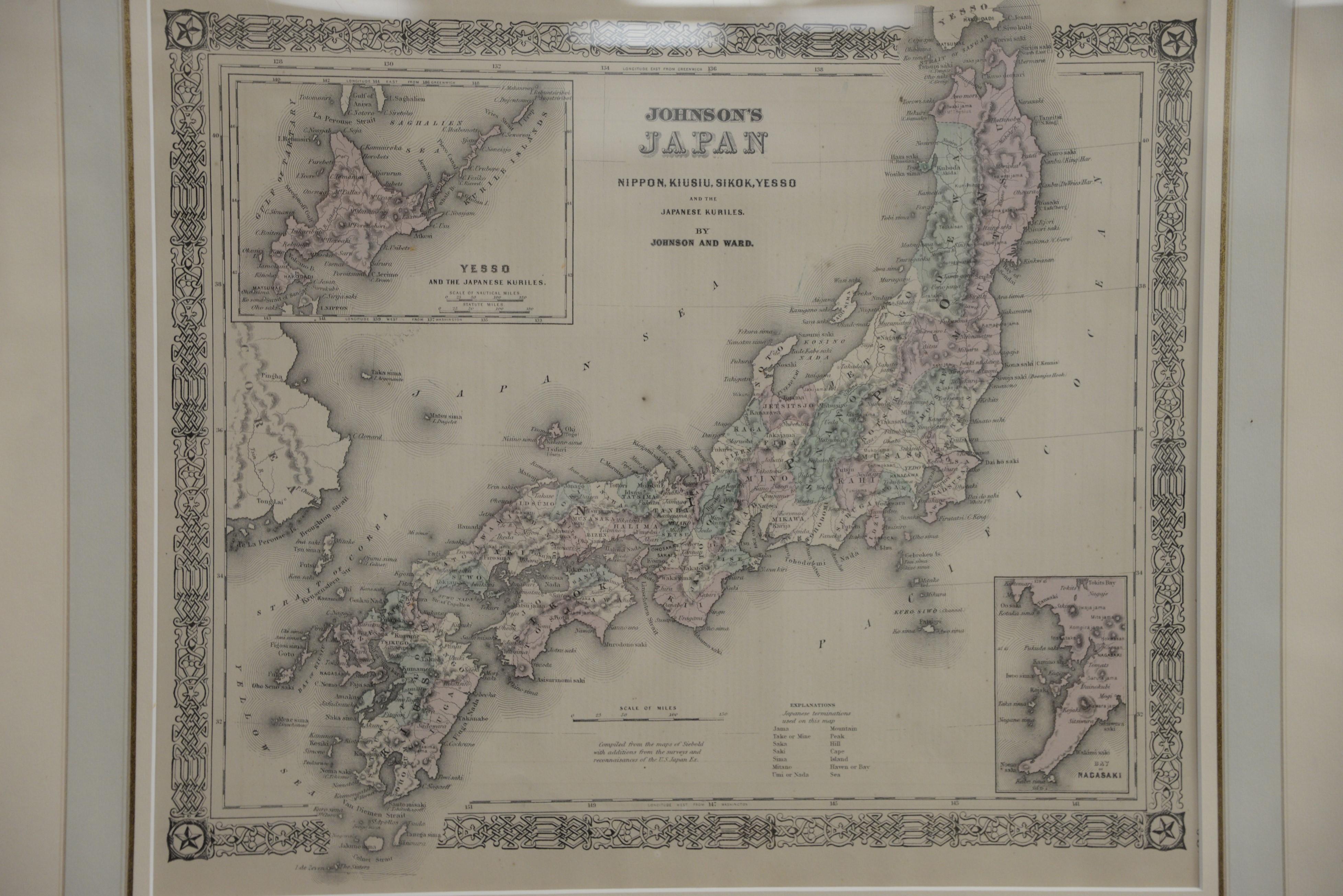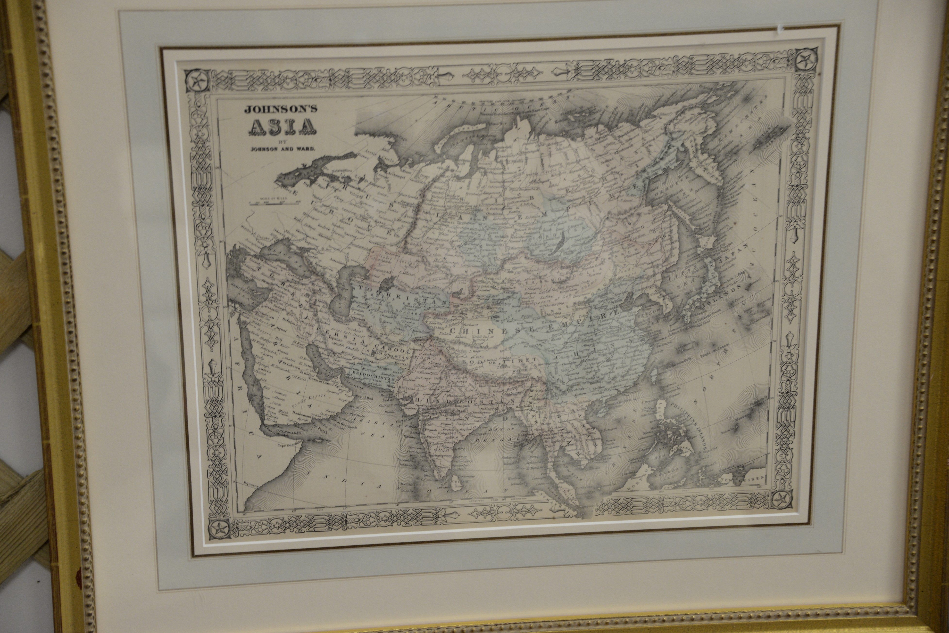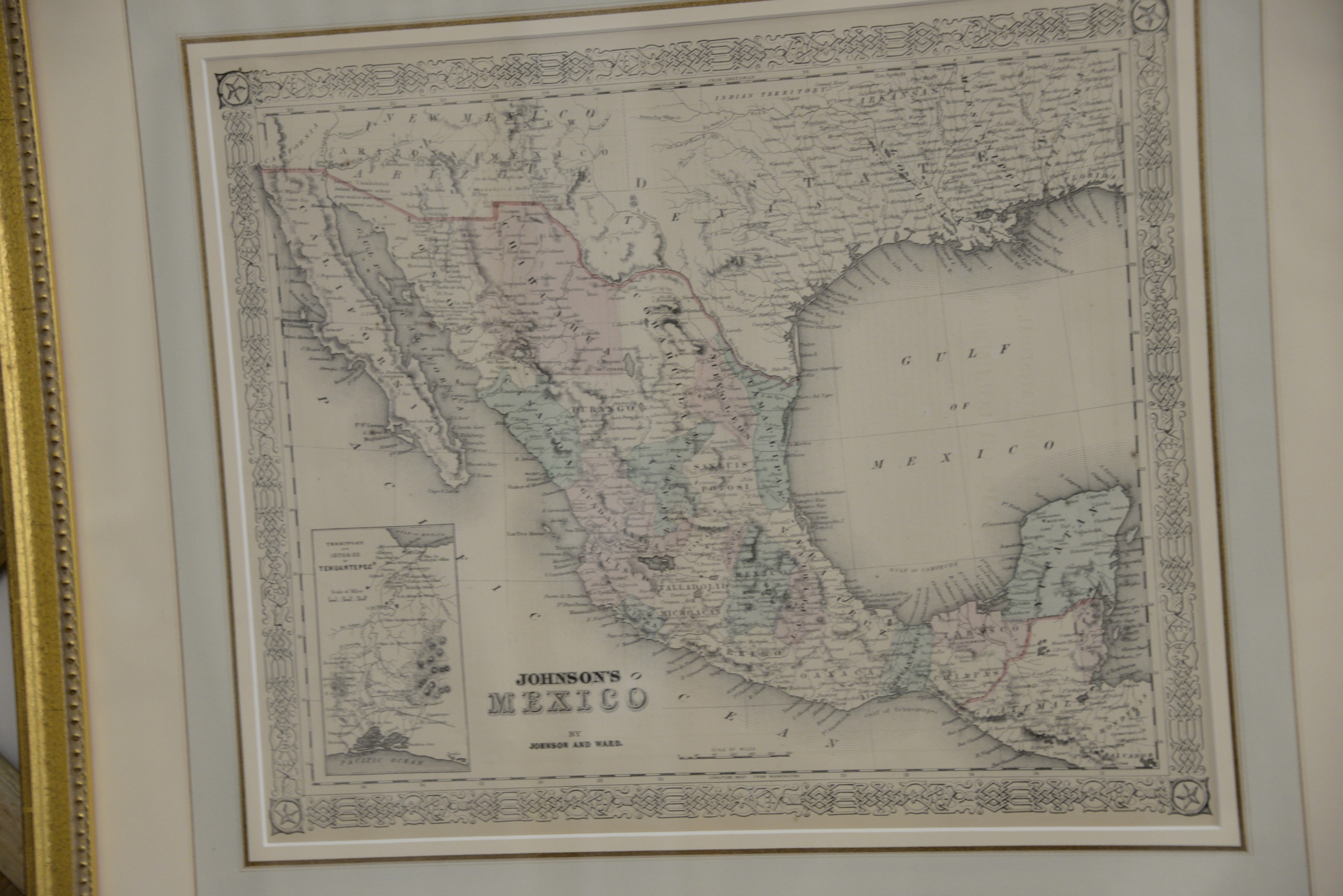 Set of four Johnson and Ward maps including Asia, Japan, Hindostan or British India, and Mexico. sight sizes: 13 x 15 3/4, 13 3/4 x 16, 13 x 15 3/4, and 13 x 15 3/4. Property from Credit Suisse’s Americana Collection