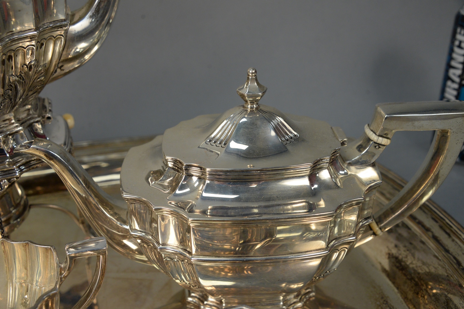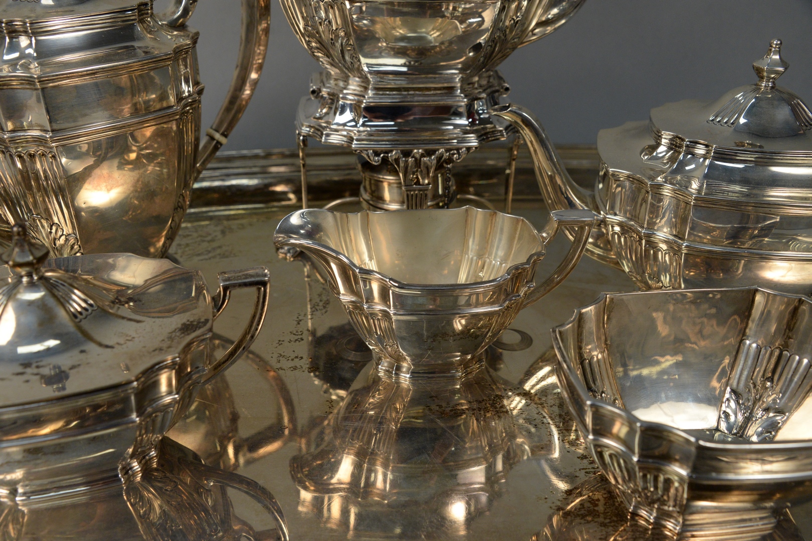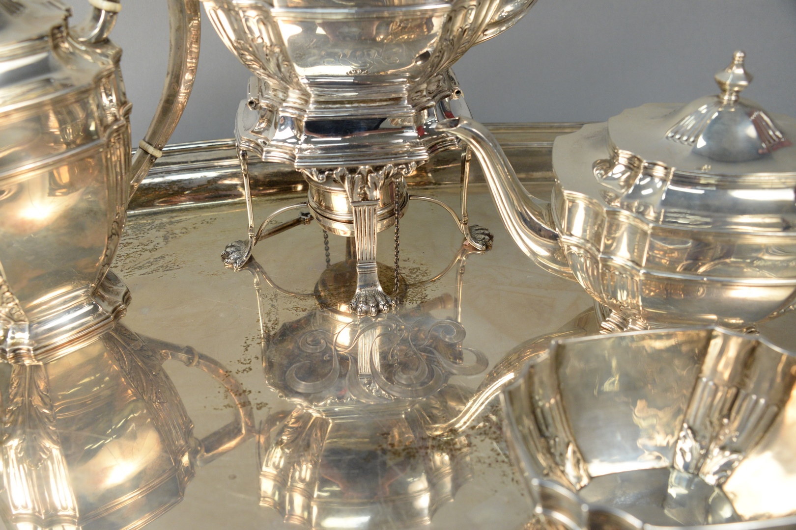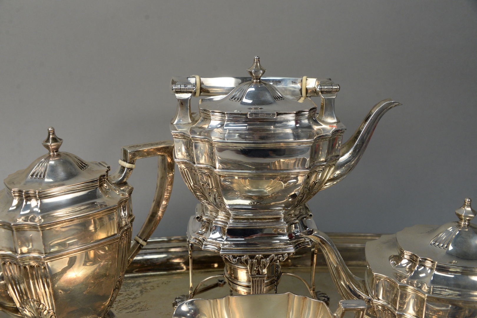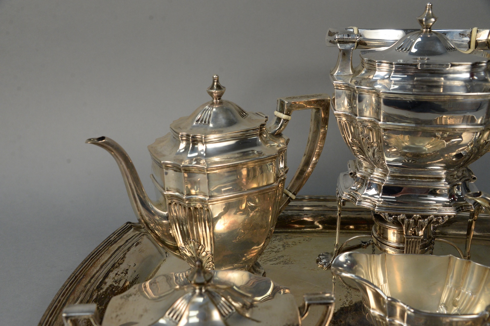Lot 252: Seven Piece Sterling Silver Tea and Coffee Set late Georgian pattern, to include large tray, tilting hot water pot on stand, coffee …