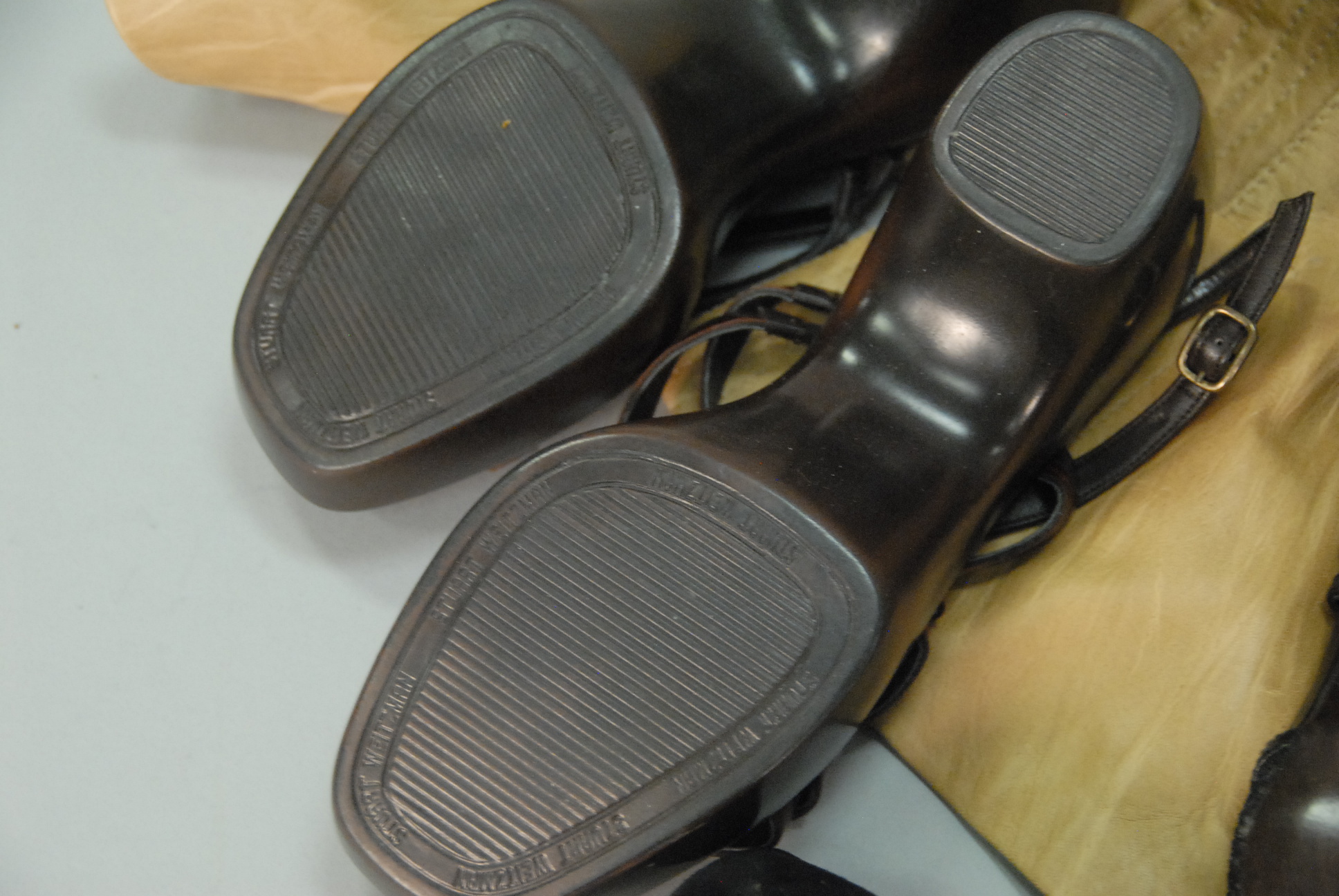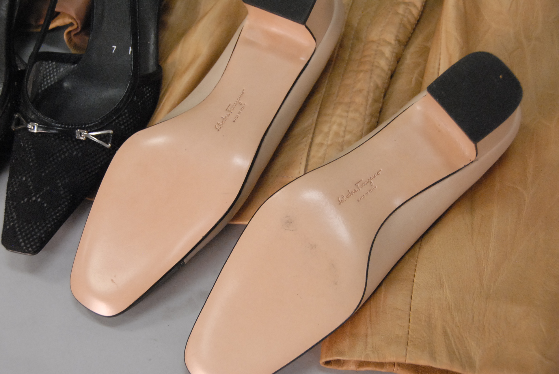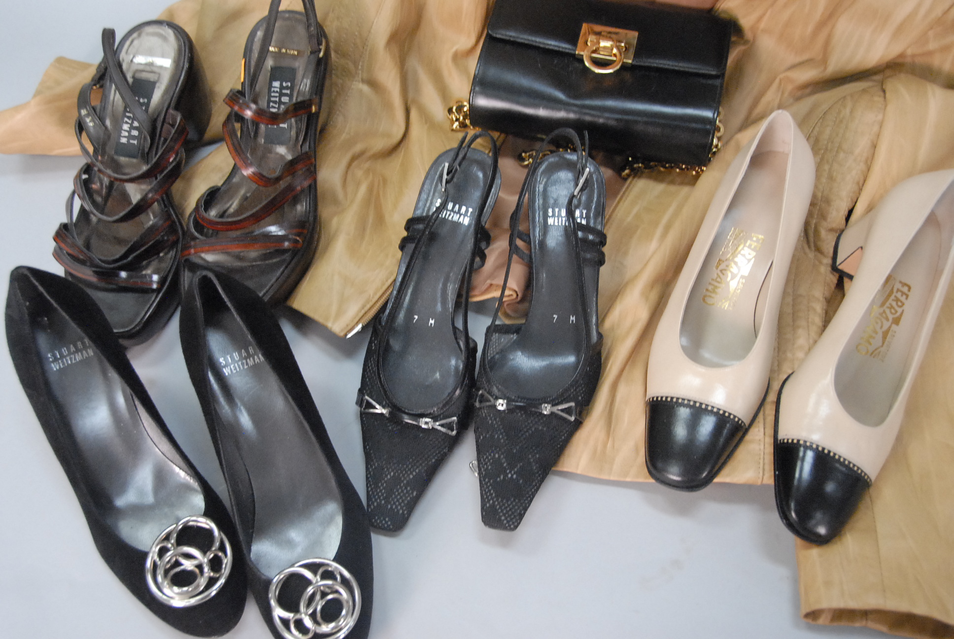 Stuart Weitzman and Salvatore Ferragamo group of four pairs of almost new shoes and a purse.