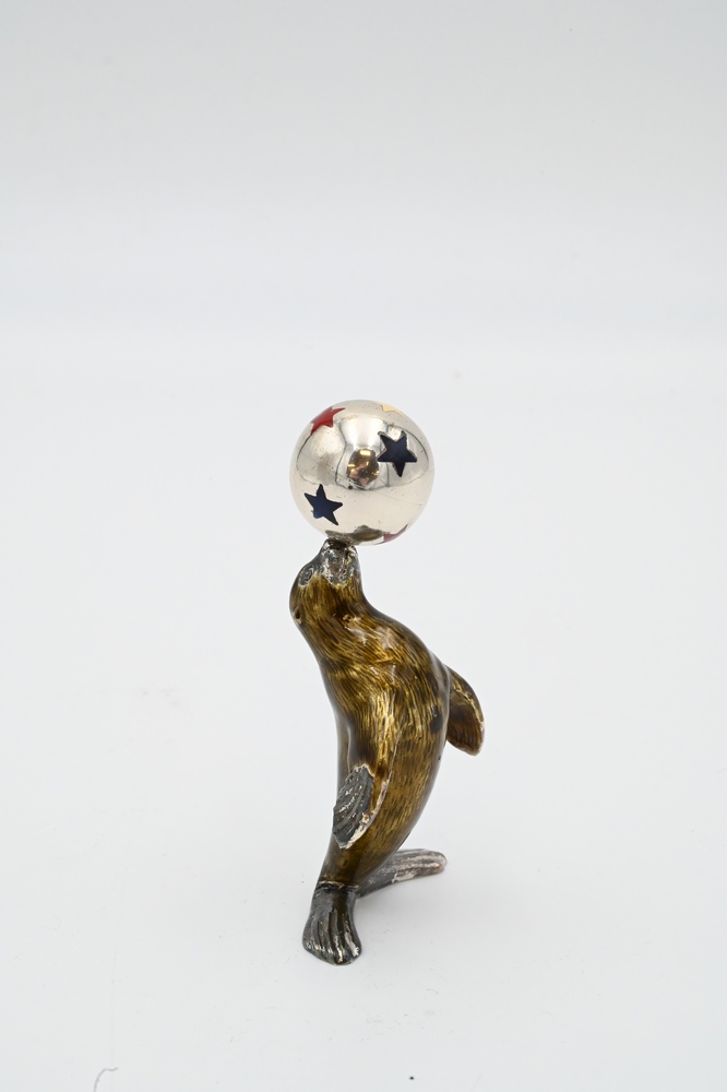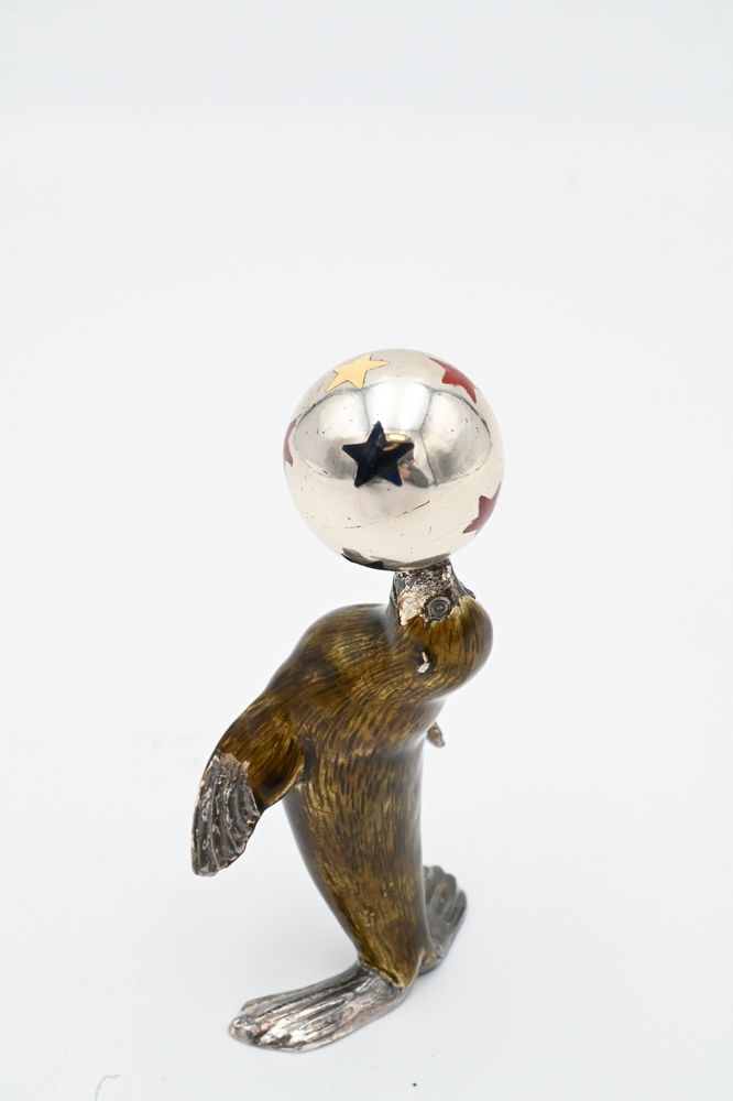 Lot 252: Tiffany & Company Sterling Silver Enameled Circus Seal with Ball, designed by Gene Moore (1910 – 1998), enameled with red, white and…