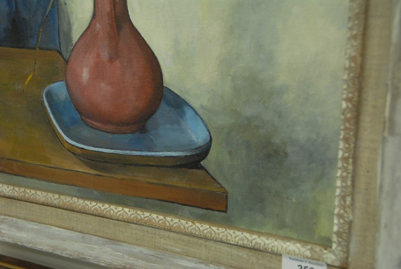 Lot 252: Tosca Olinsky 1909-1984 oil on board still life of flowers in red vase signed lower right Tosca, 19 1/2 x 16 1/2.