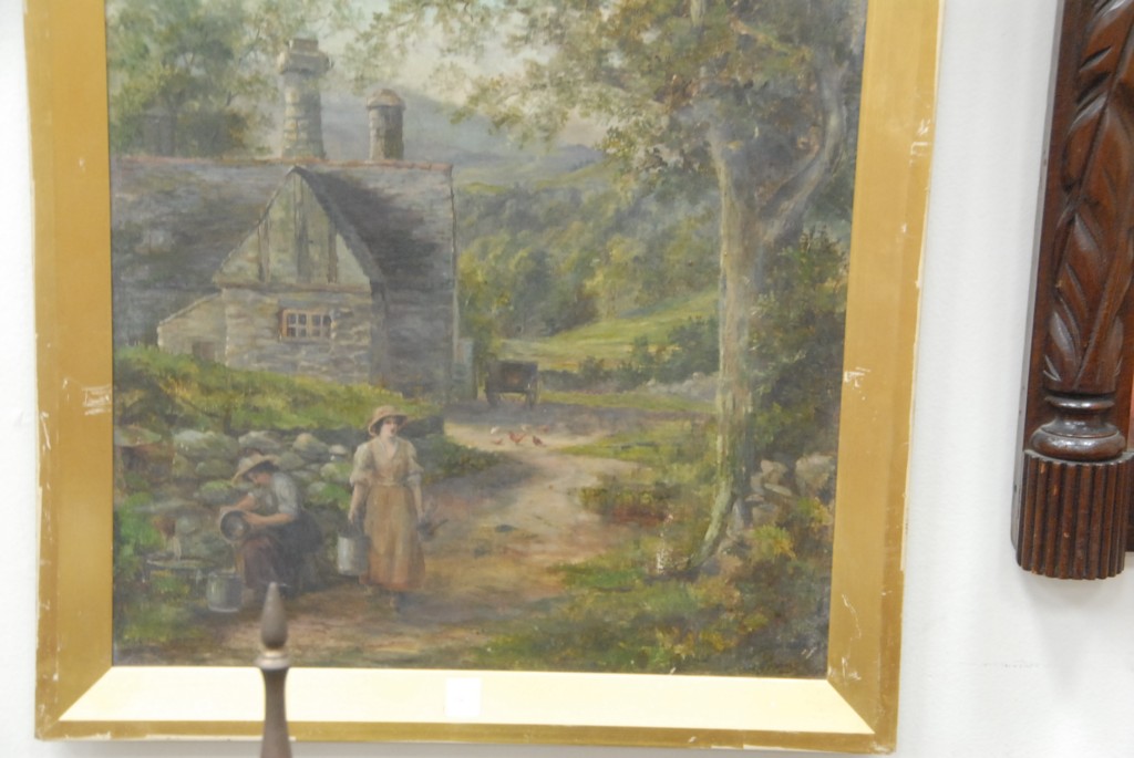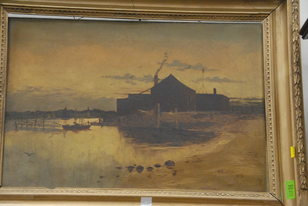 Lot 252: Two oil on canvas paintings Leo W. Adams Working on the Farm signed lower right Leo W. Adams – 24 x 16 and W. Wheeldon harbor scen…