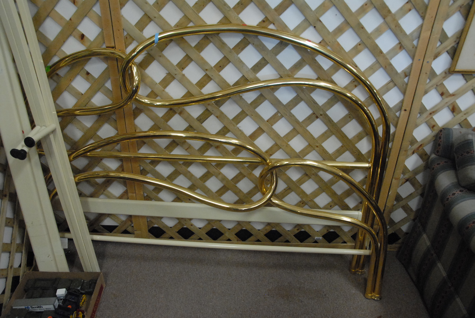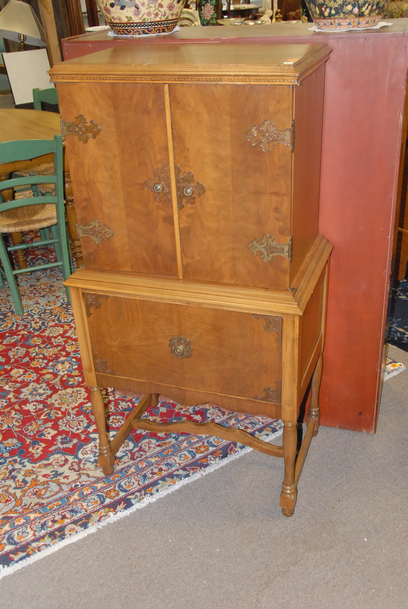Two piece lot to include a double brass style bed and a walnut cabinet.