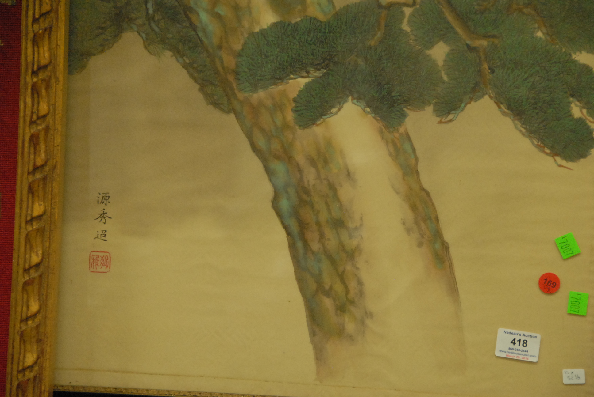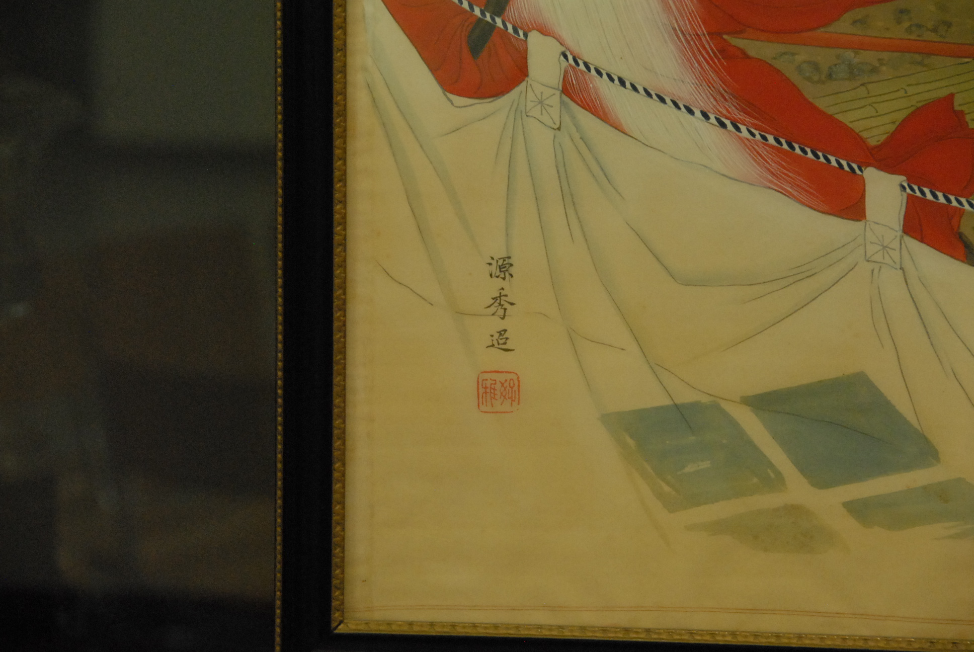 Lot 252C: Pair of framed paintings on silk depicting horseman fighting white-haired demon, and samurai carrying official, Japan, 20th centur…