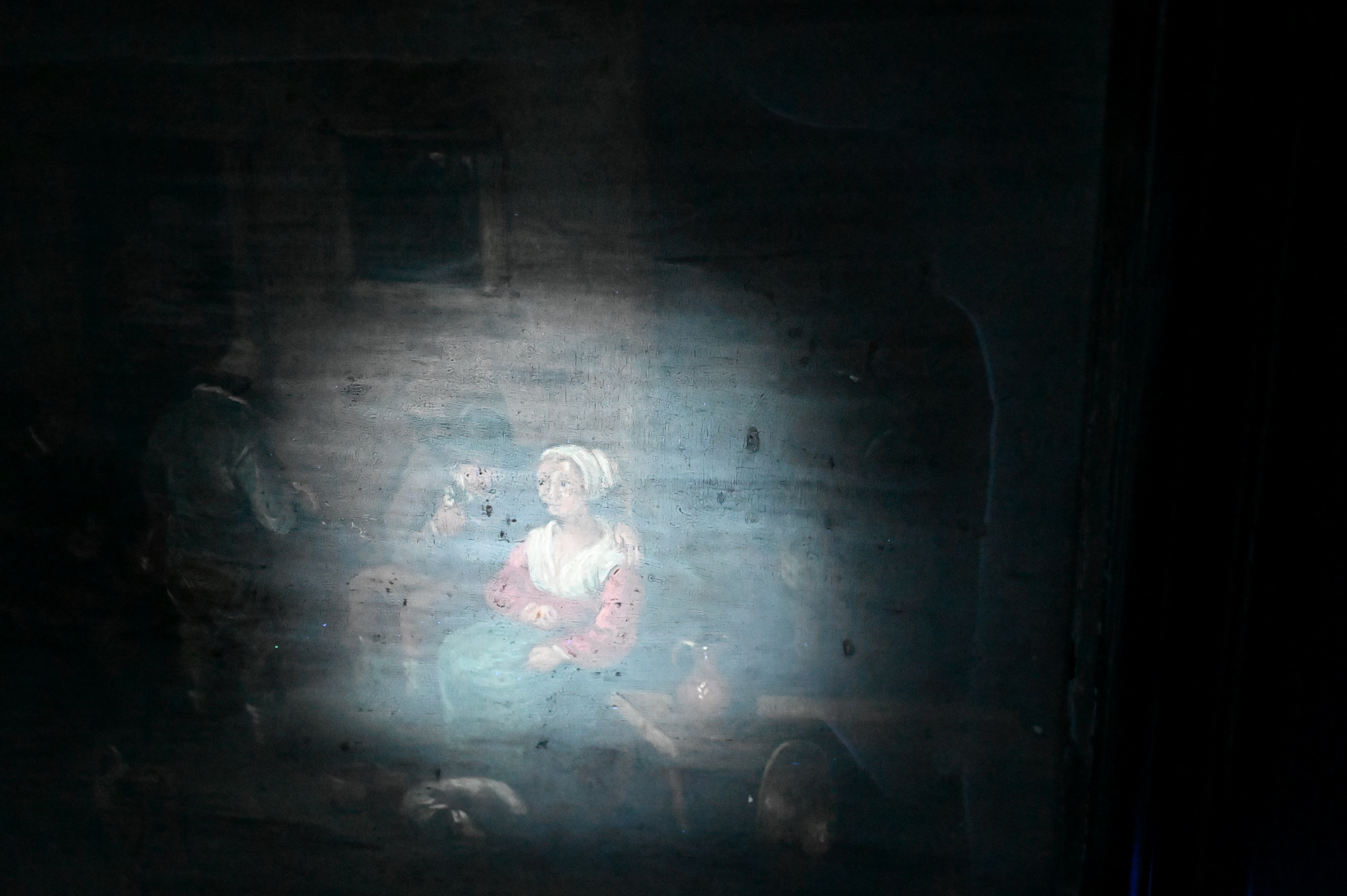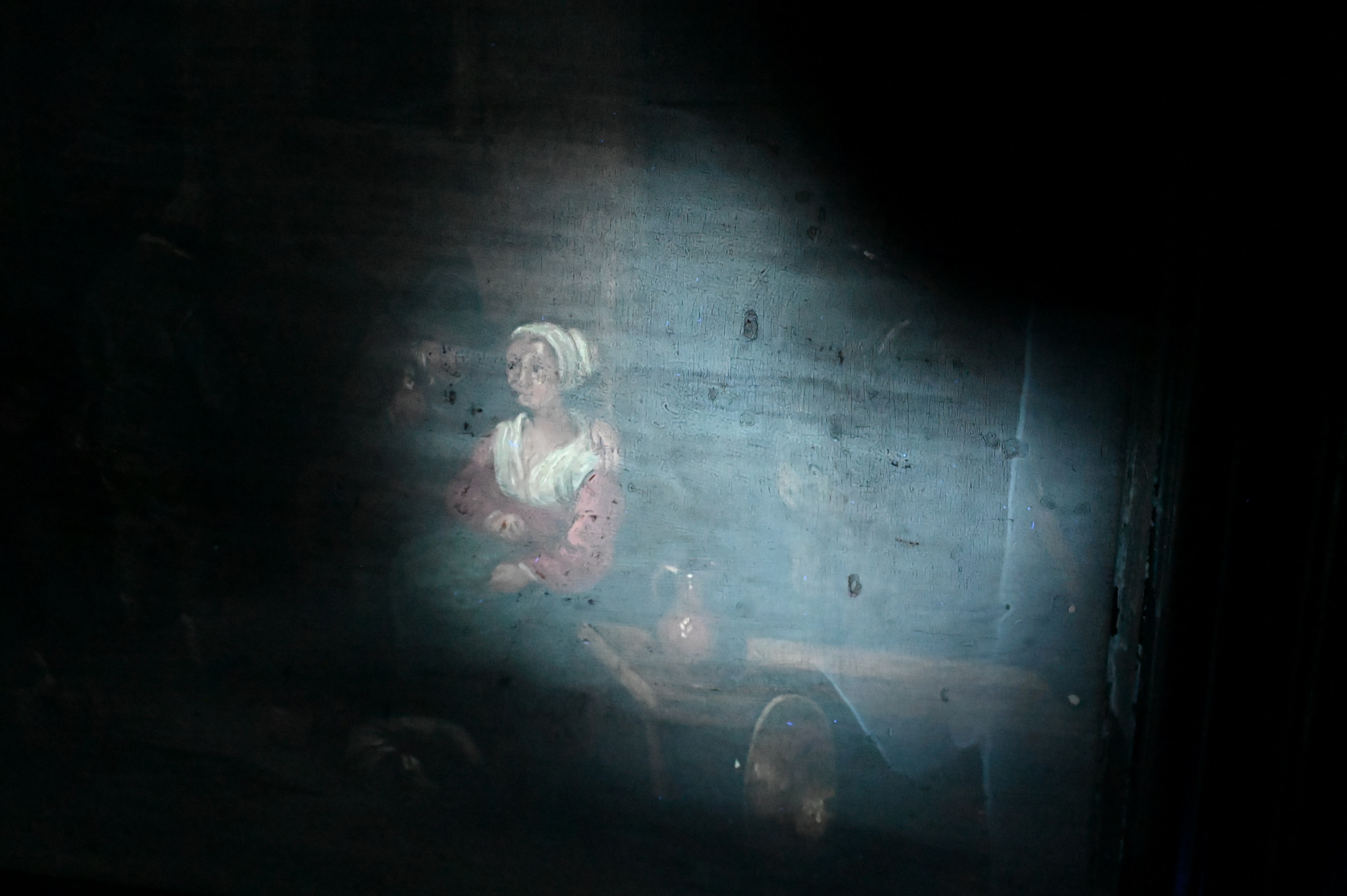 Black light: heavy varnish with drips, inpainting throughout, see photos