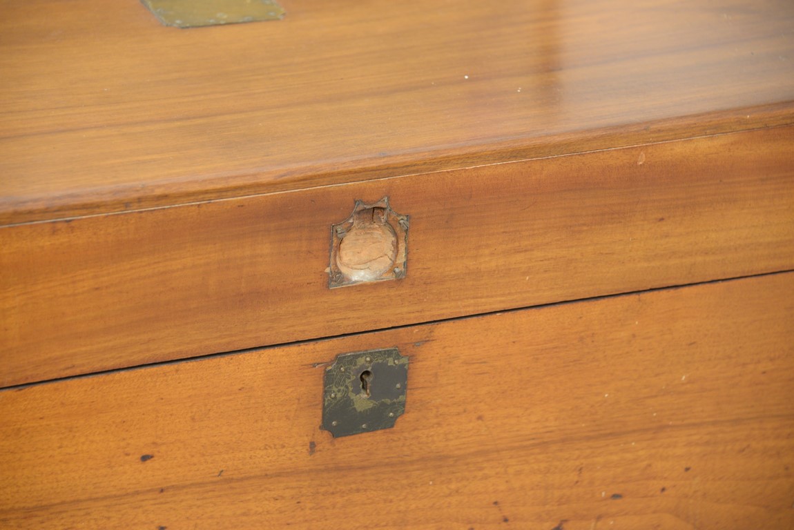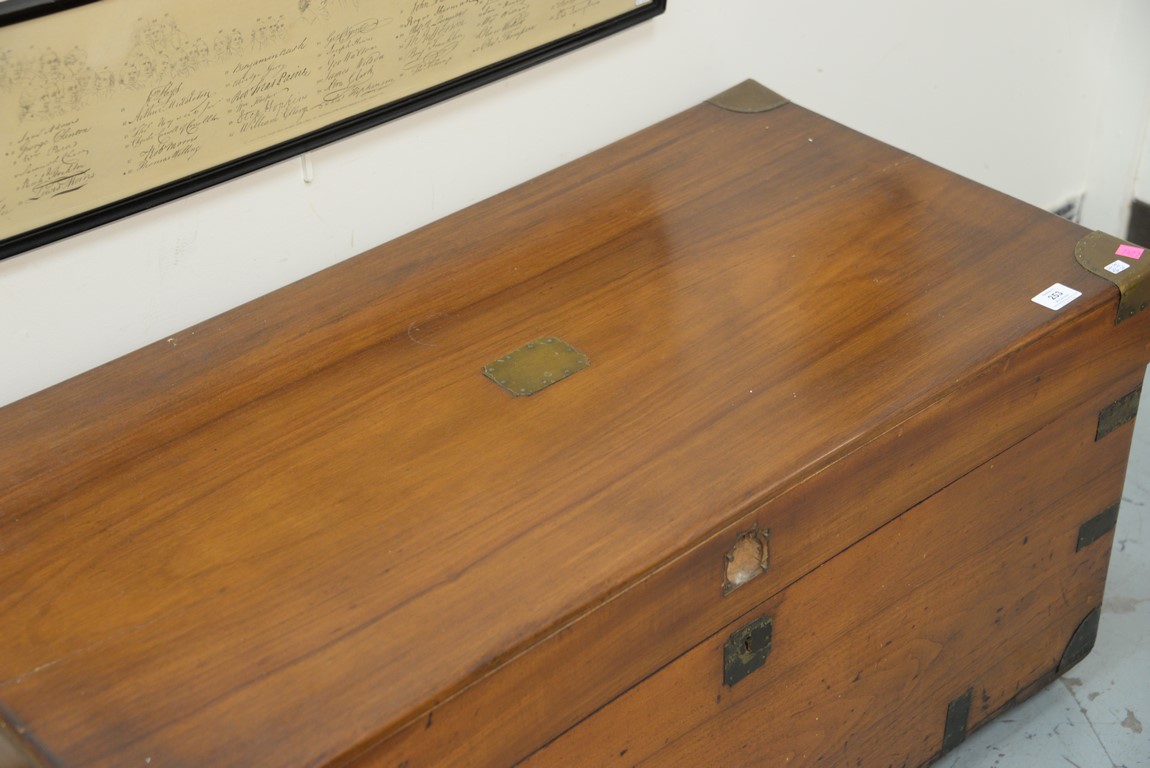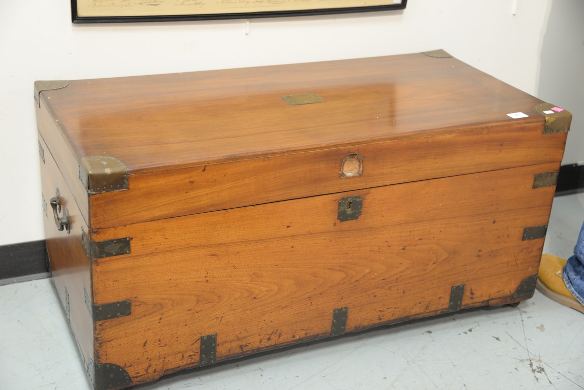 Lot 253: Camphorwood lift top chest with brass bindings, probably late 18th century to early 19th century. ht. 30 in. wd. 41 in. dp. 20 in.