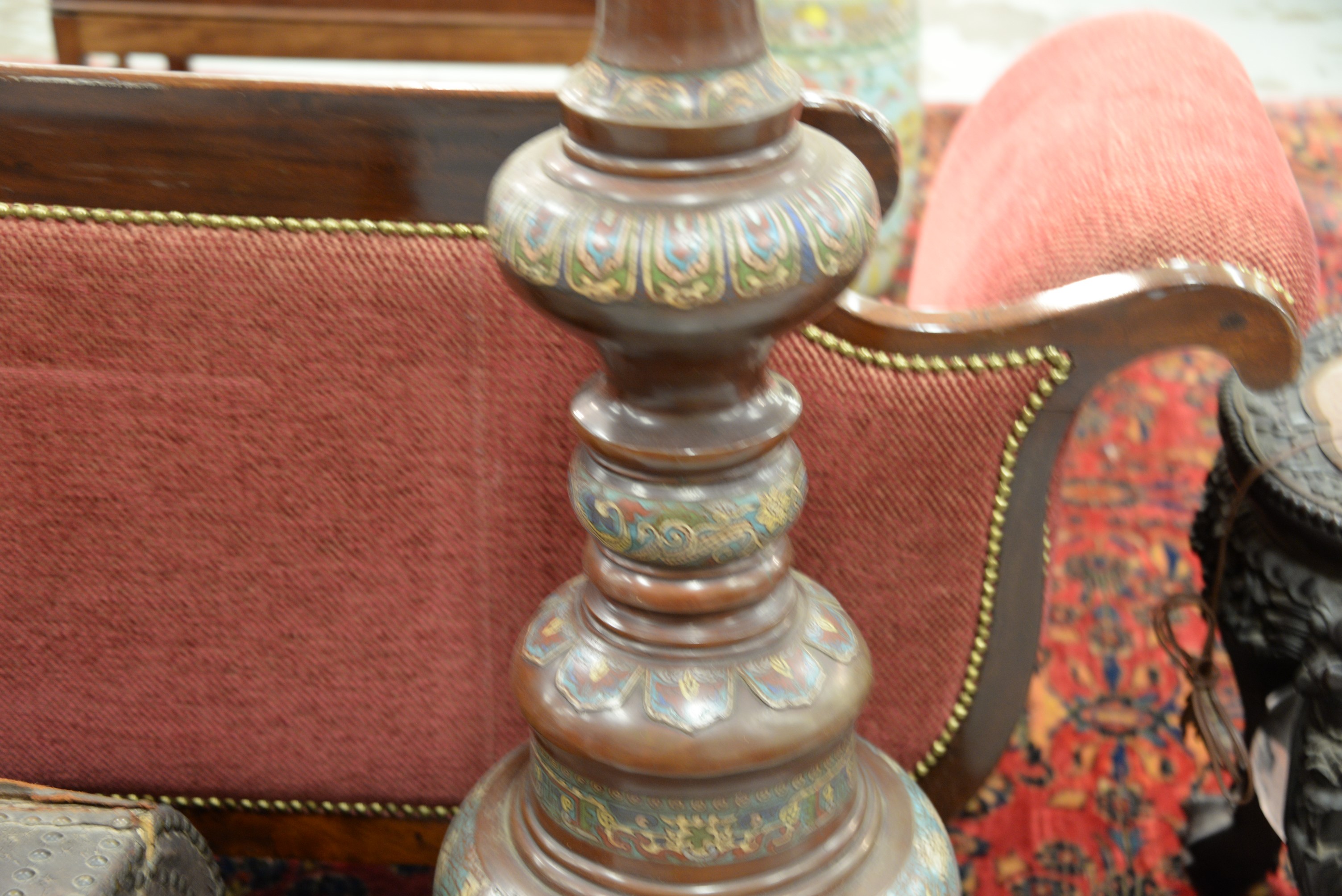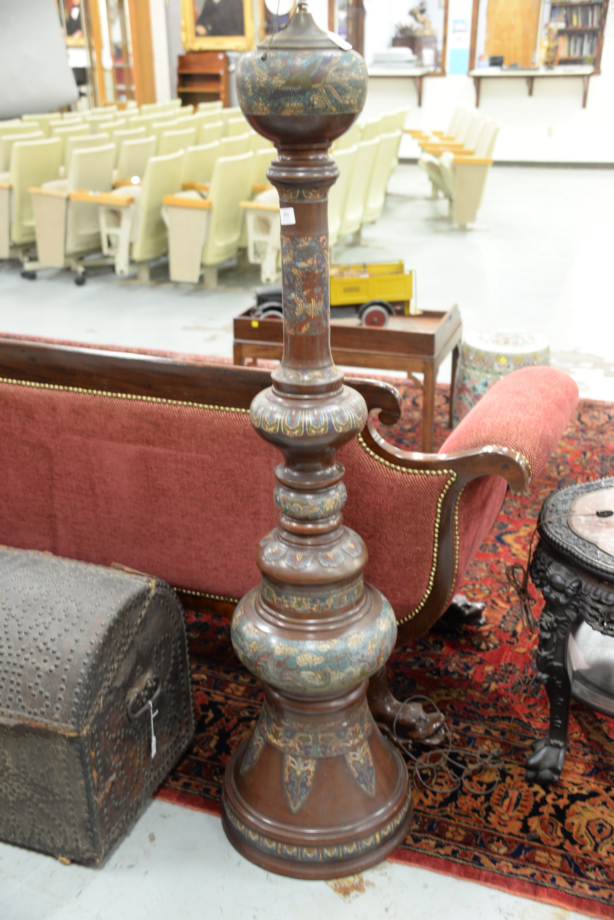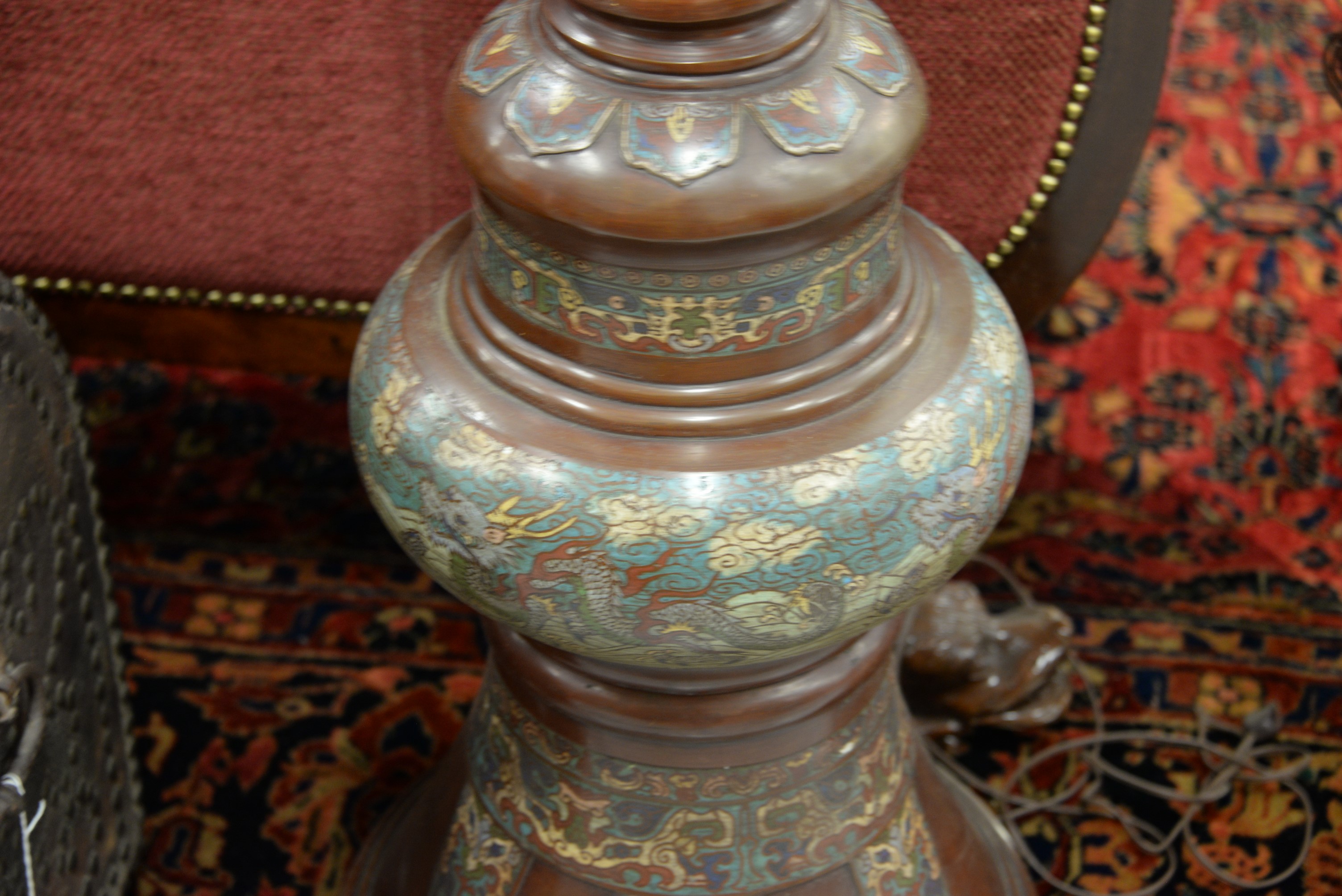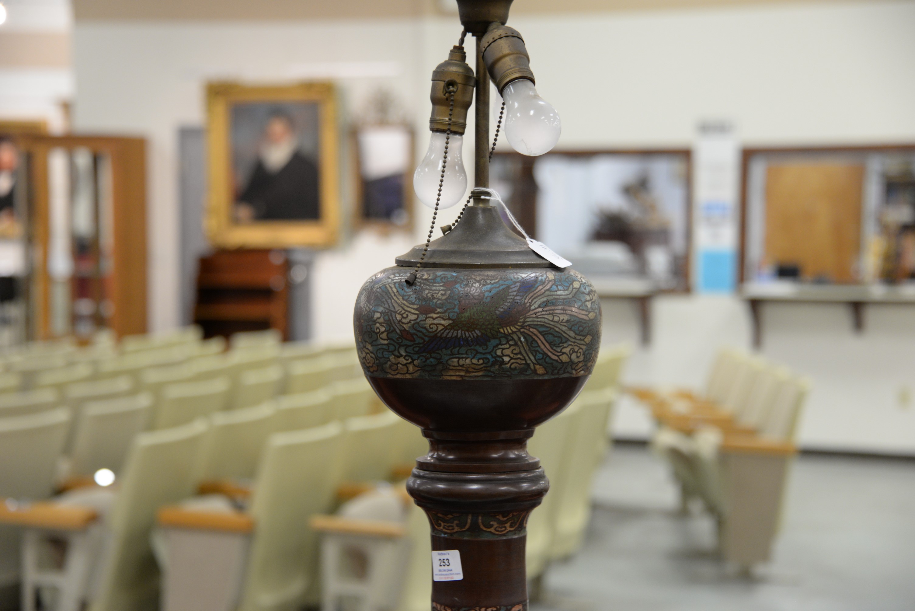 Lot 253: Champleve bronze floor lamp having phoenix bird, dragon, and immortal figure motif. ht. 73 in.