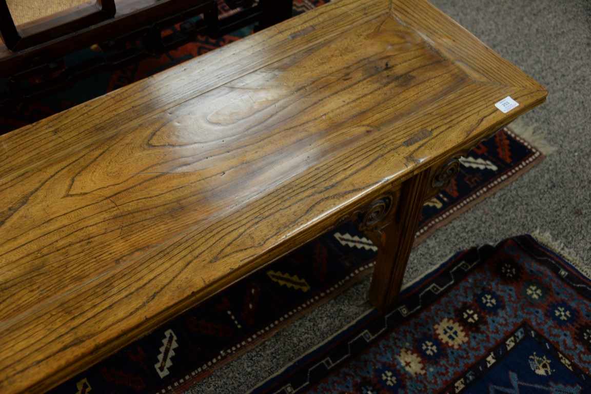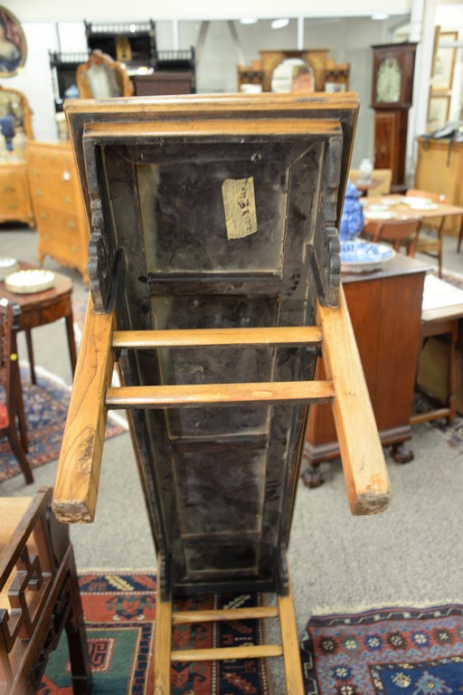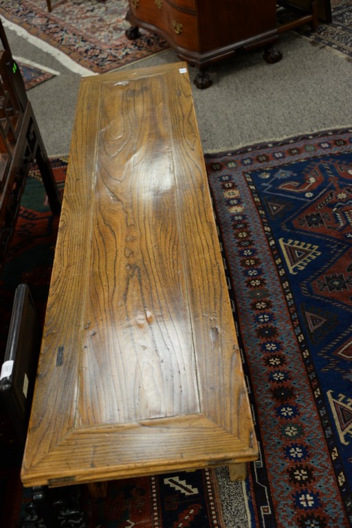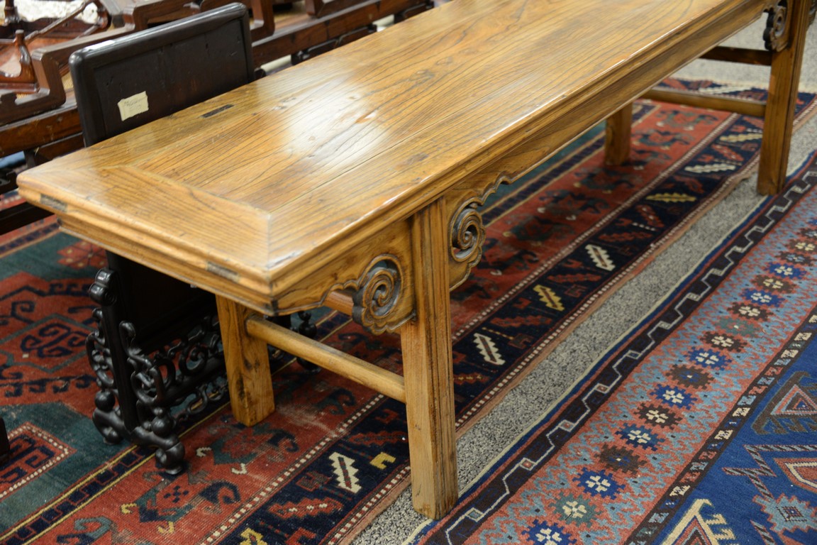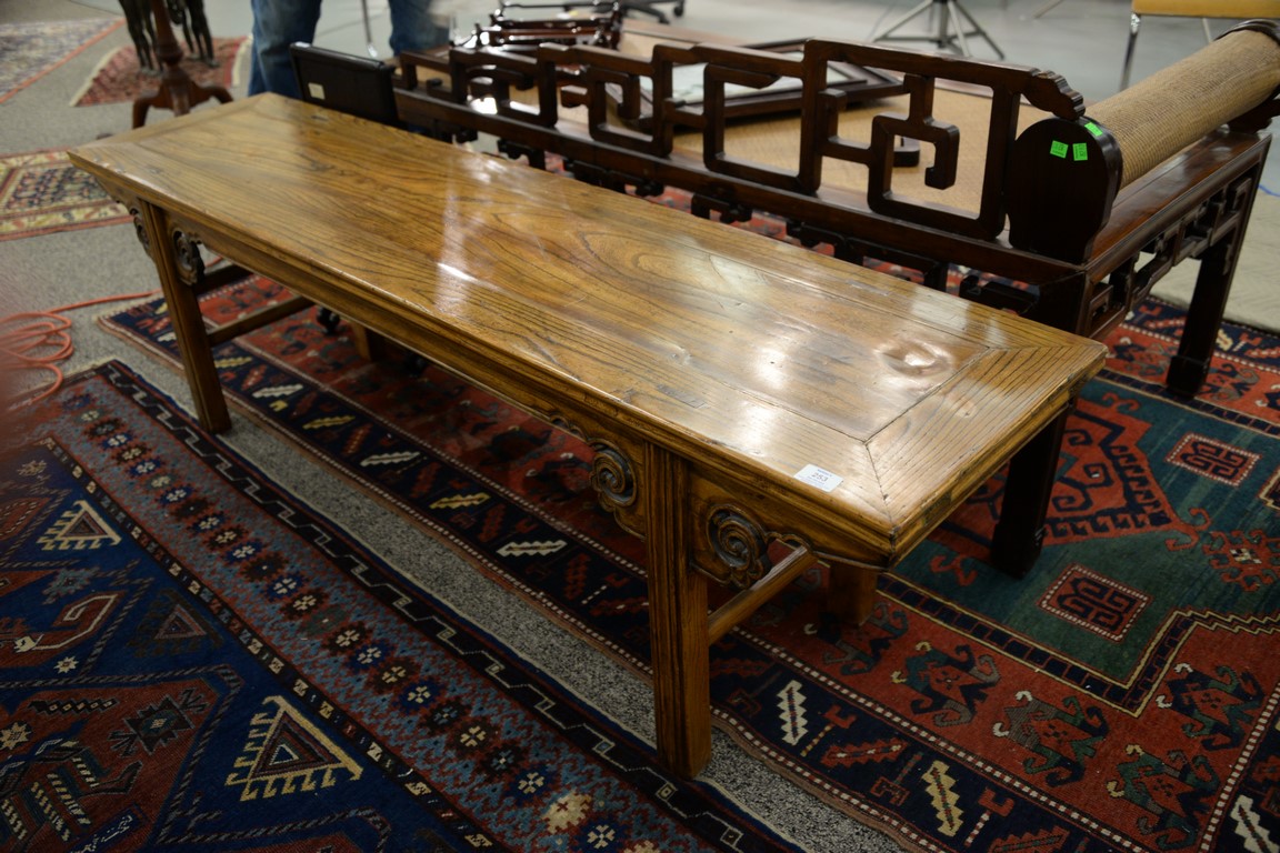 Lot 253: Chinese table with rectangular top over carved skirt and molded square legs. height 20 1/2 inches, top: 17 x 70