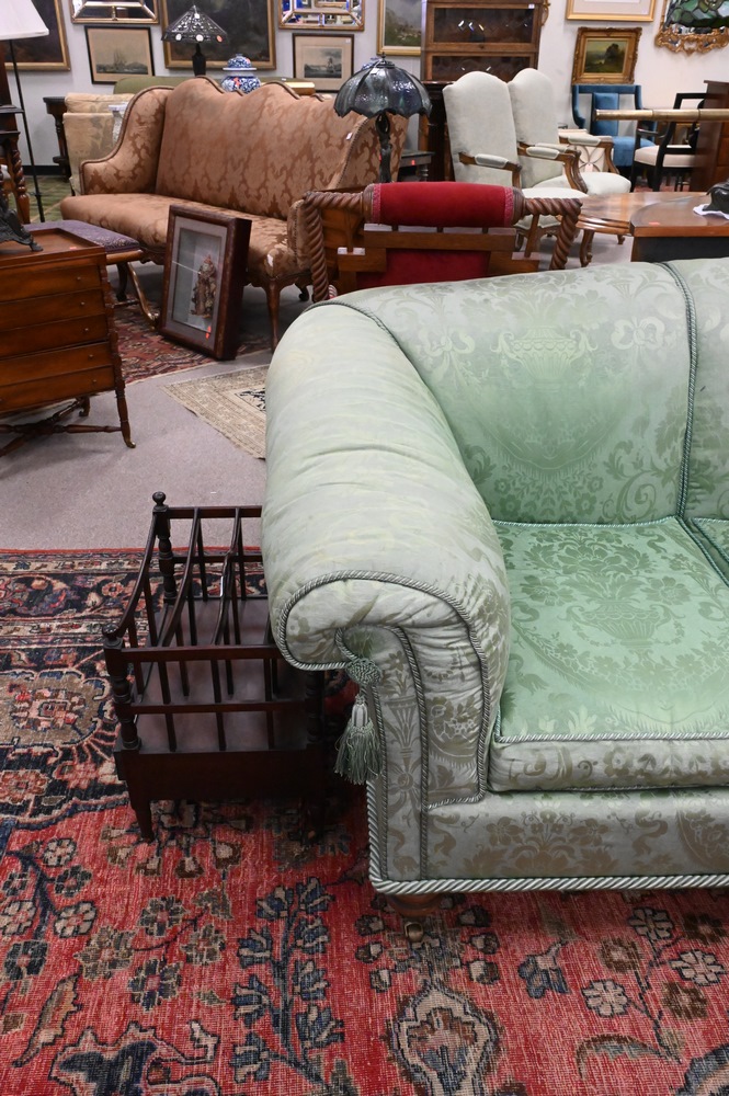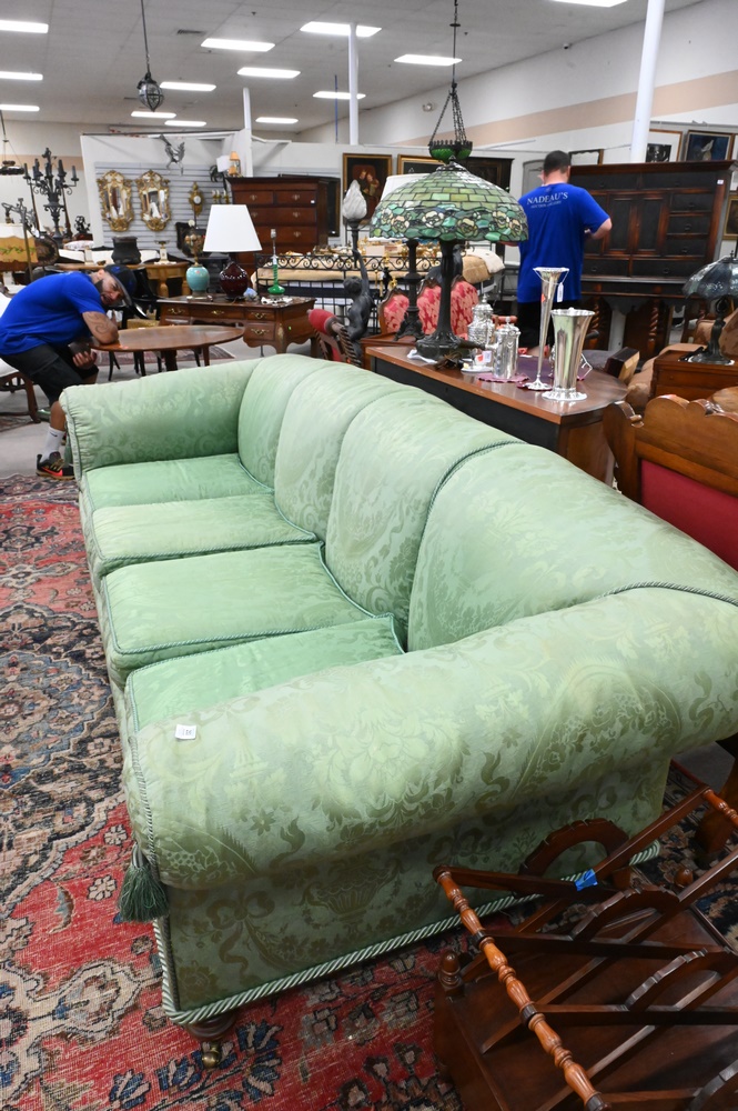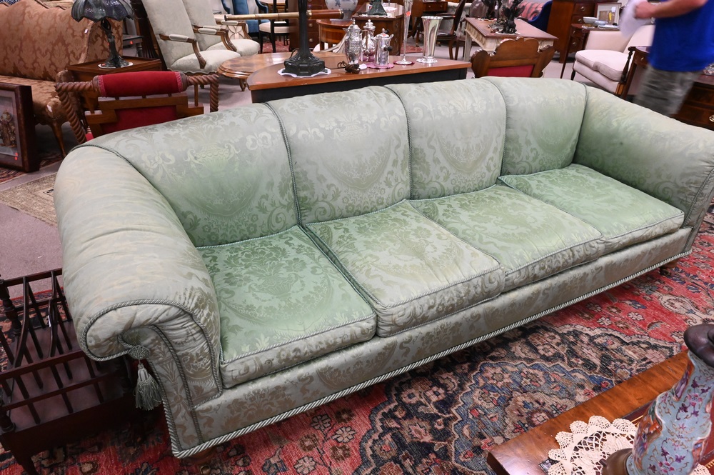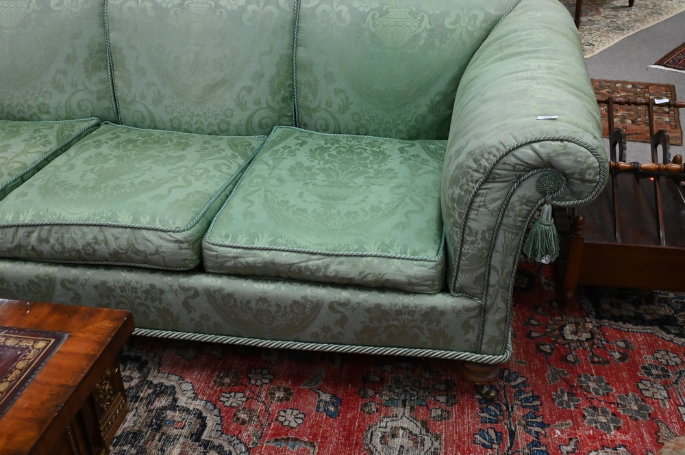 Custom Sofa Attributed to George Smith, having custom upholstery and four seat cushions, height 31 inches, length 104 inches.
