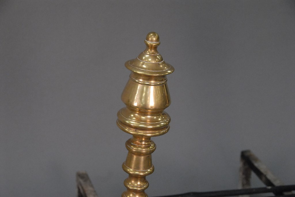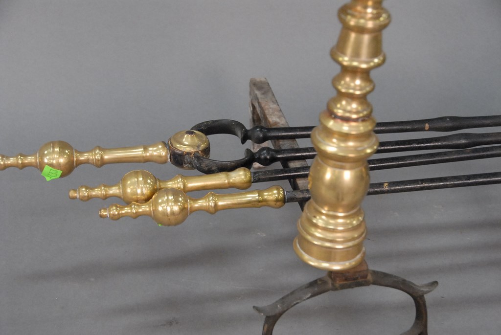 Lot 253: Five piece lot to include a pair of Federal brass andirons and three brass top fire tools. andirons: ht. 20in. tools: ht. 30in. Prov…