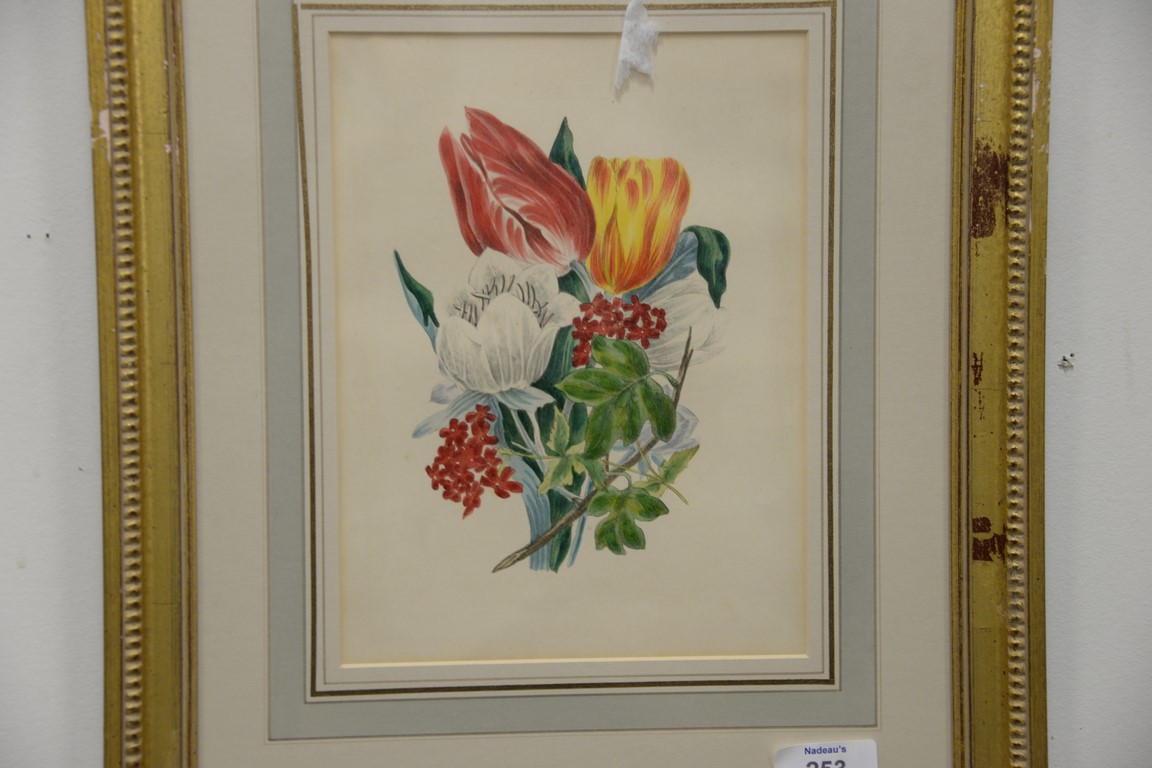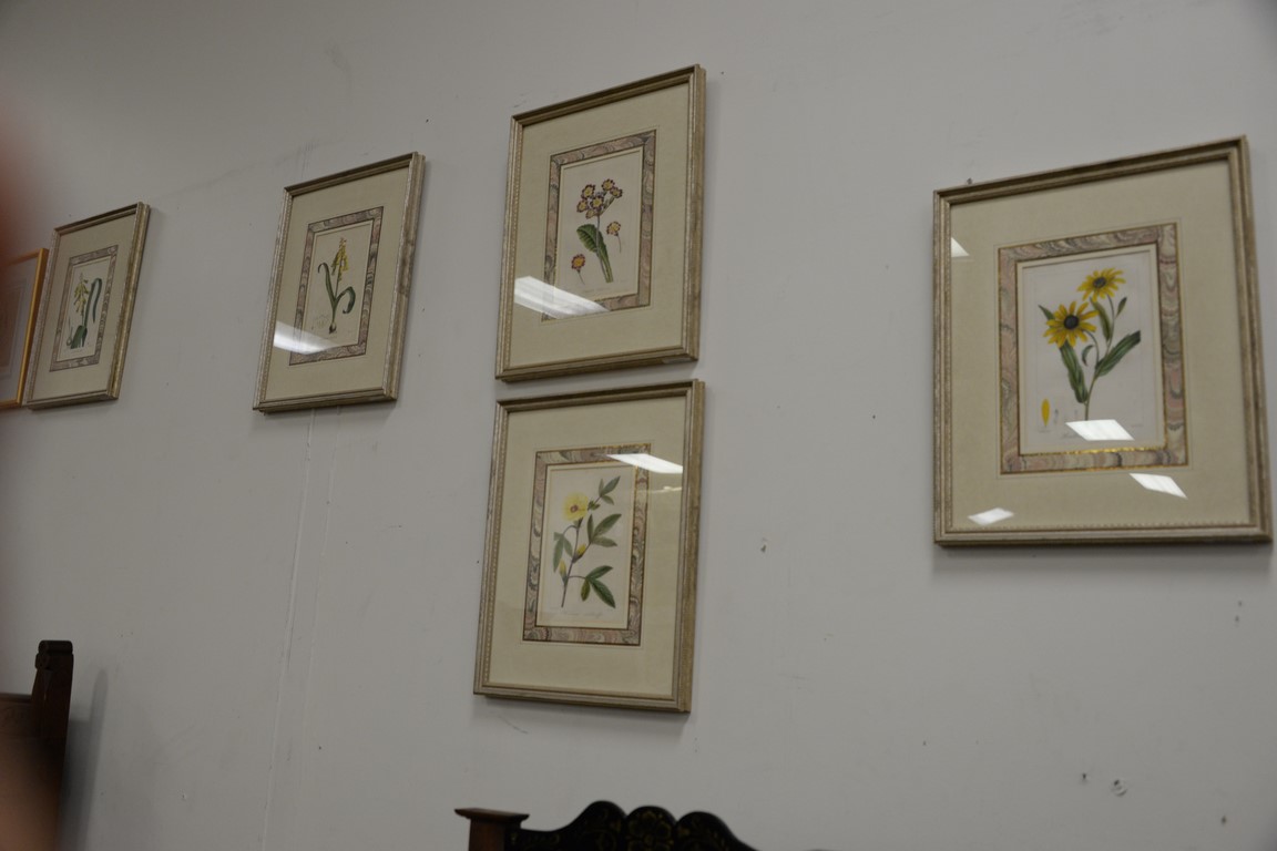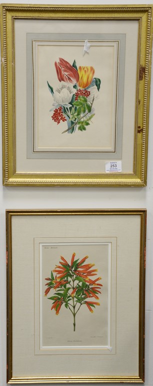 Lot 253: Group of eight framed engravings and lithographs to include seven handcolored flower prints, two orange fruit colored etchings, sigh…