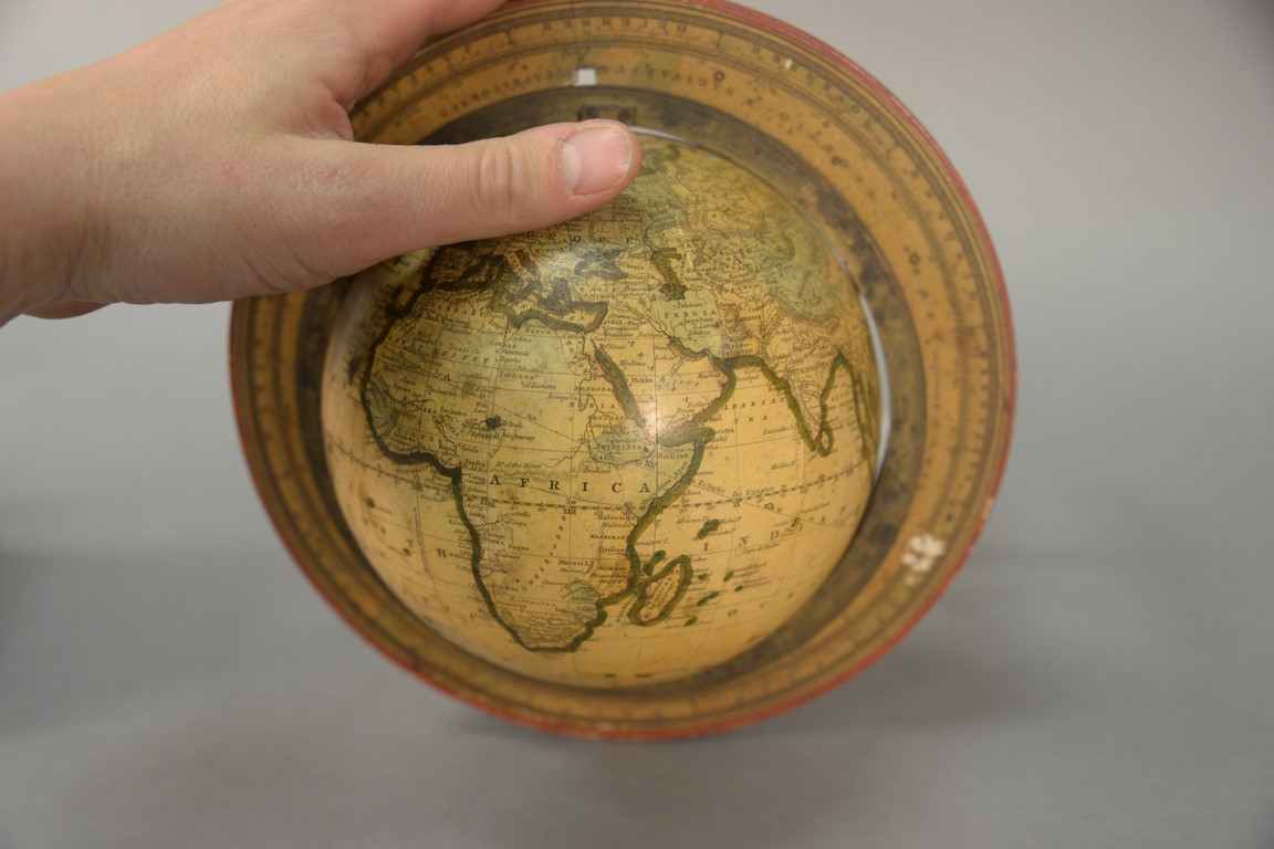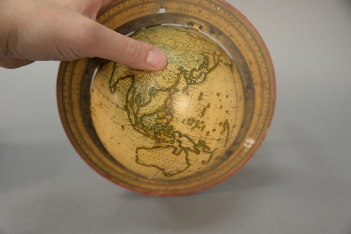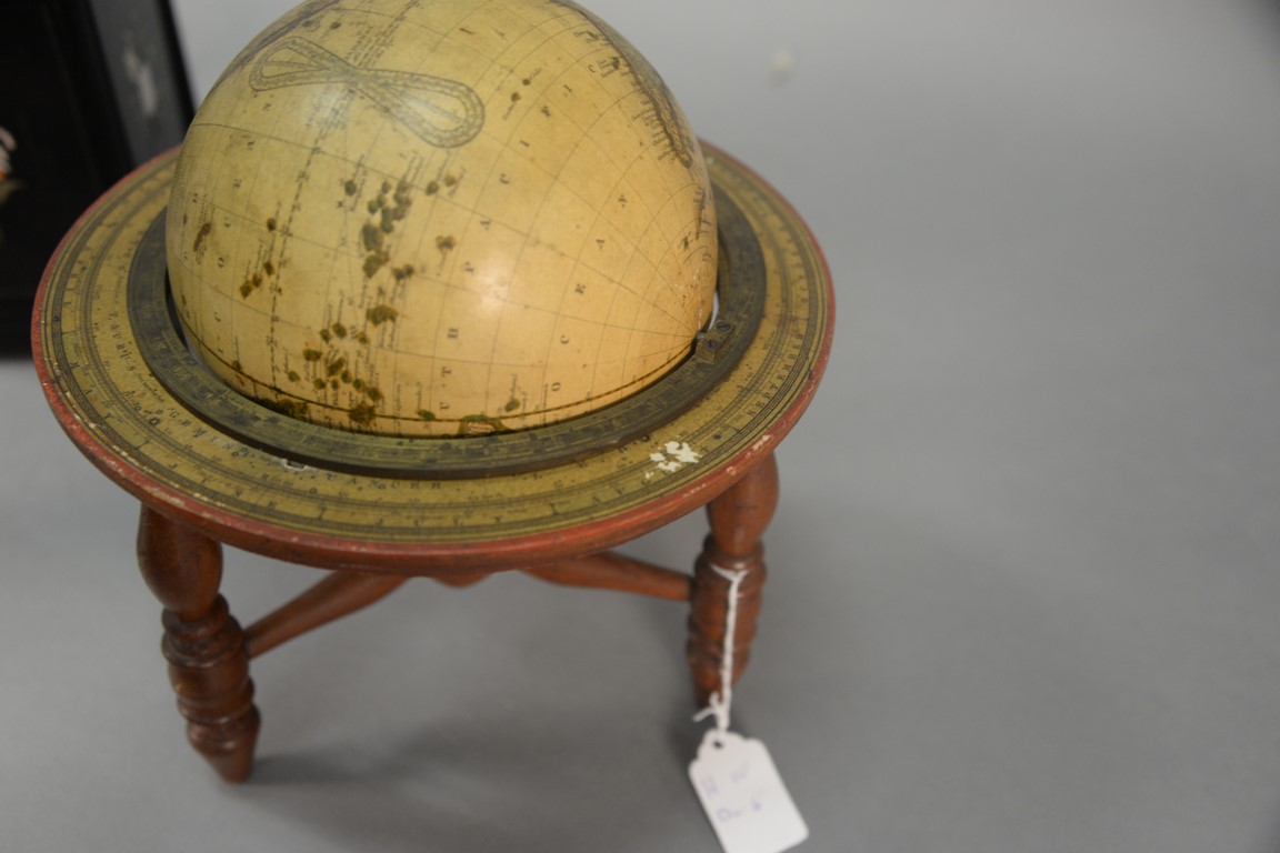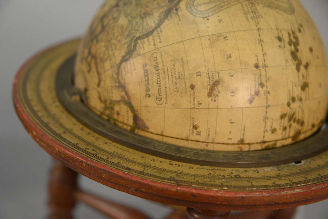 Lot 253: Joslins Terrestrial table globe on stand with turned legs, marked: Boston 1844. crack in globe dia. 6in.
