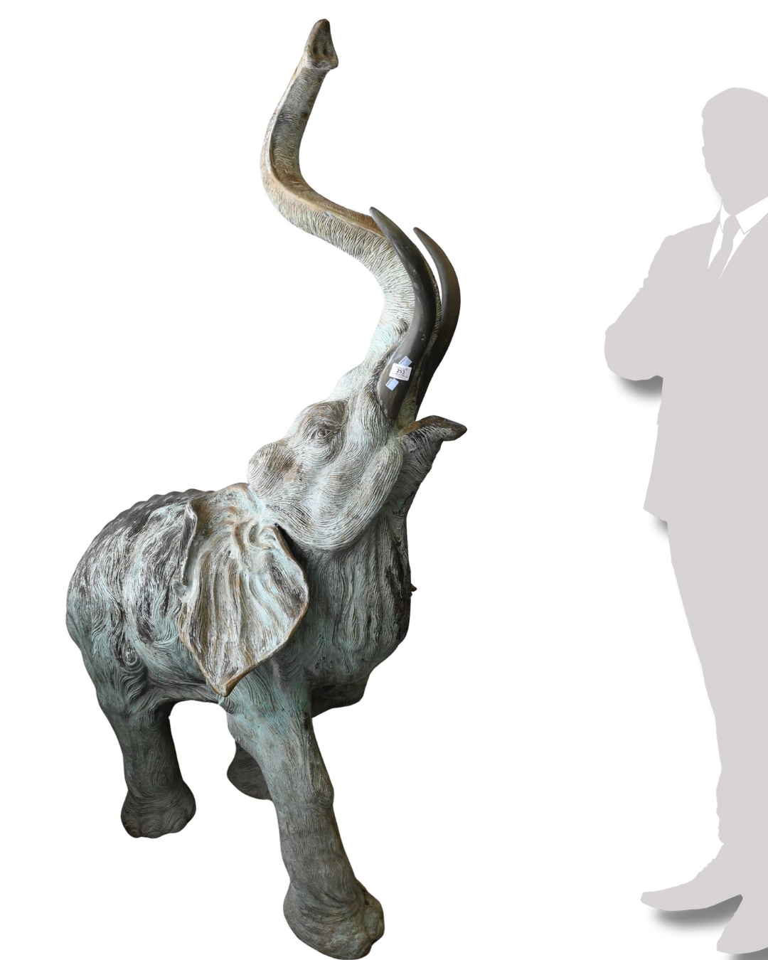 having raised trunk, in green verdigris patina and stylized textured body (tip of tail broken off, pieces available)