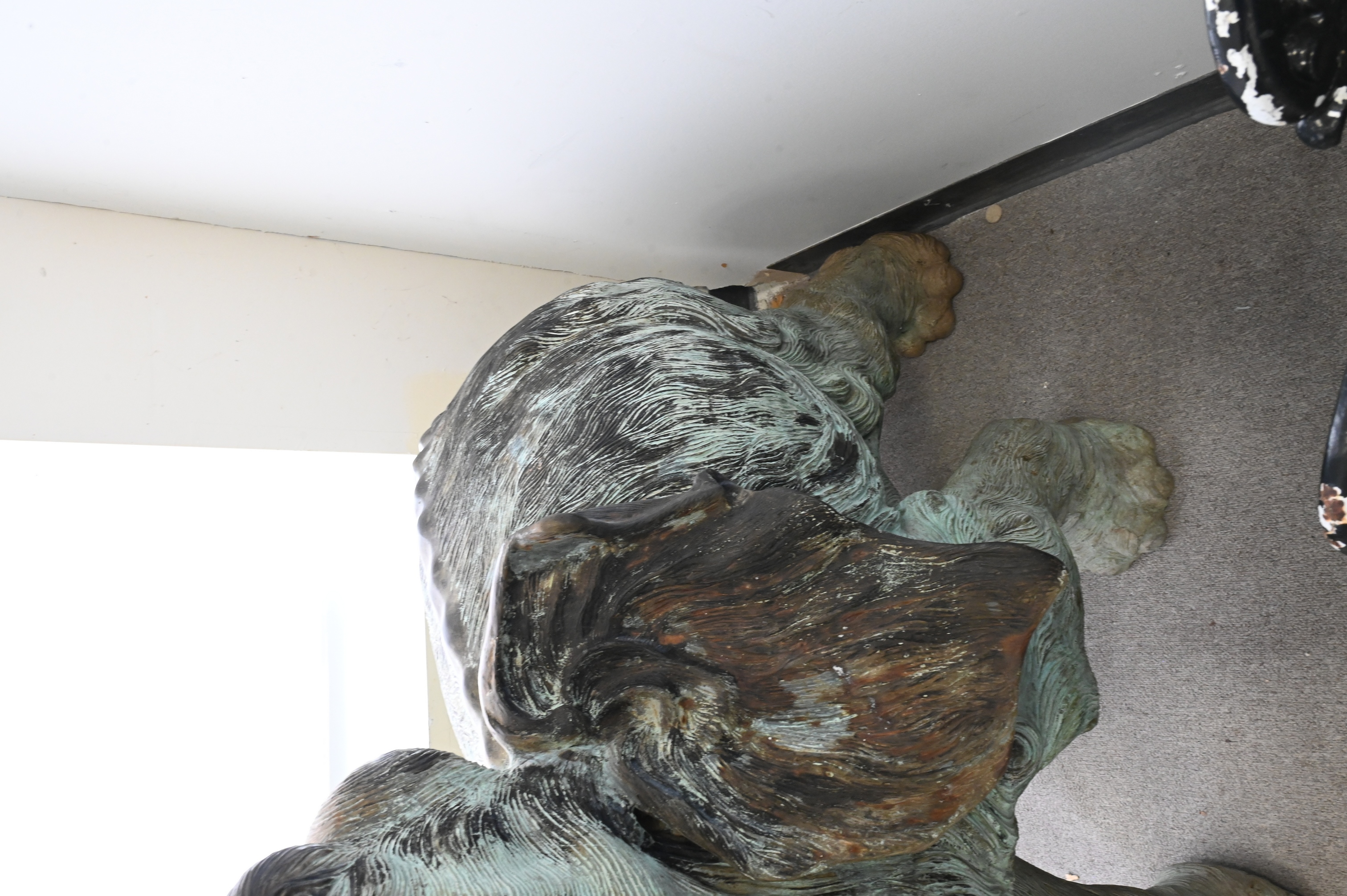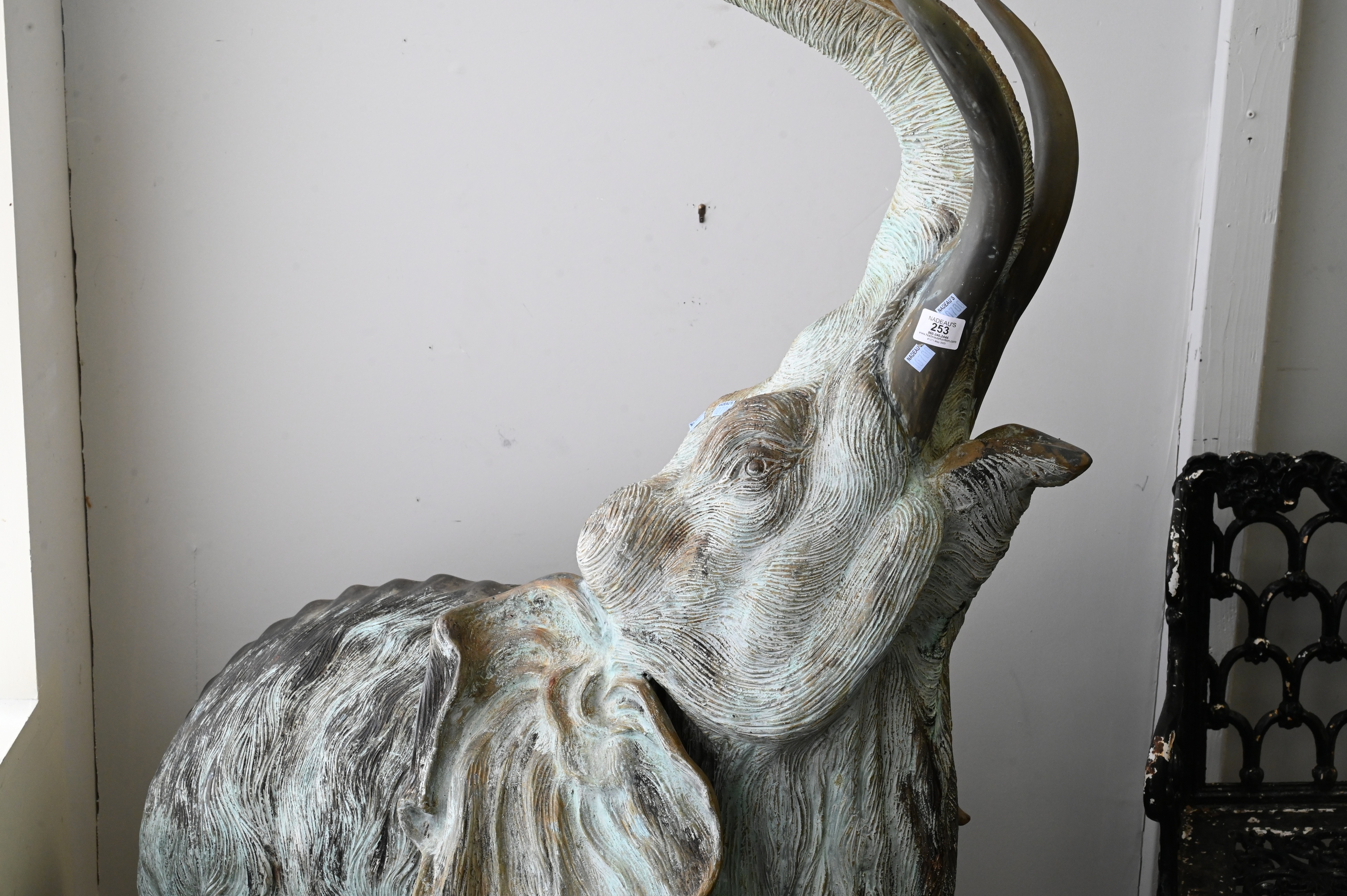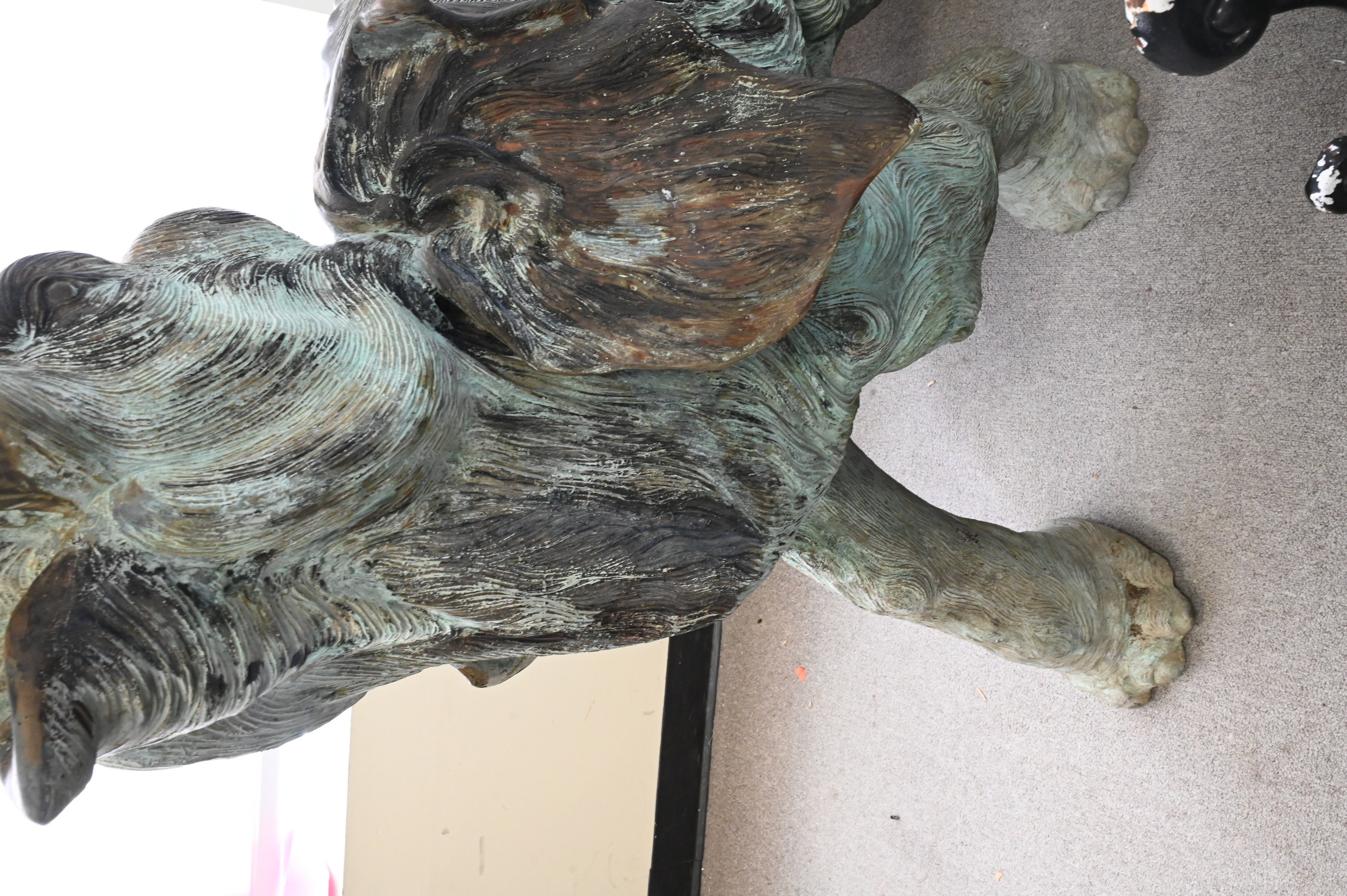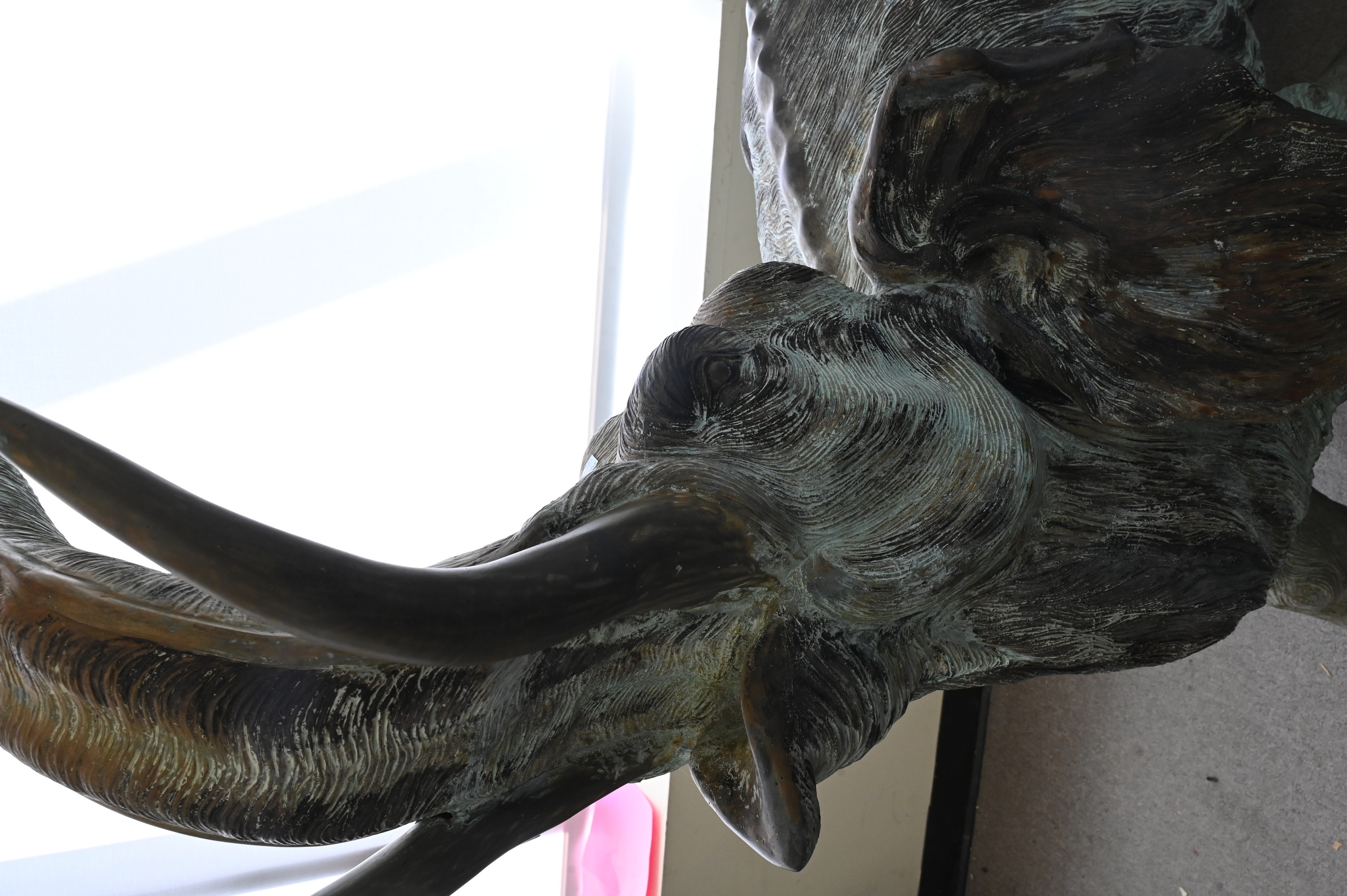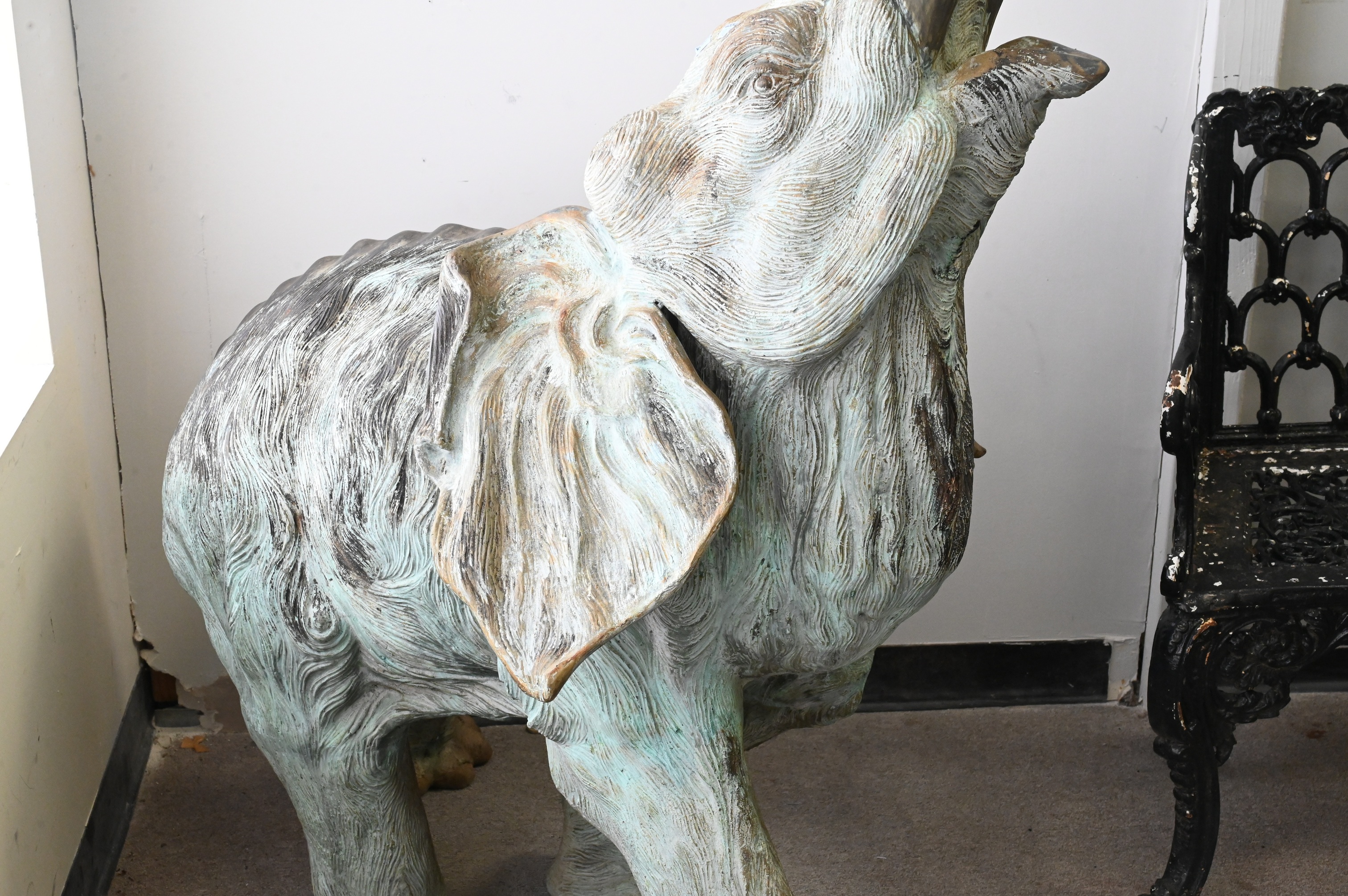 having raised trunk, in green verdigris patina and stylized textured body (tip of tail broken off, pieces available)