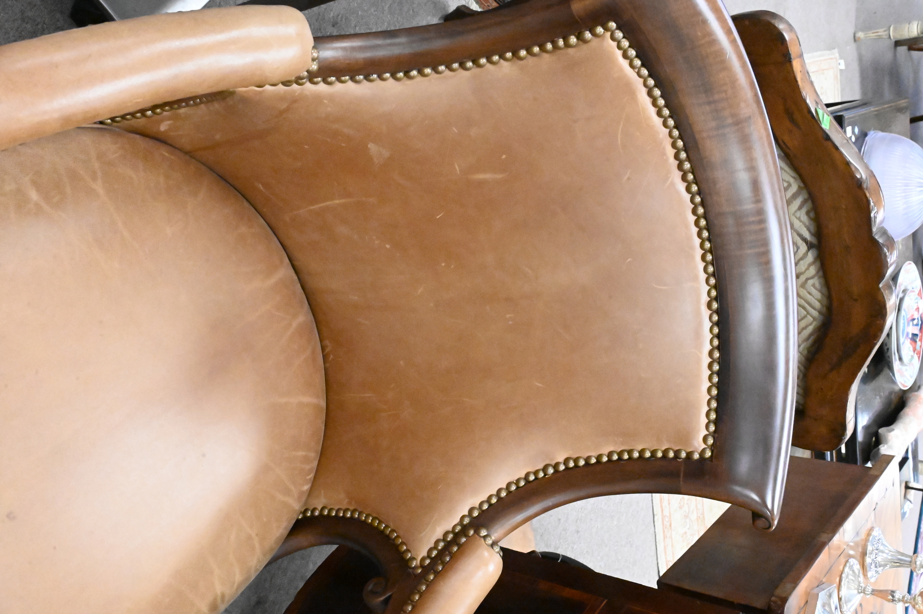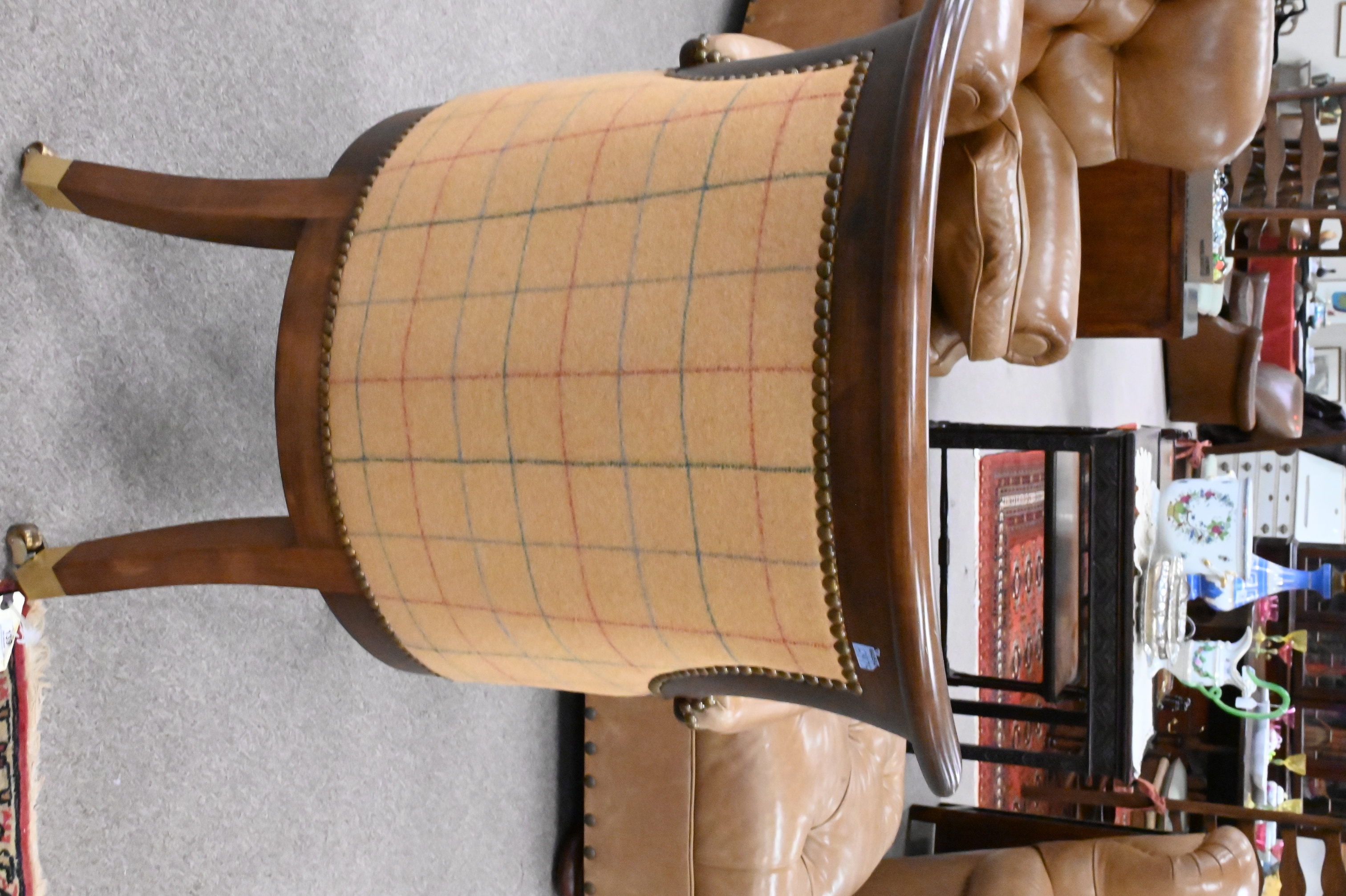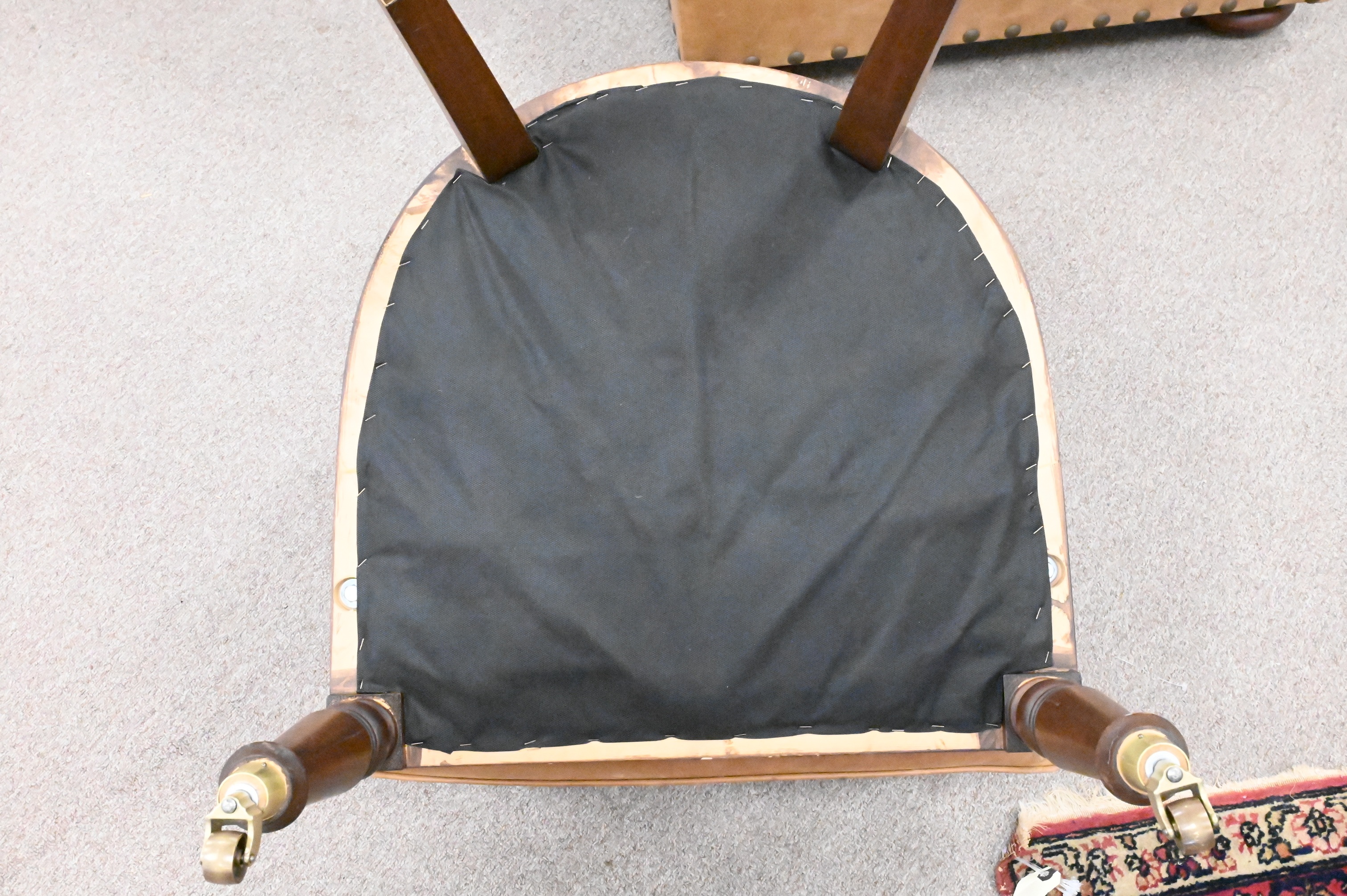 having leather upholstery and brass capped feet