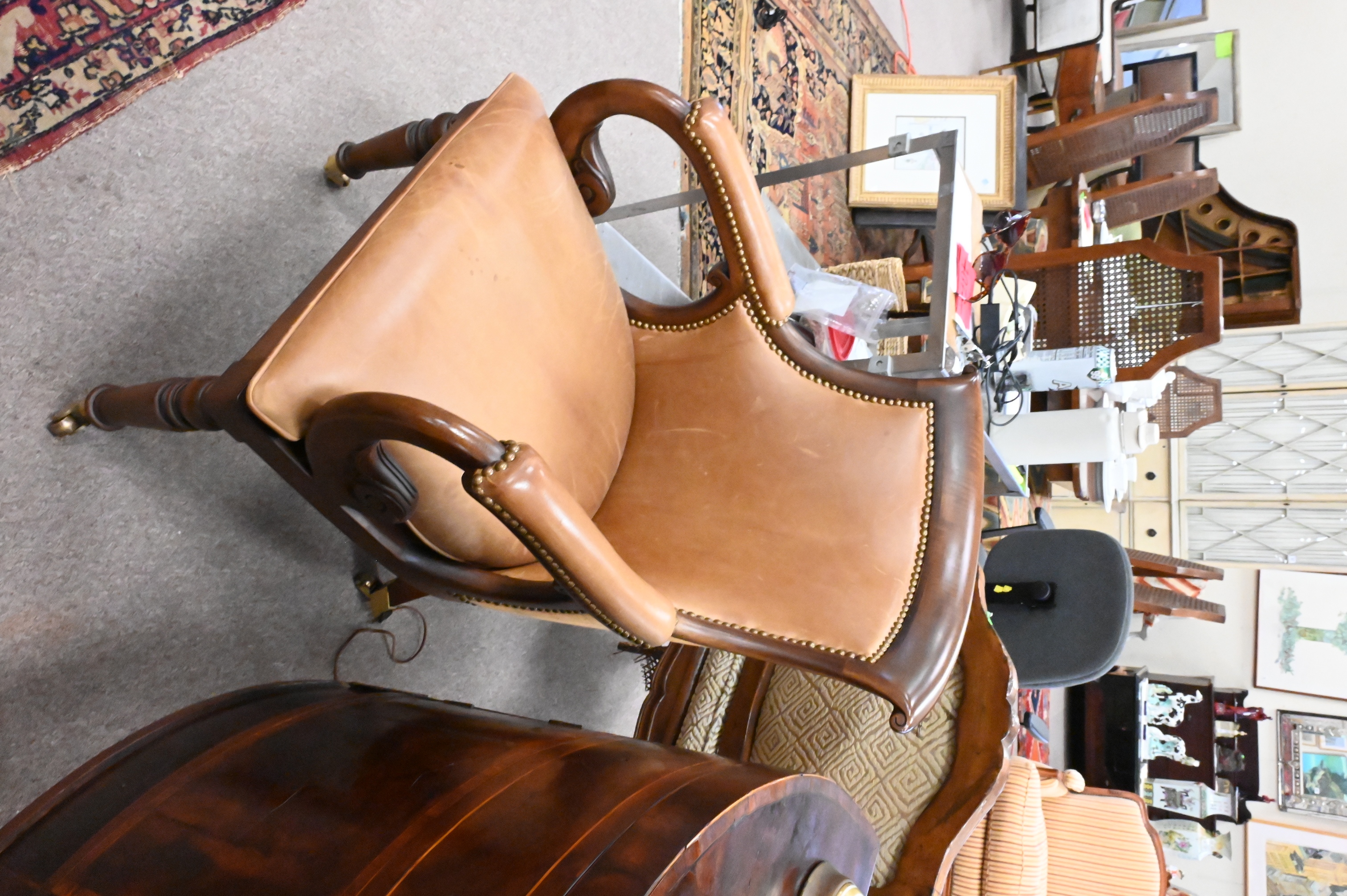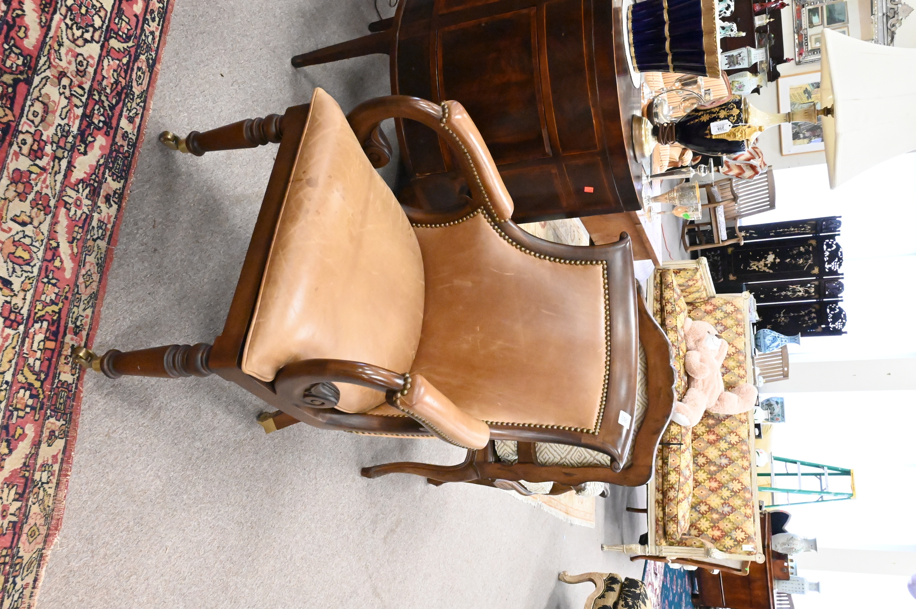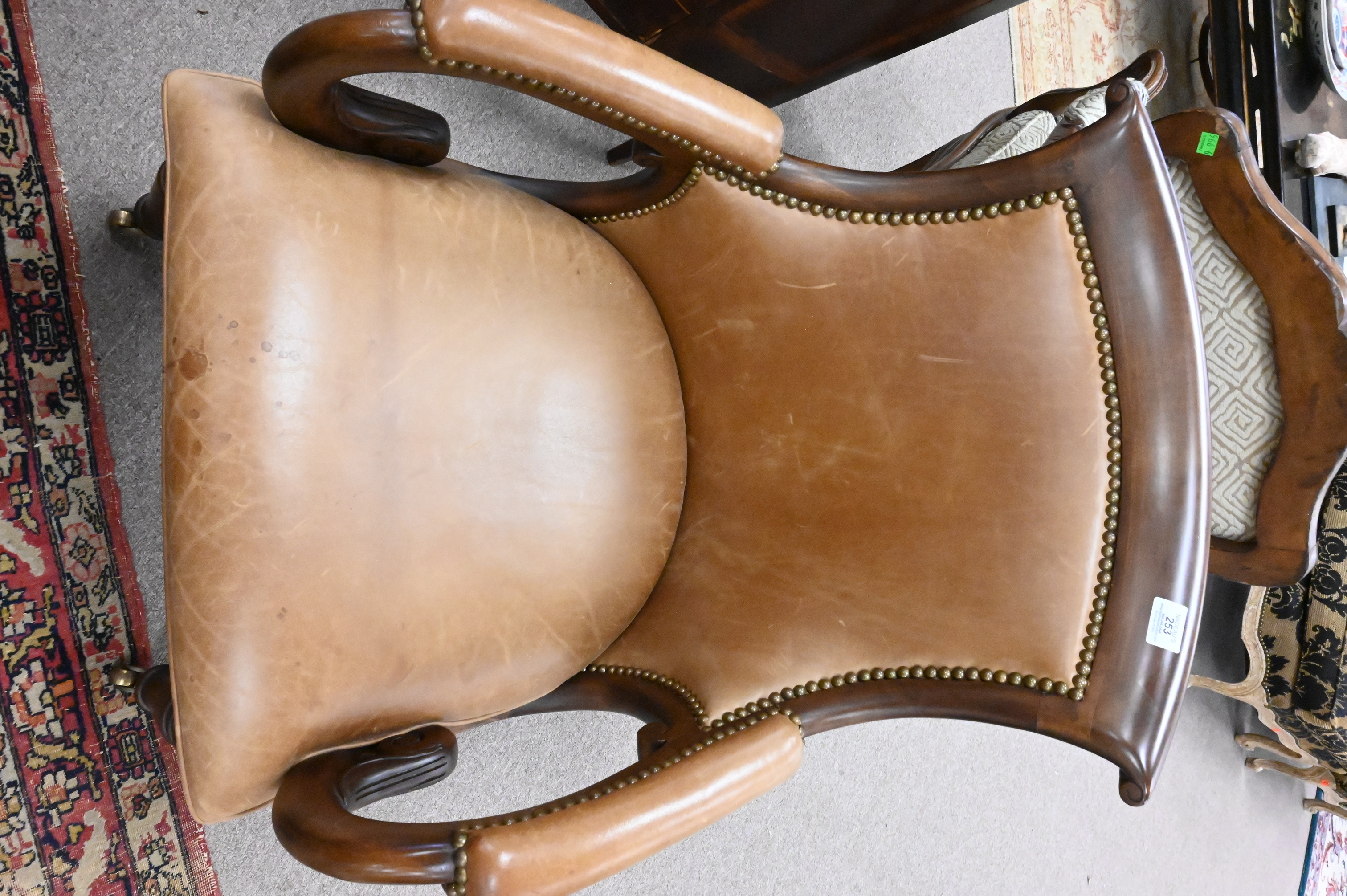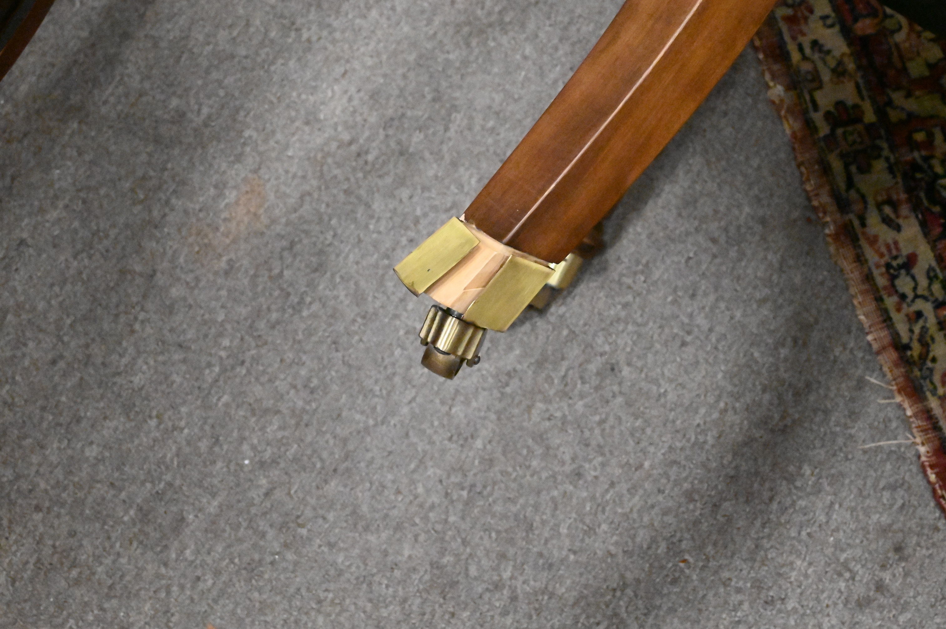 having leather upholstery and brass capped feet
