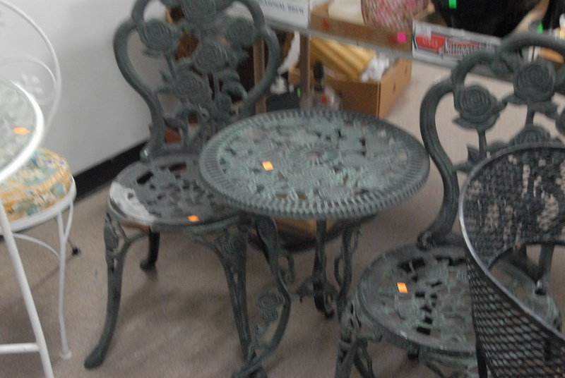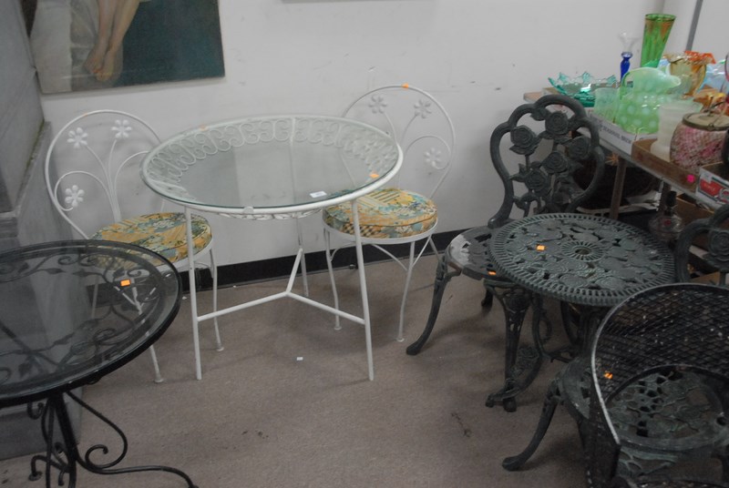 Lot 253: Seven piece lot to include two iron glass top tables and two chairs, plus metal table and two chairs.