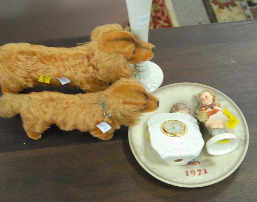 Lot 253: Small lot two Steiff dogs with metal tags and paper tags, 1971 Hummel plate, small Hummel, and two Lenox pieces including a clock.