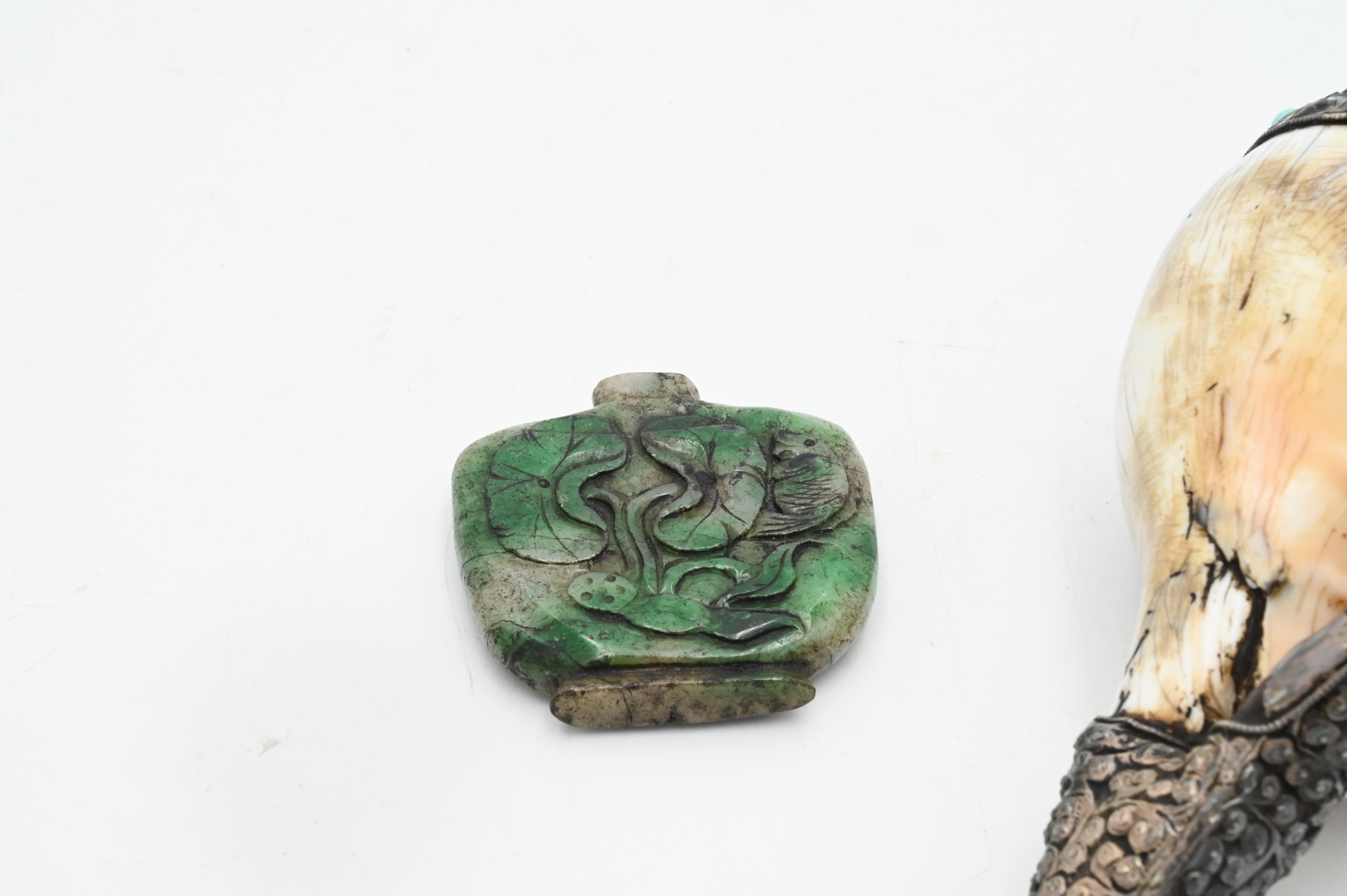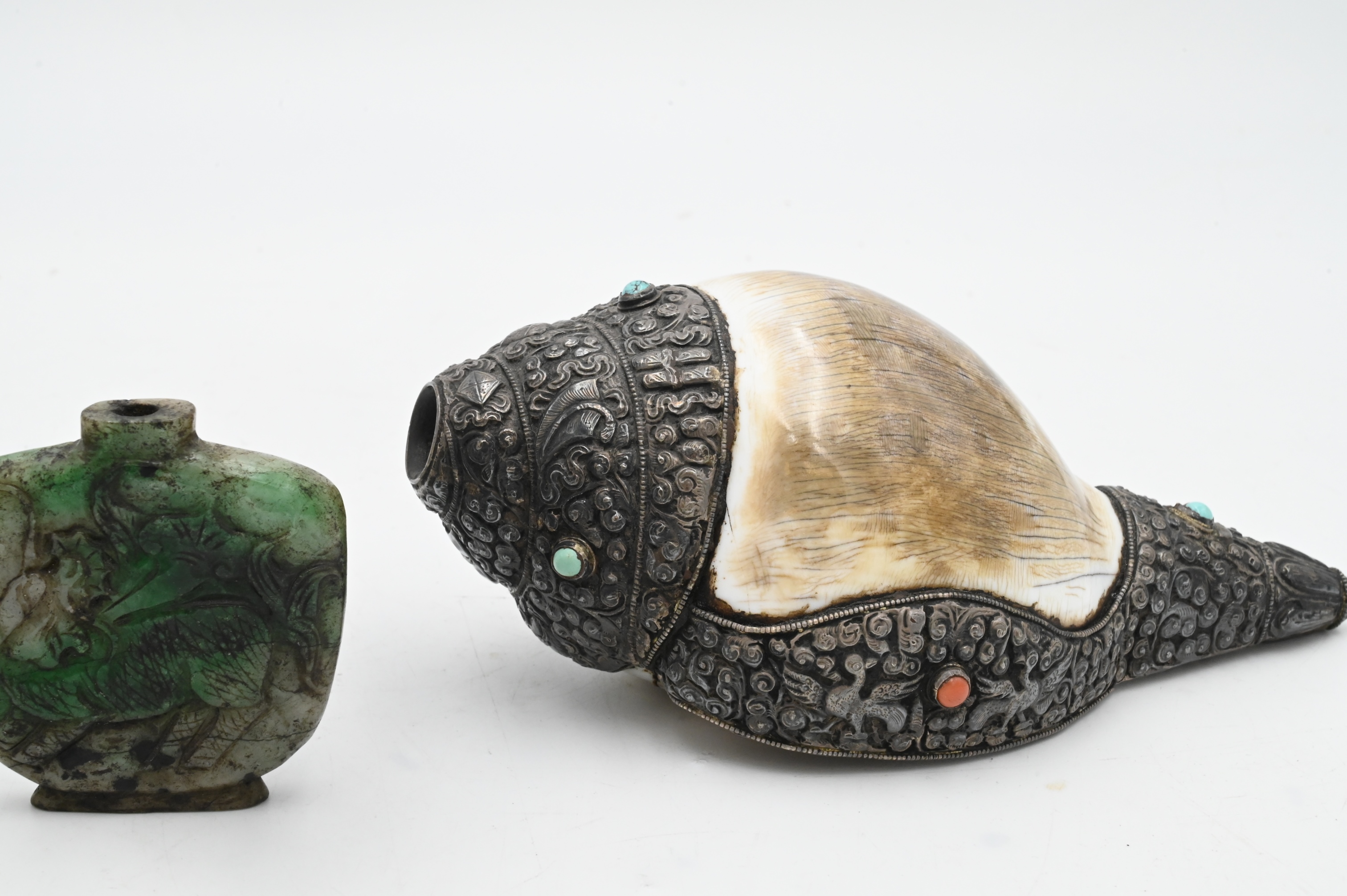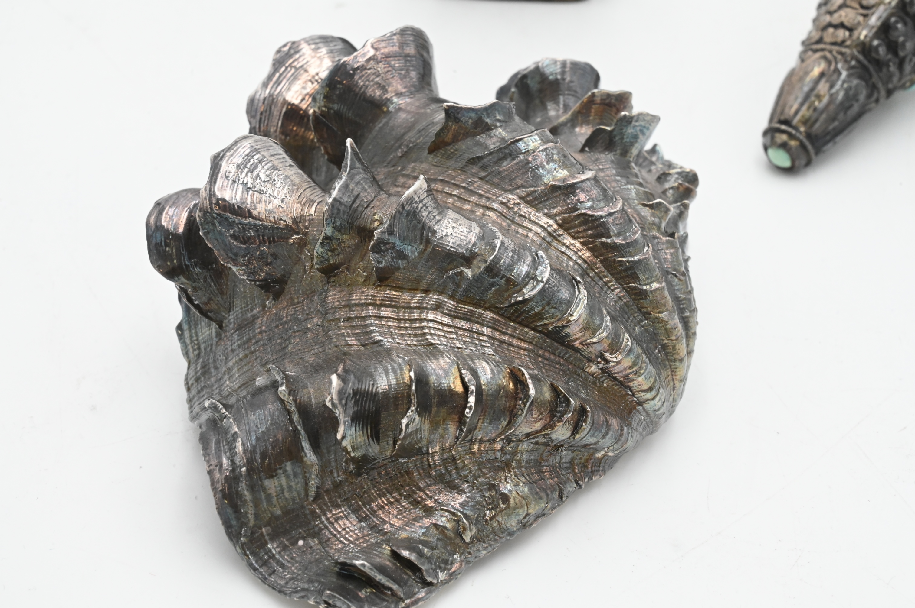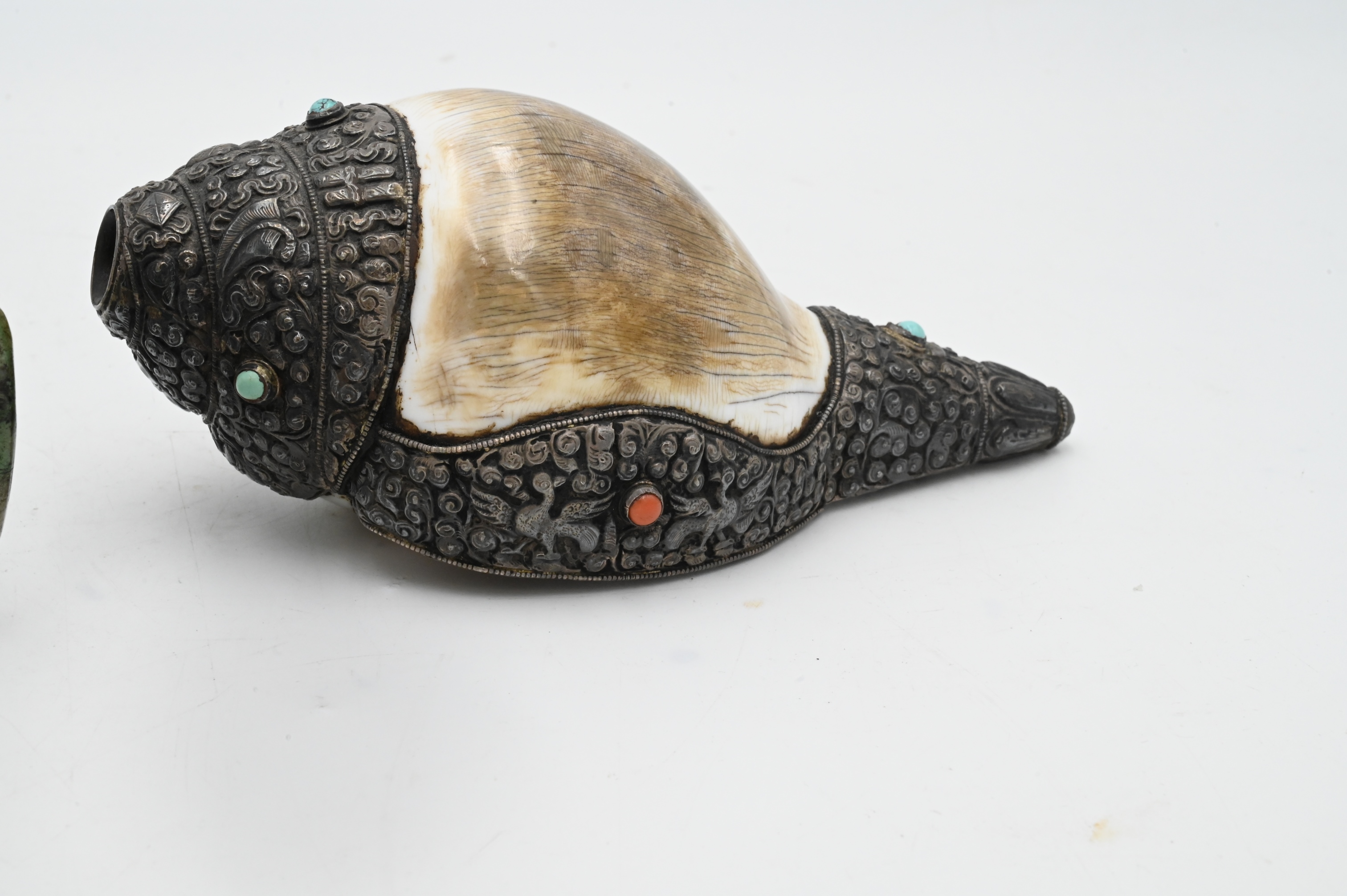 To include, a sterling silver overlaid oyster shell, a Tibetan silver overlay conch shell along with a carved hardstone piece.