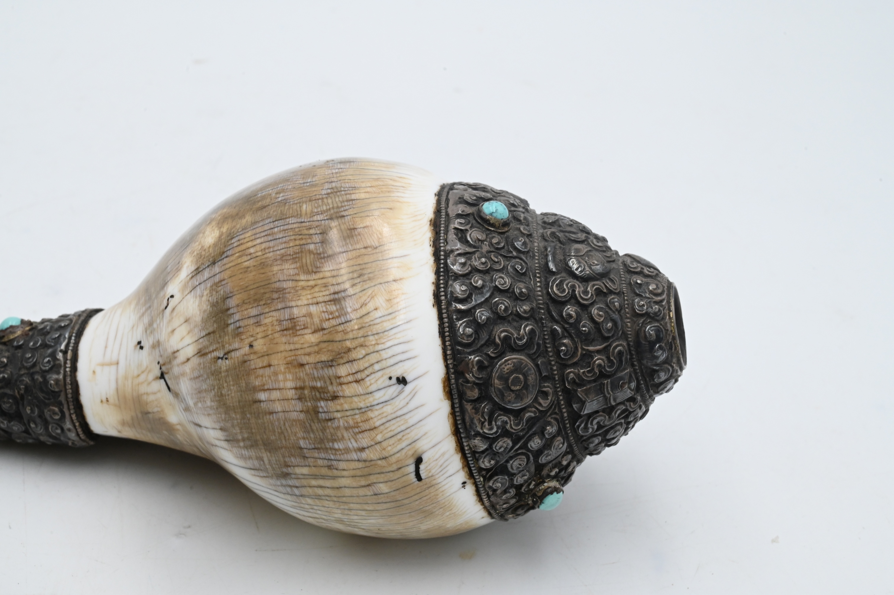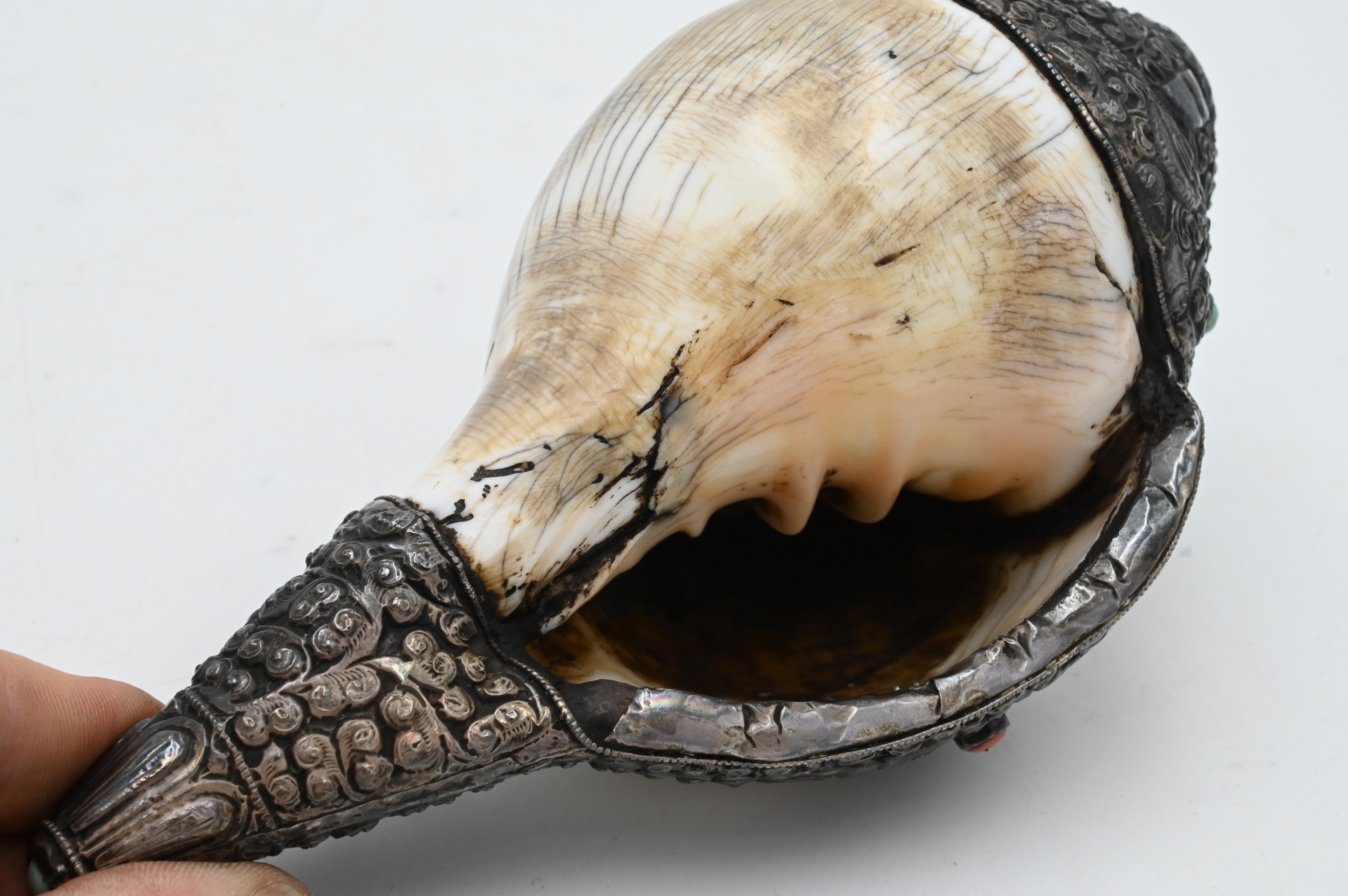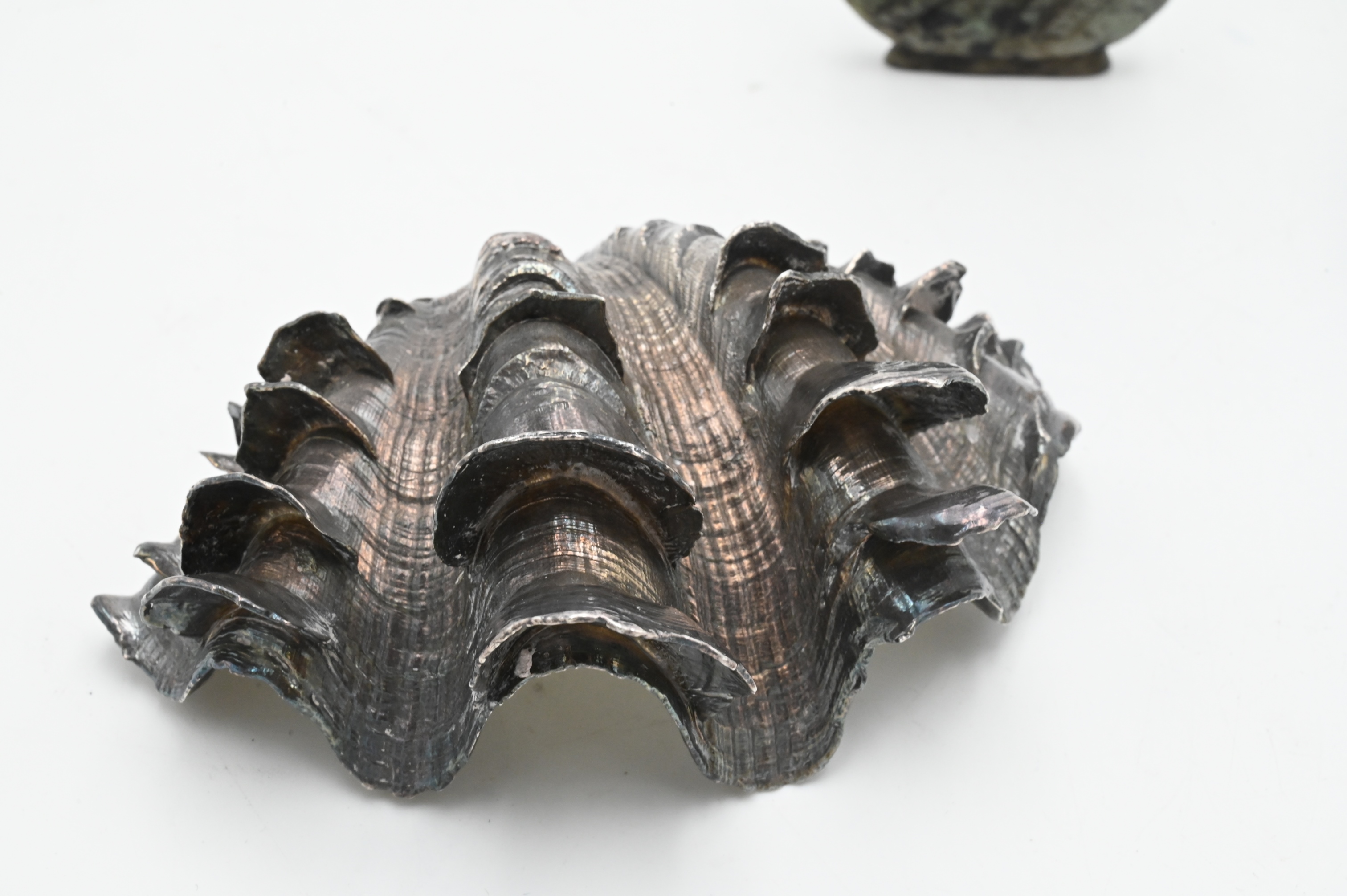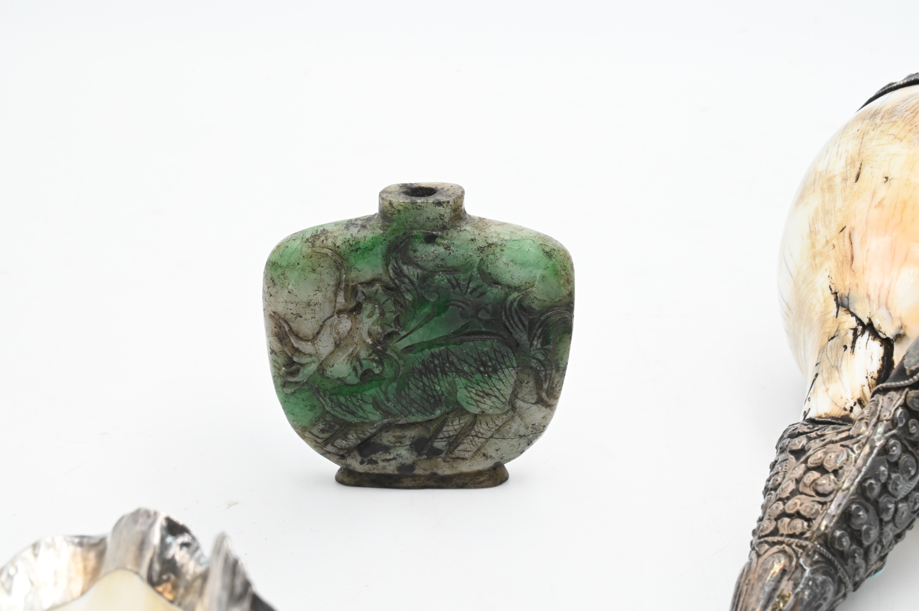 To include, a sterling silver overlaid oyster shell, a Tibetan silver overlay conch shell along with a carved hardstone piece.