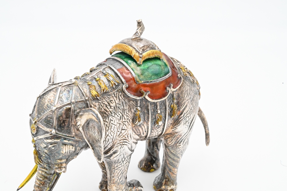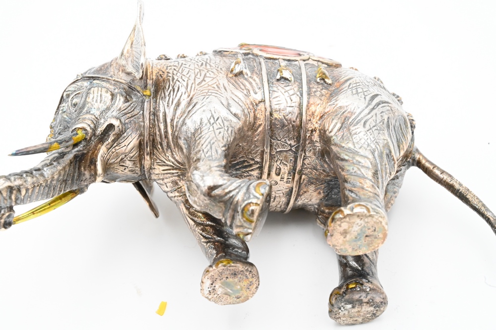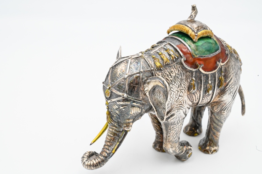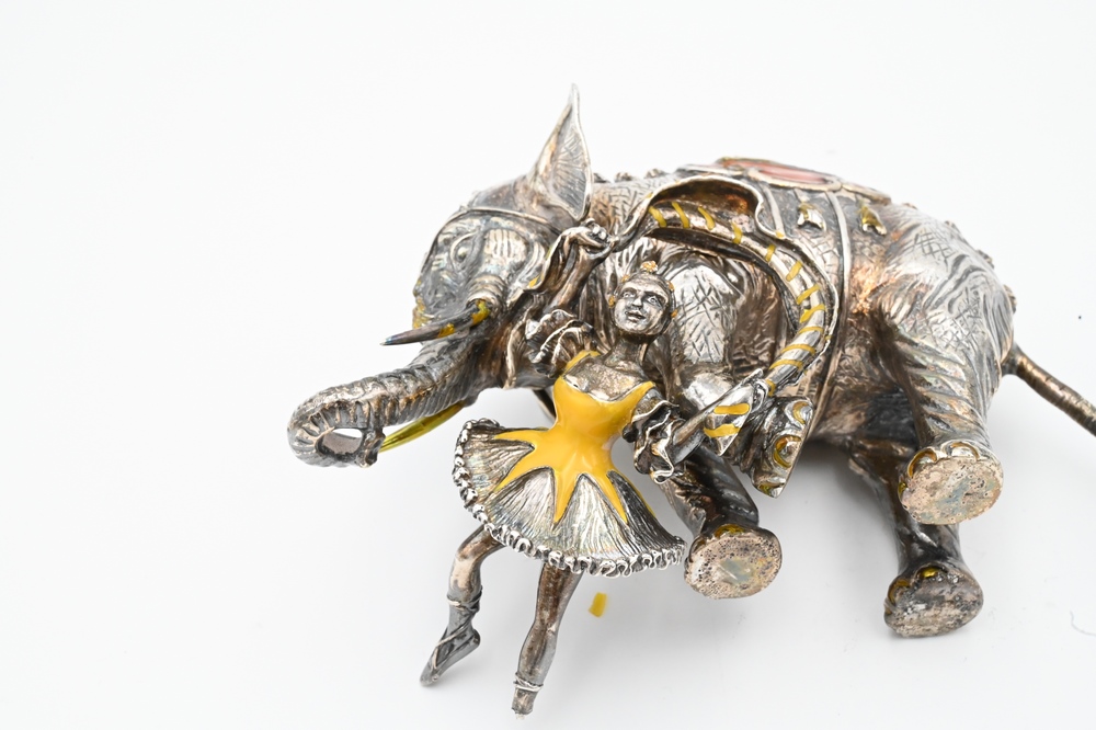 Lot 253: Tiffany & Company Sterling Silver Enameled Circus Elephant and Performer, designed by Gene Moore (1910 – 1998), enameled elephant wi…