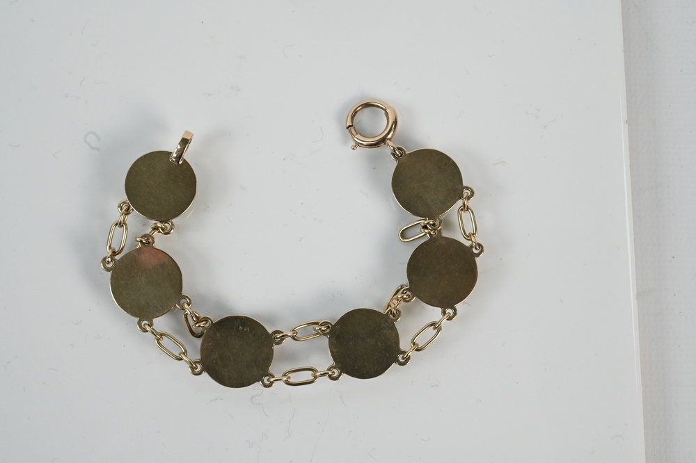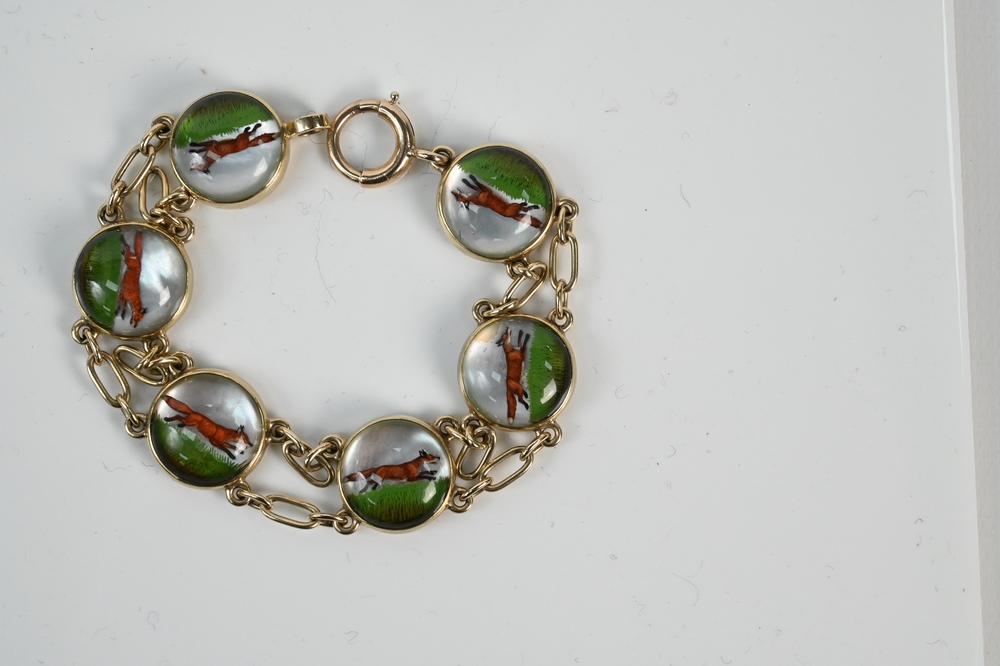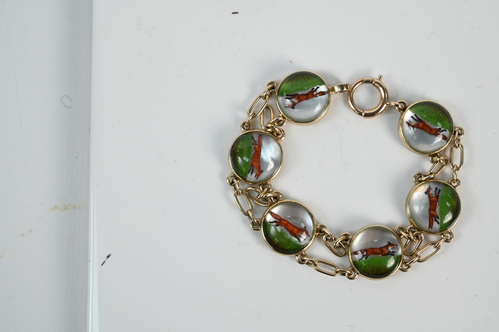 14 Karat Gold Bracelet, mounted with six circular crystals with running fox, length 7 inches, 24.9 grams total weight.