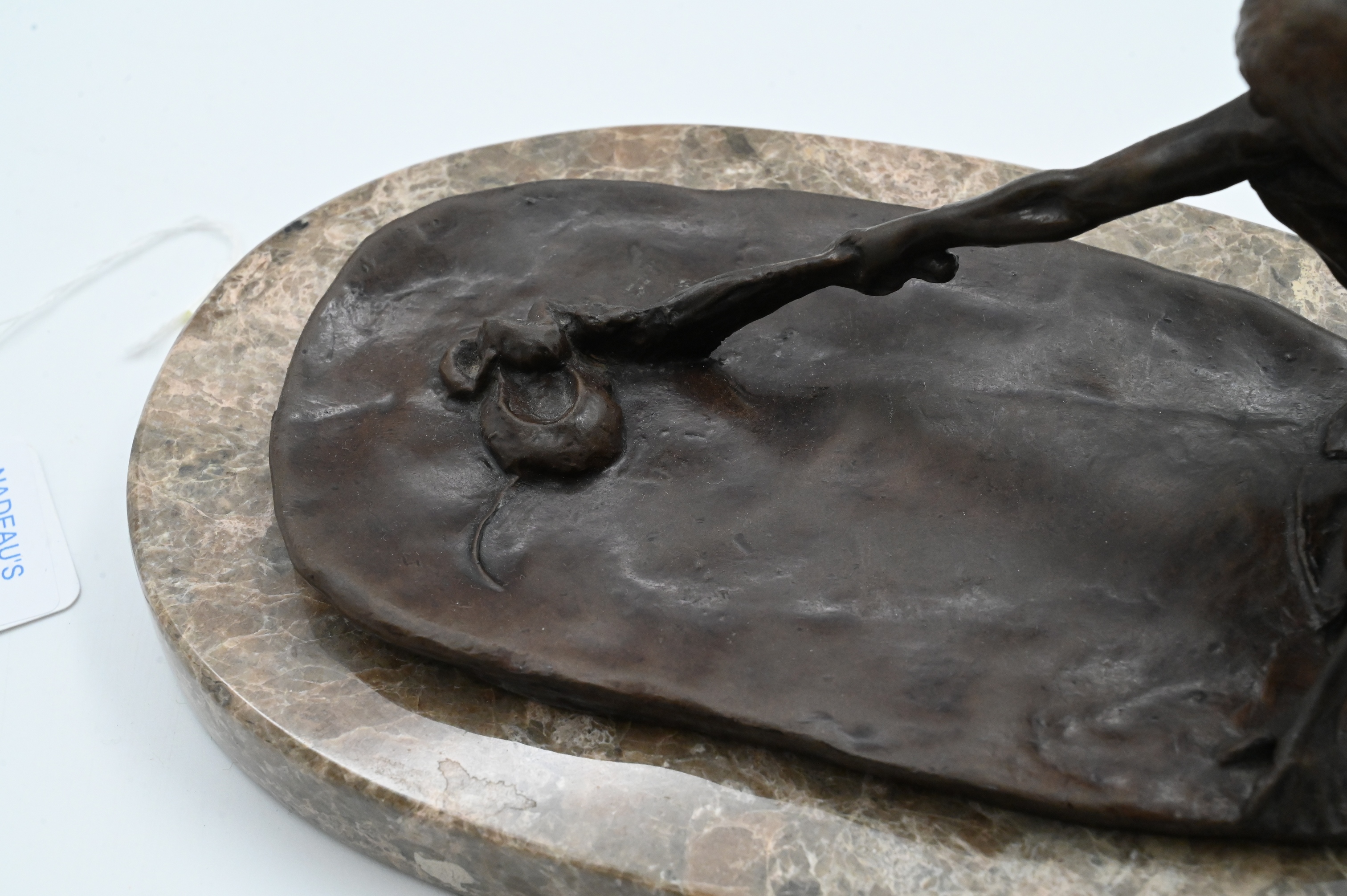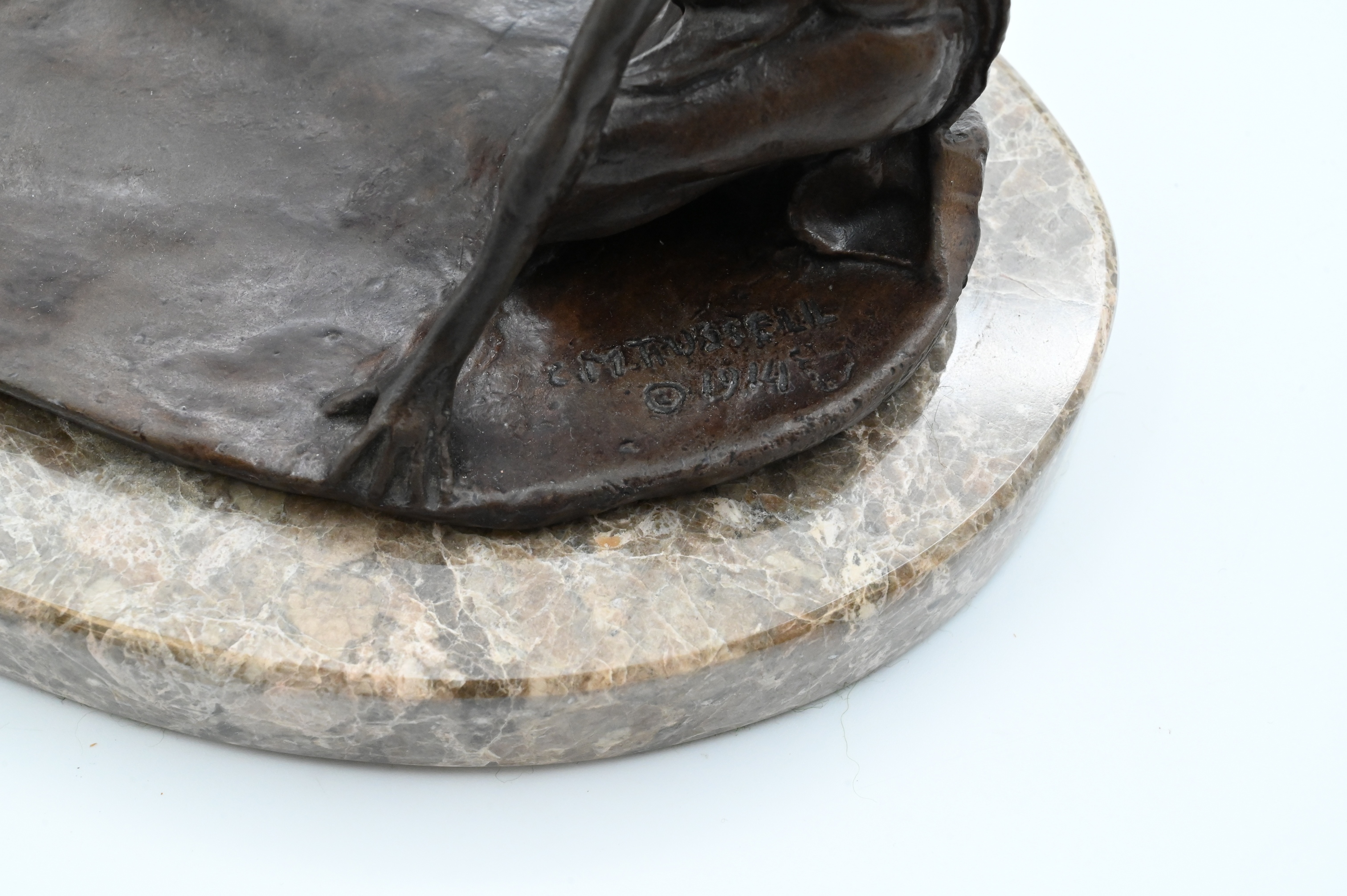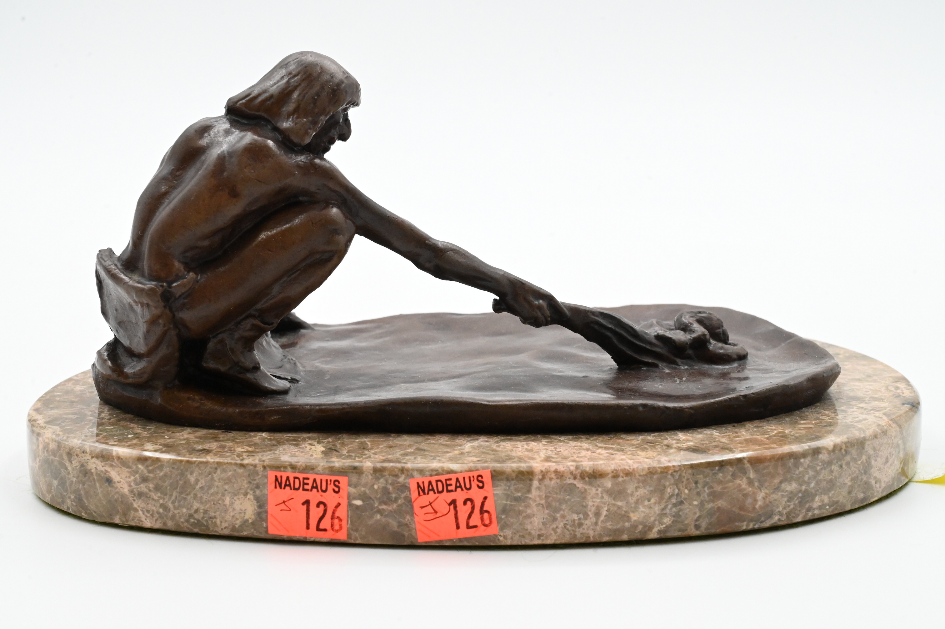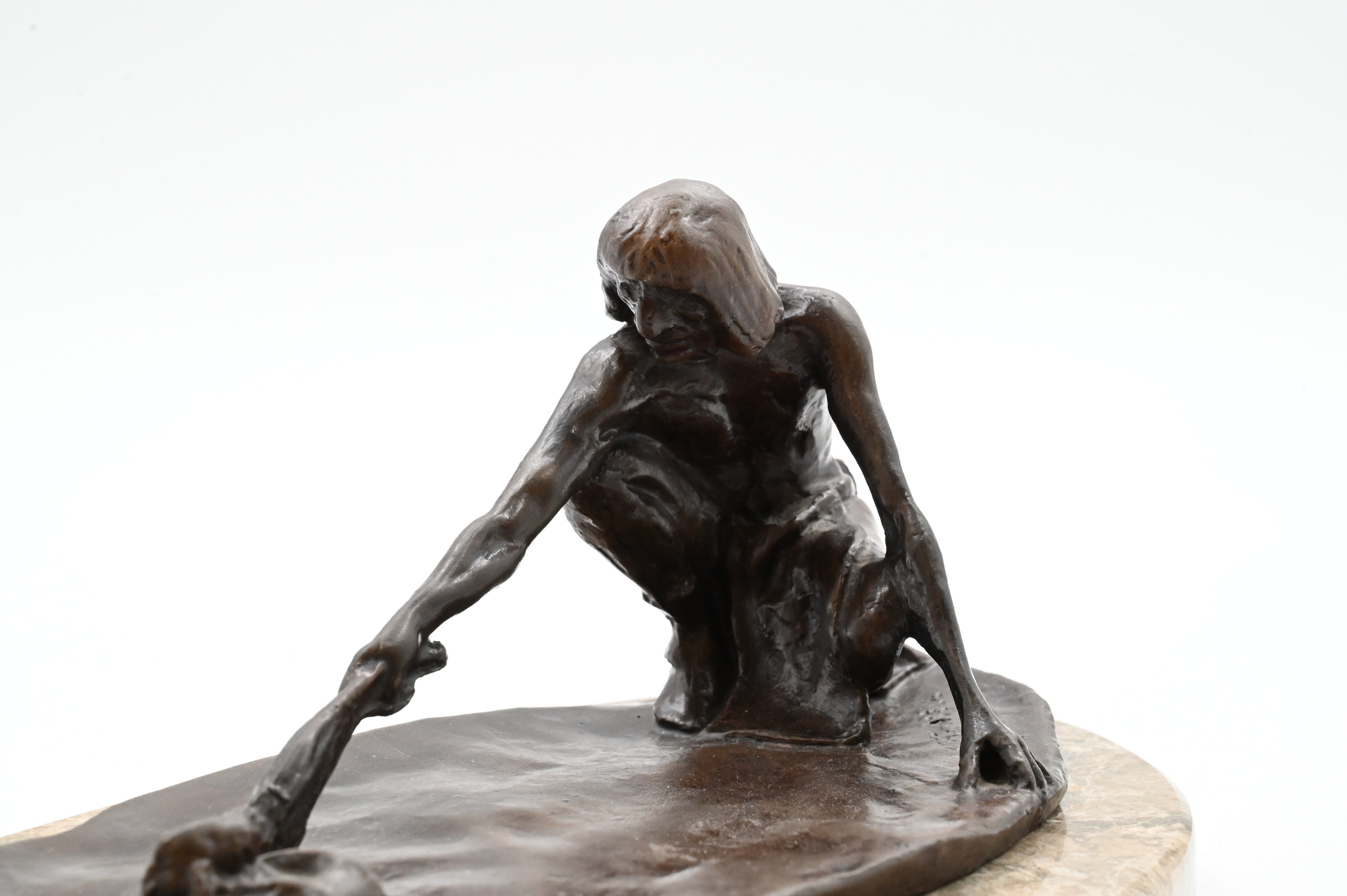 depicting a crouching Native American snake priest engaged in a ritual moment, extending a staff toward a coiled snake. Modeled with Russell’s characteristic narrative tension and expressive anatomical detail, with finely textured surfaces throughout. Mounted on a polished oval marble plinth